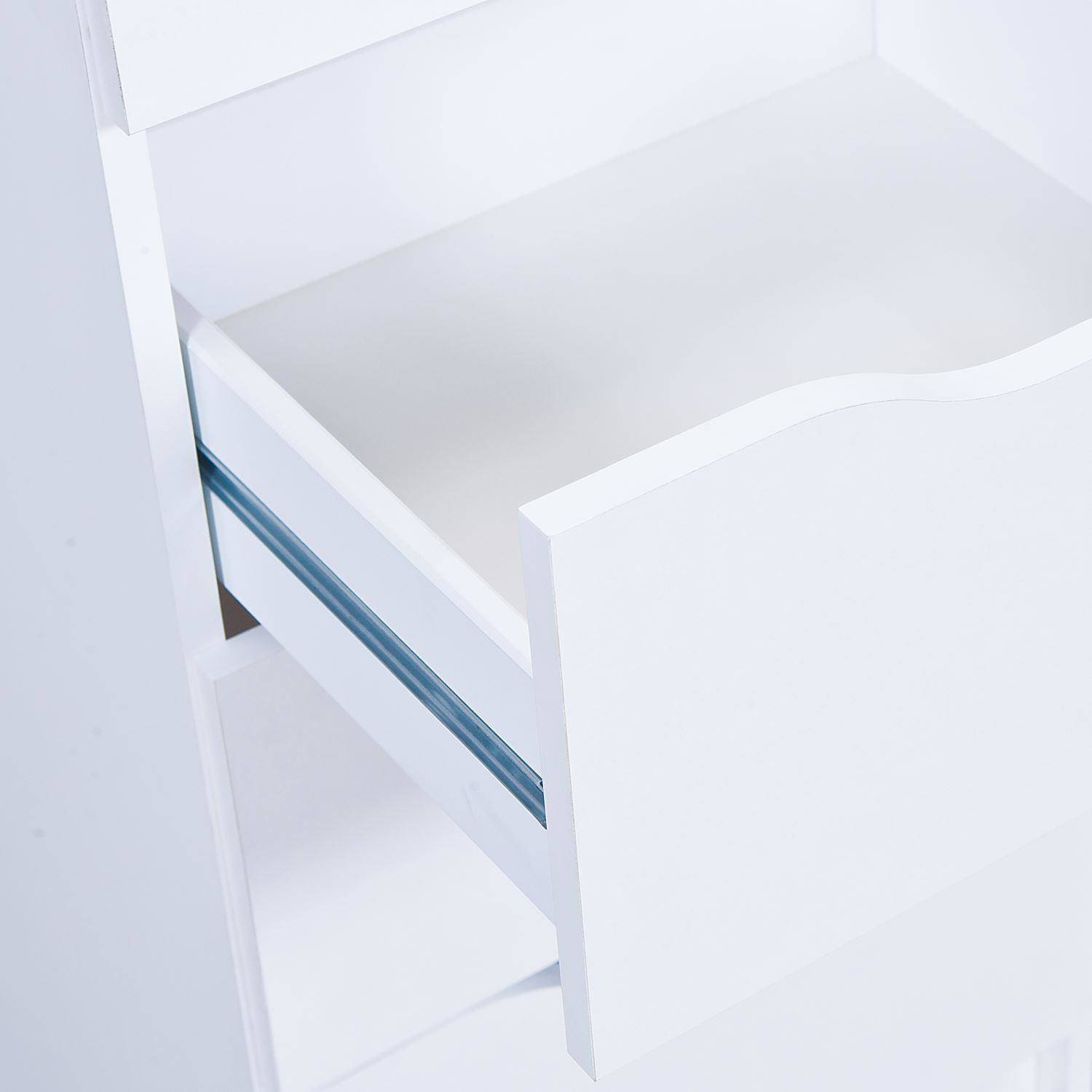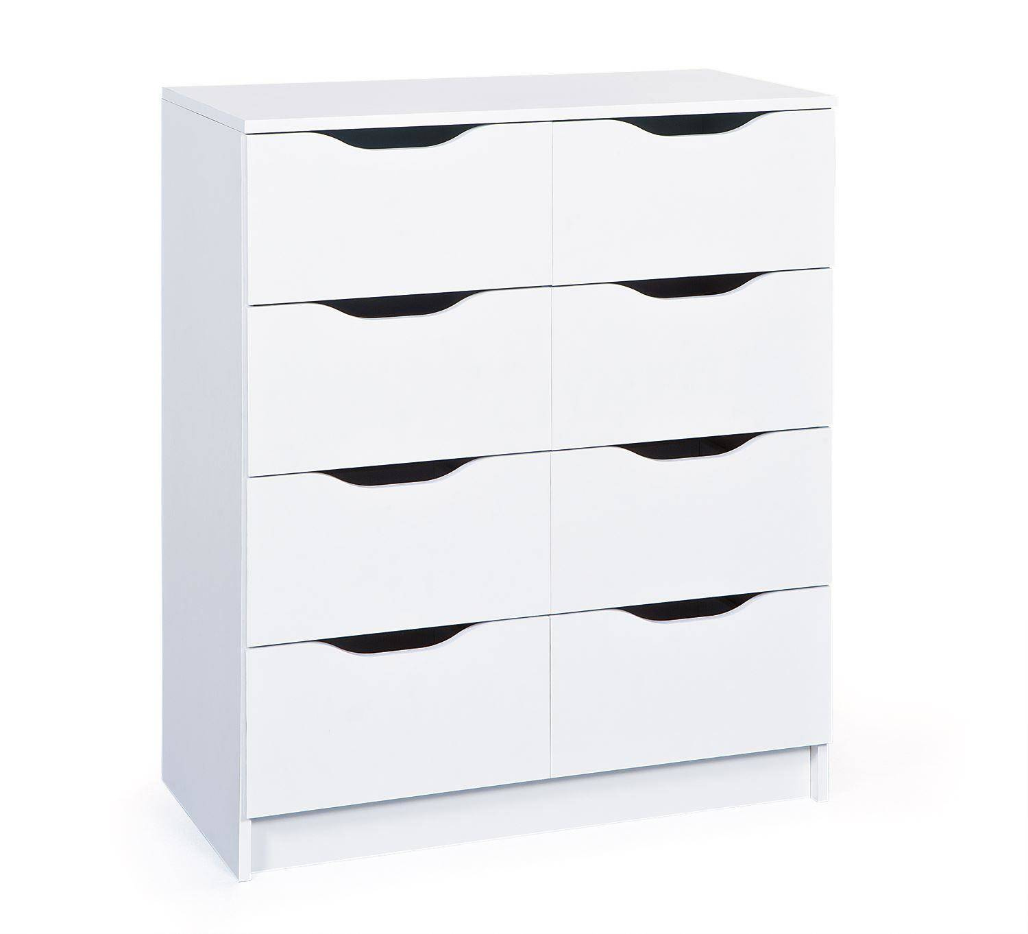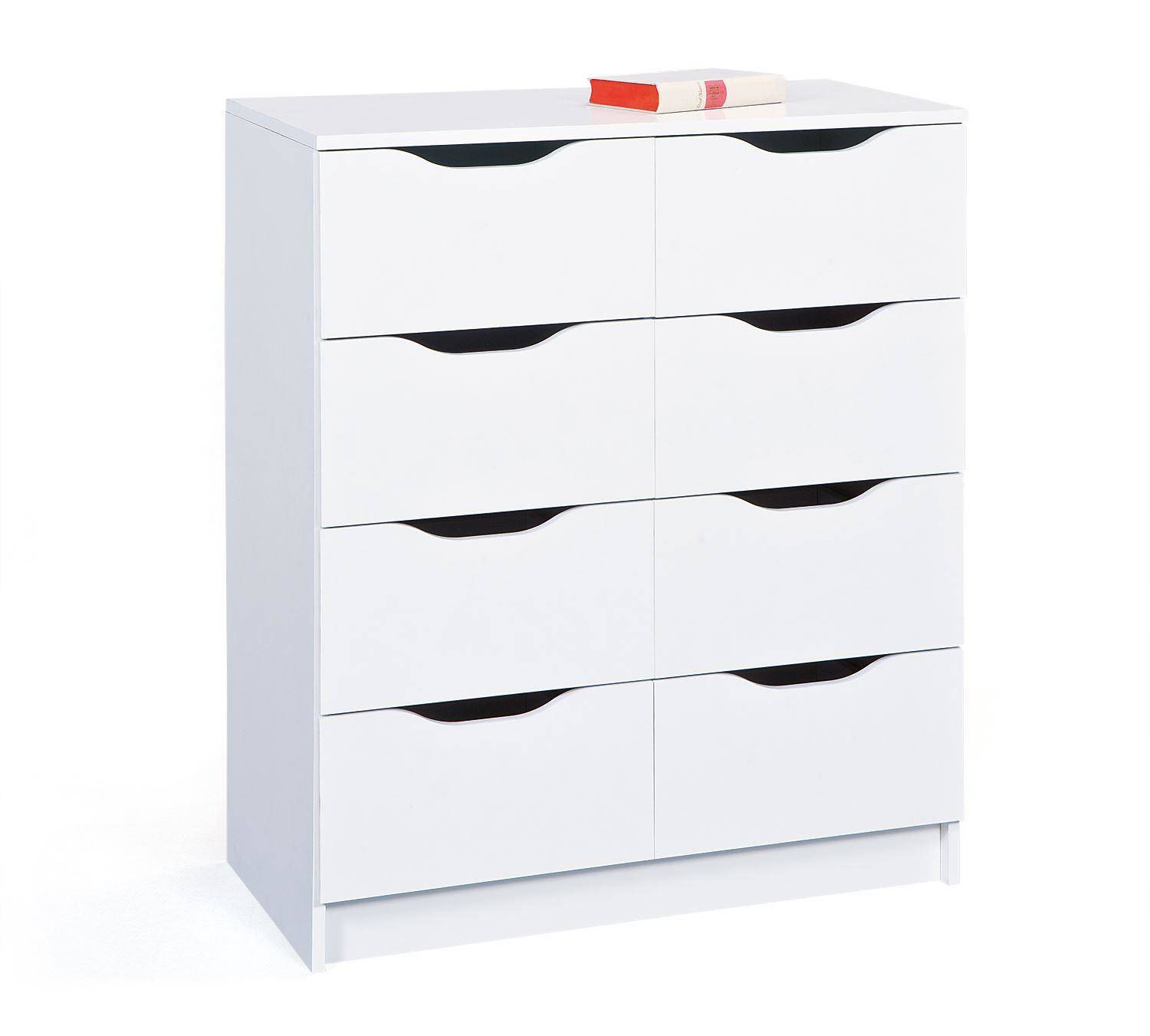 - Komoda o szerokości 82 cm z 8 szufladami na łatwych do prowadzenia metalowych prowadnicach wykonana z drewna w kolorze białym. Otwieranie szuflad ułatwiają praktyczne uchwyty wpuszczone w ich przednią część.