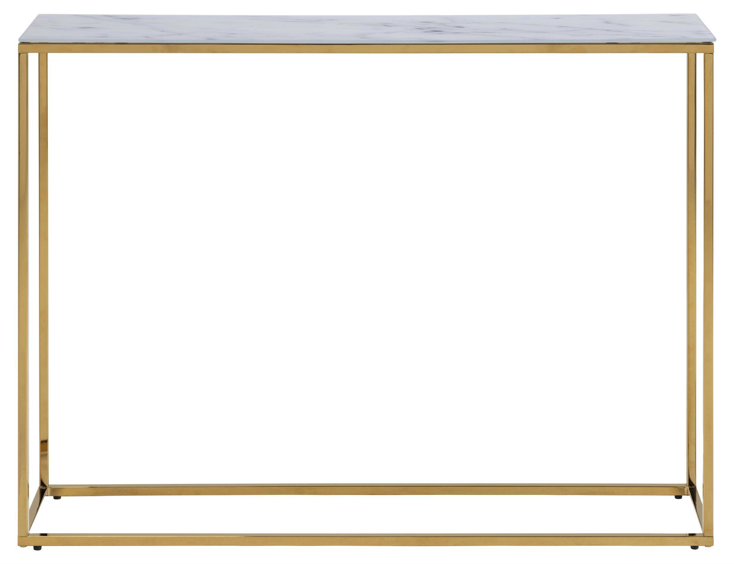 Konsola Alisma, blat szklany kryształowy, matowy biały nadruk marmurowy, podstawa metalowa 6 mm, złoty chrom, dł:110 szer:26 wys:80,5 cm