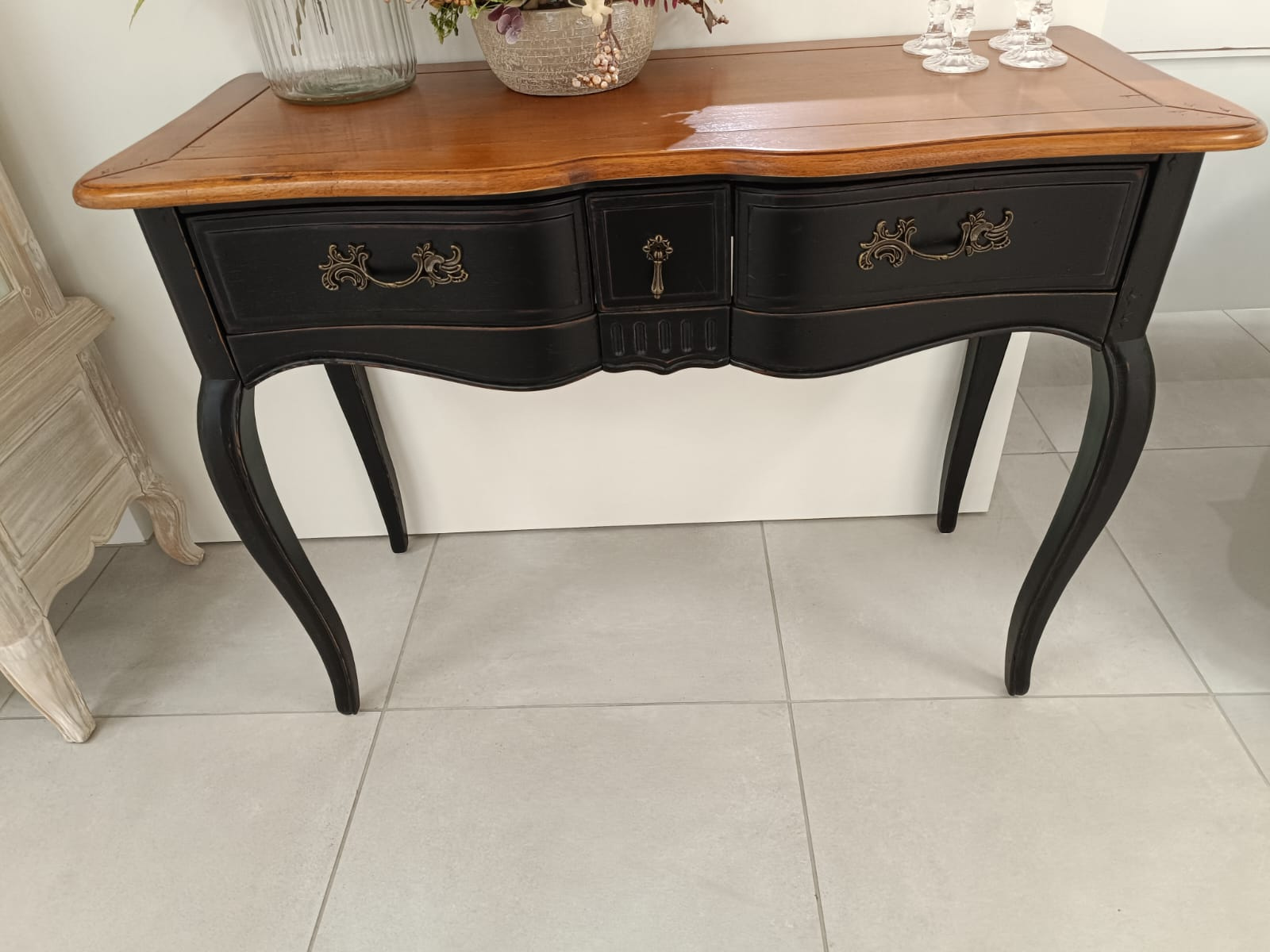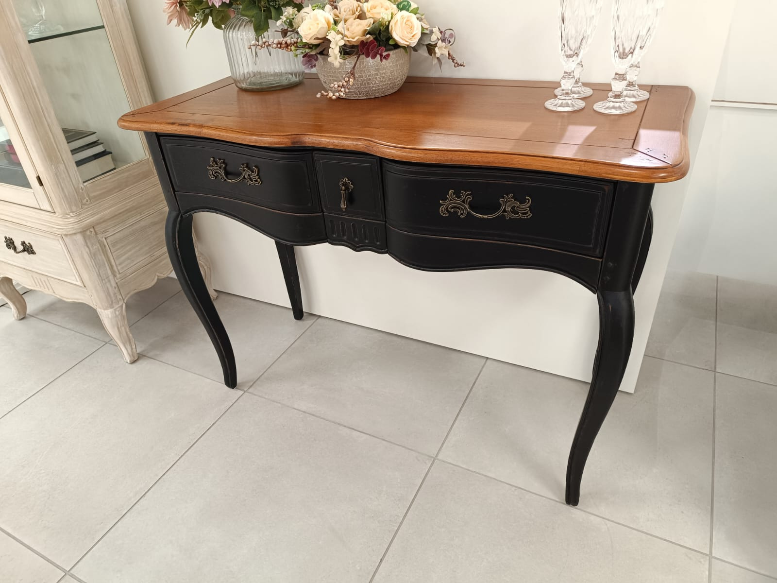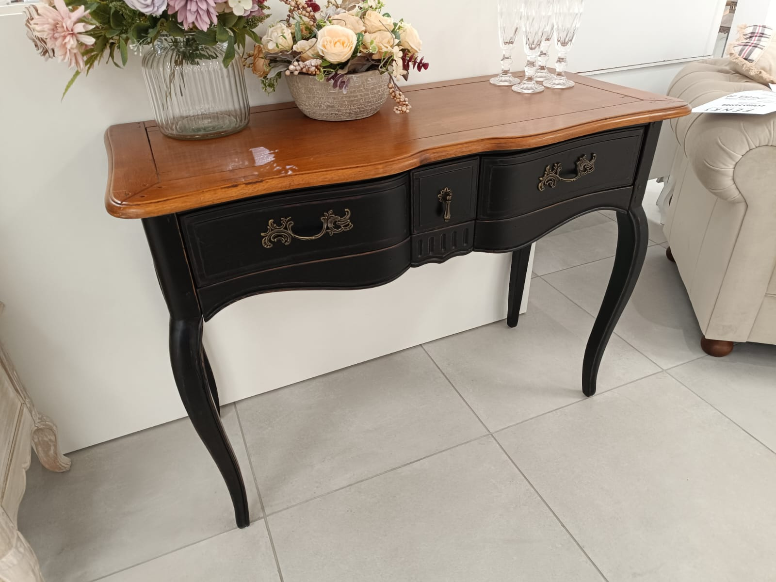 - Konsola o szerokości 110 cm z dwiema pojemnymi szufladami po bokach i jedną małą w środku z drewna brzozowego w kolorze czarnym i blatem w kolorze drewna. Gięte nóżki i metalowe uchwyty. Styl prowansalski, francuski.
