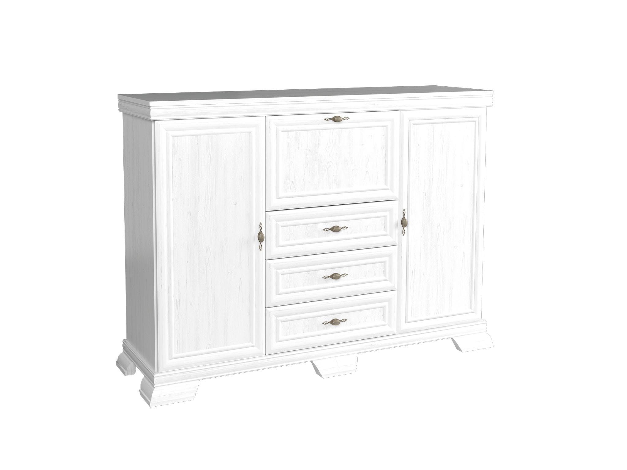 Elegancka wysoka komoda Kora z barkiem, dwiema szafkami i trzema szufladami. Dodatki w postaci ozdobnych uchwytów, szykownych nóżek w połączeniu z naturalną kolorystyką nadają klasy i charakteru każdej aranżacji.