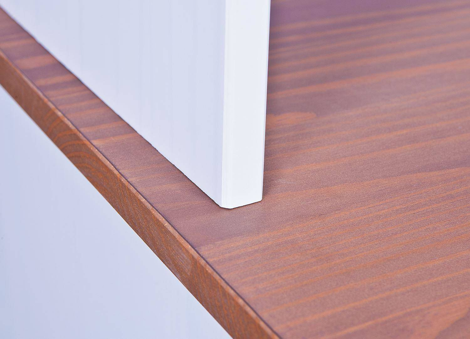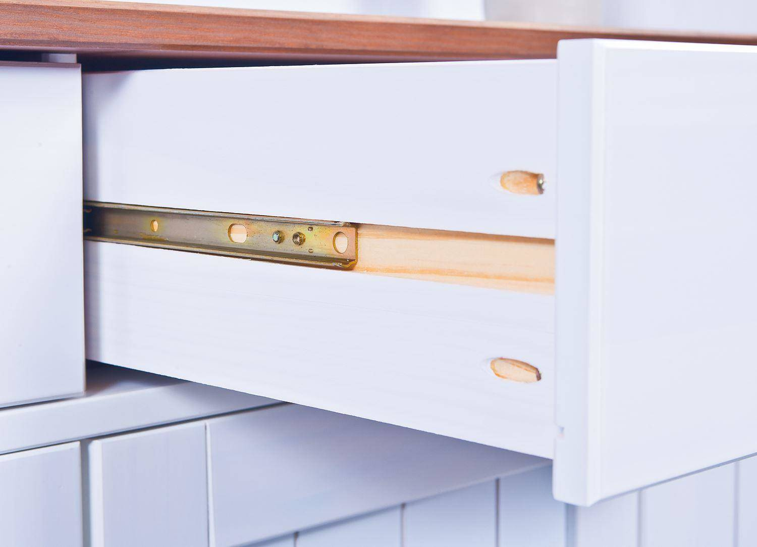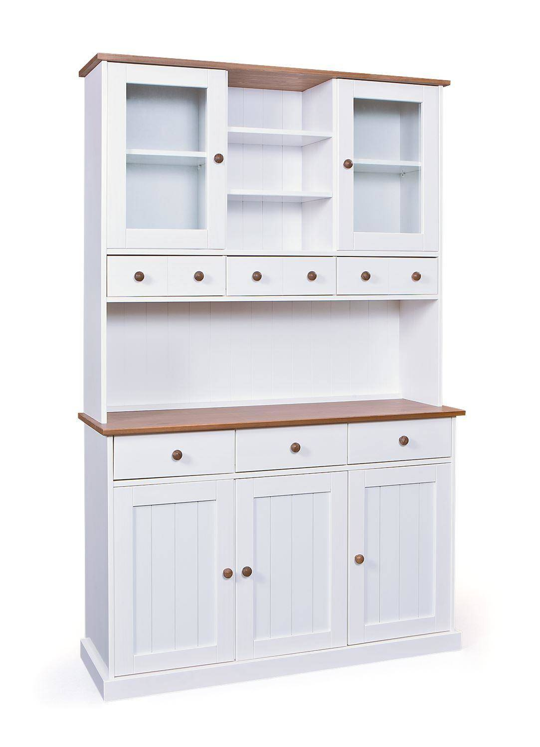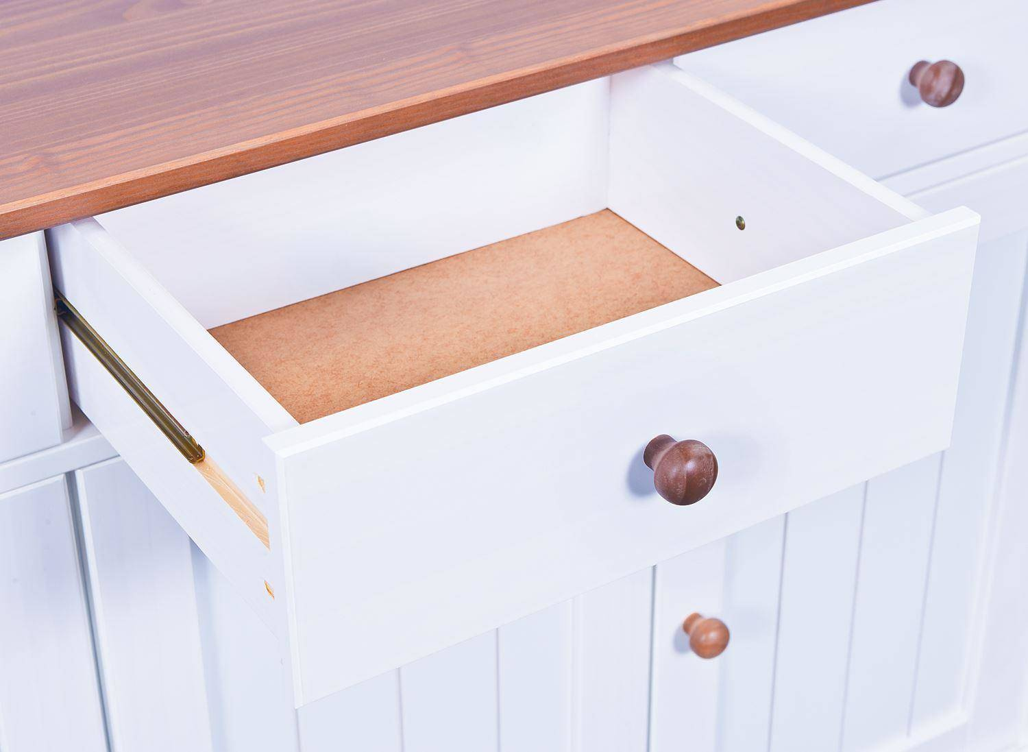- Kredens z drewna sosnowego z frontami z bezpiecznego szkła ma 6 szuflad na gładko działających metalowych prowadnicach i 4 półki za pięciorgiem drzwiczek. Kolorystyka bieli oraz naturalnego drewna wpisuje się w styl nowoczesny, skandynawski.