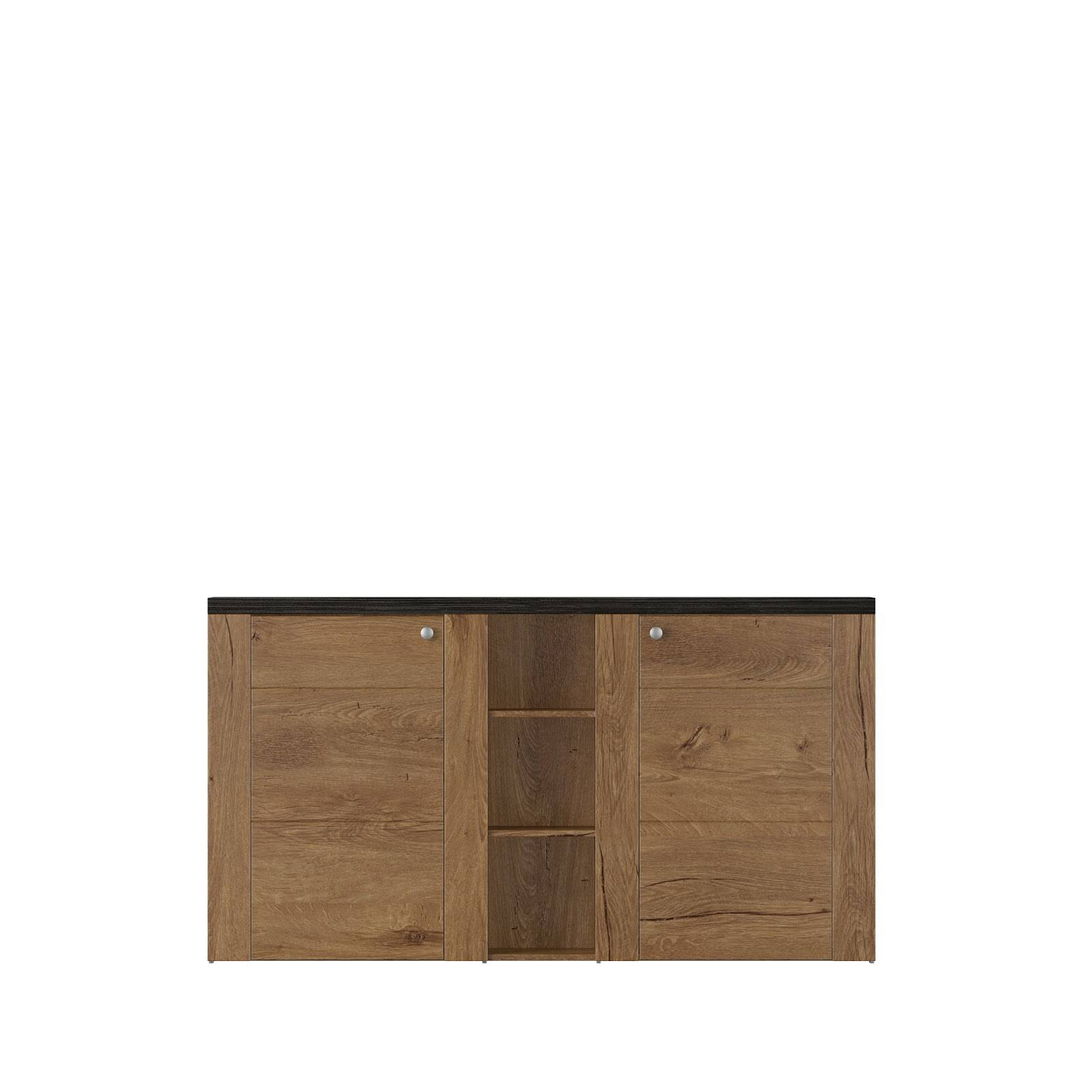 Komoda o szerokości 155 cm, wysokości 85 cm i głębokości 37 cm dostarcza znakomitą przestrzeń do przechowywania dzięki dwóm przestronnym drzwiom i czterem półkom umieszczonym w jej wnętrzu. To idealne rozwiązanie do salonu, sypialni czy przedpokoju, gdzie ważna jest organizacja przestrzeni.