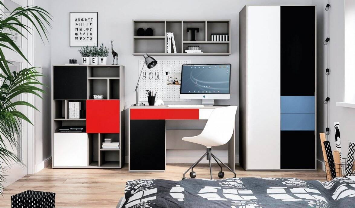 Biurko LASB01B jest dostępne w czterech eleganckich wybarwieniach: subtelny Szary, głęboki Czarny, świeży Biały i odważny Niebieski, dzięki czemu z łatwością dopasujesz je do palety kolorystycznej swojego pokoju. Interesującym zabiegiem stylistycznym jest możliwość wybrania koloru frontu jednej z szuflad, co pozwala na dostosowanie mebla do indywidualnych upodobań, a zarazem ożywia stonowaną kolorystykę całości.