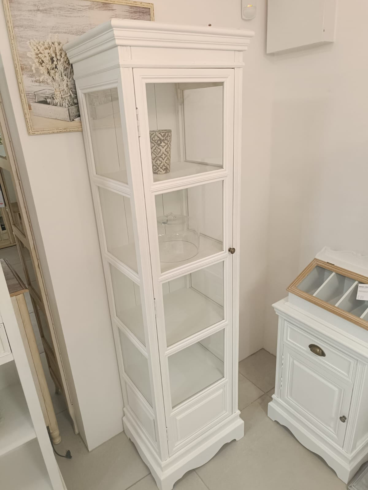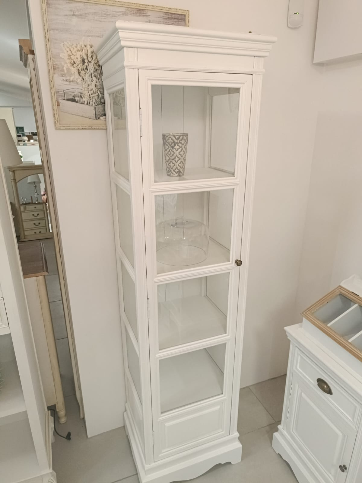 - Elegancka witryna oszklona z trzech stron, pięknie zdobiona w stylu prowansalskim. Biała matowa z uchwytami w kolorze starego mosiądzu.