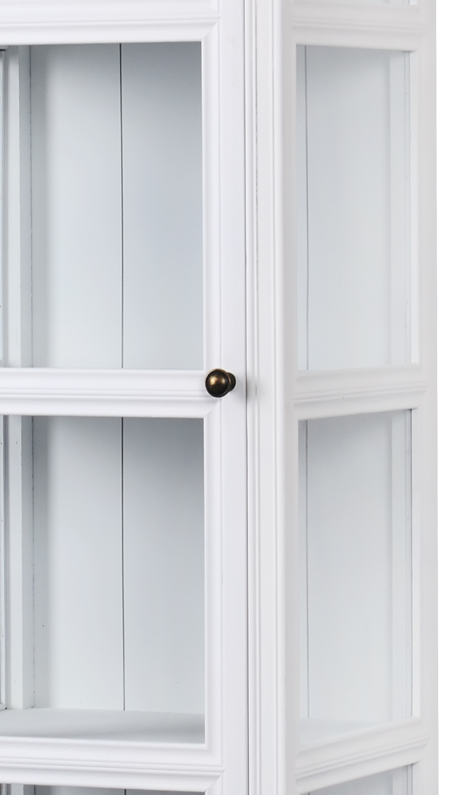 Witryna biała Latina 04 jest biała i matowa, dzięki czemu wygląda bardzo wytwornie. Uchwyty w kolorze starego mosiądzu pięknie kontrastują i dodają charakteru. Witryna jest oszklona z trzech stron, więc można wyeksponować dekoracyjne przedmioty, np. rzeźby, figurki czy urokliwą porcelanę. Mebel ma piękne zdobienia w stylu prowansalskim. Wspaniale prezentuje się w towarzystwie innych mebli z serii Latina, ale równie wspaniale wygląda samodzielnie.