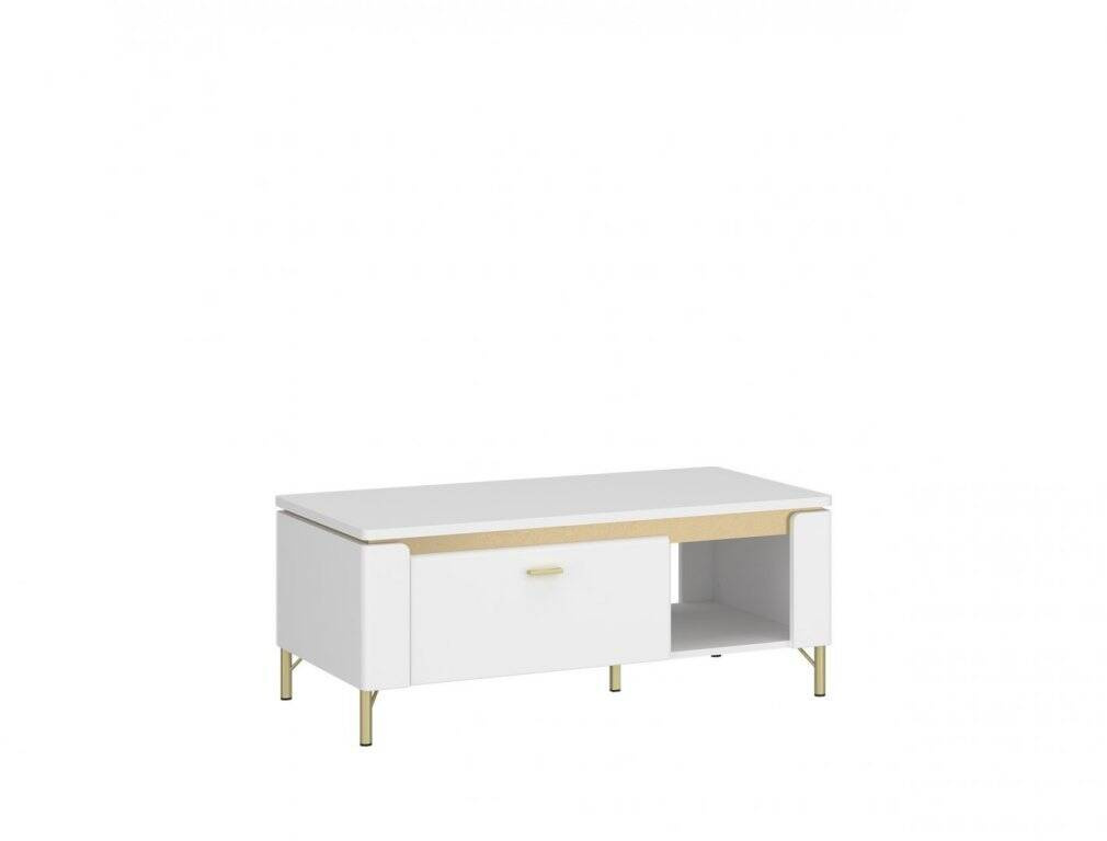 - Elegancki stolik kawowy Lazio LAZT01, idealny do salonu i jadalni. Wykonany z laminowanej płyty wiórowej i MDF, z pojemną szufladą na kulkowych prowadnicach. Białe wykończenie z połyskiem oraz złote detale i metalowe nóżki nadają mu luksusowy charakter.