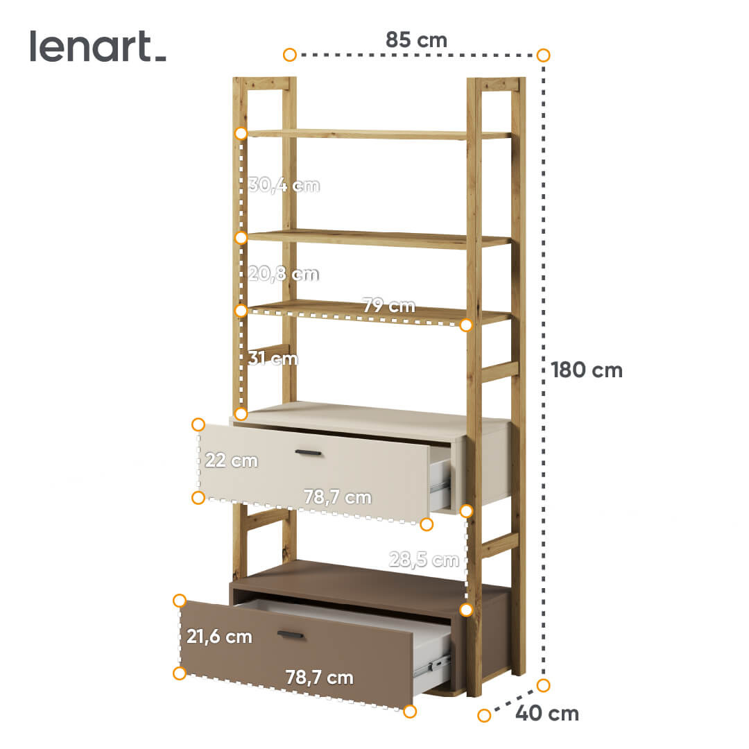 Regał LENNY LY-02 został wyposażony w pięć przestronnych półek i dwie funkcjonalne szuflady z uchwytami PVC, wygodnymi w użyciu dzięki prowadnicom kulkowym. Korpus wykonany z 16-mm płyty wiórowej laminowanej, z wykończeniem krawędzi o grubości 0,45mm, gwarantuje stabilność i długotrwałość użytkowania. Odcienie dębu artisan oraz beżowe i truflowe fronty, składają się na harmonijną całość, którą cechuje szczególna dbałość o detale i wykończenie.