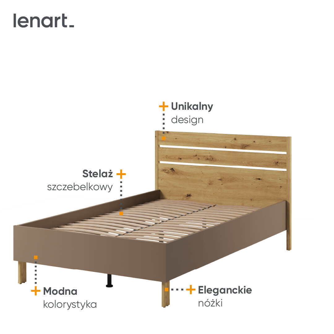 Poznaj LENNY LY-08 – łóżko 120 ze stelażem, które stanie się sercem każdego pokoju młodzieżowego. Nasze łóżko z kolekcji LENNY to połączenie elegancji, komfortu i nowoczesnego designu, które sprosta oczekiwaniom zarówno młodszych, jak i starszych użytkowników. Wyjątkowa kolorystyka dąb artisan, beż i truflowy, dopasuje się do różnorodnych aranżacji, tworząc przytulną atmosferę snu i wypoczynku.