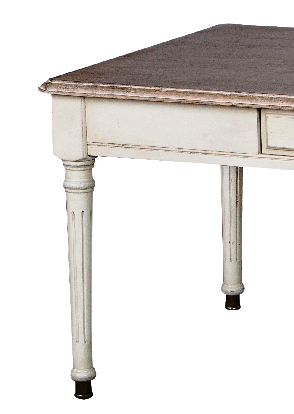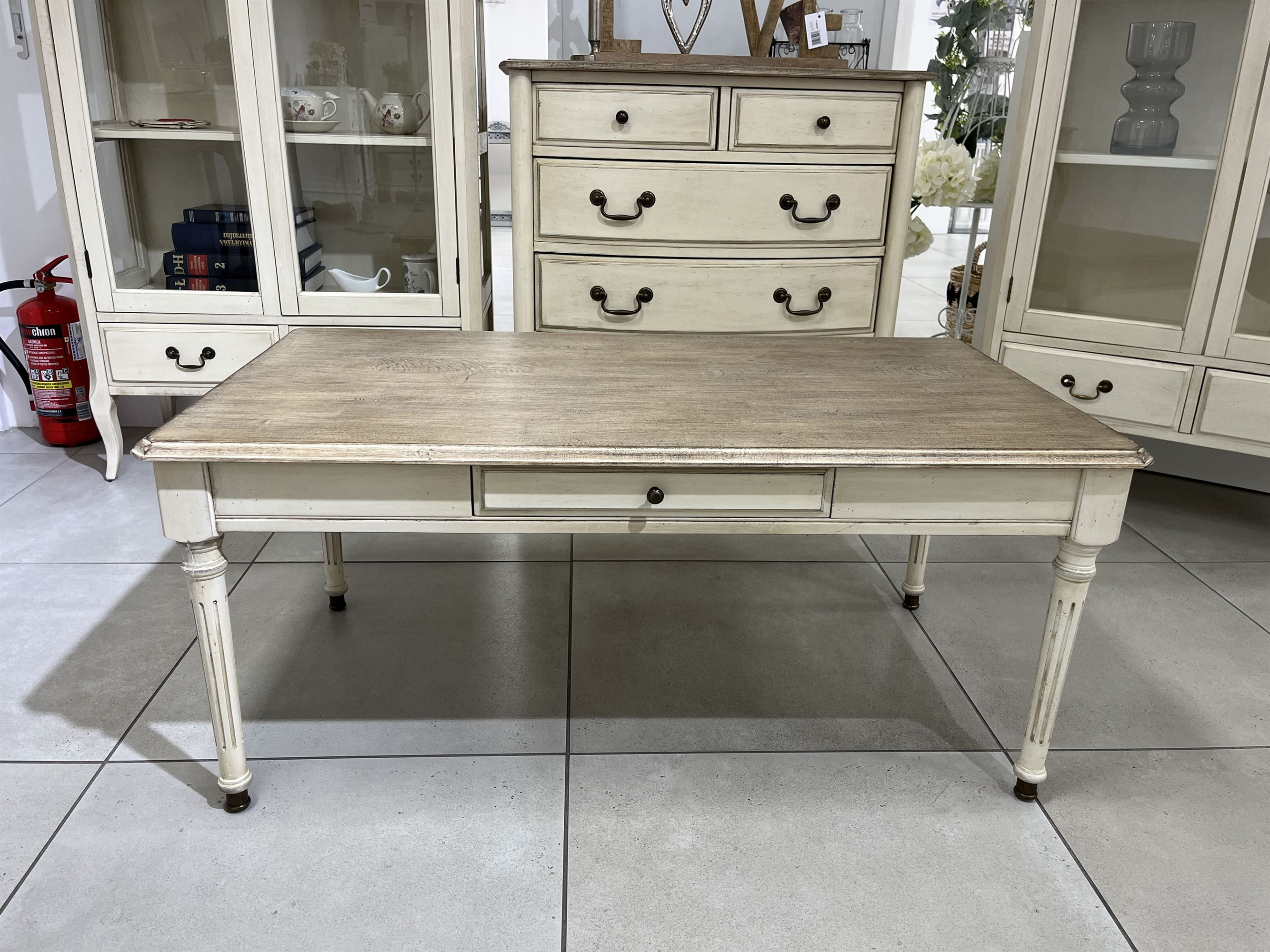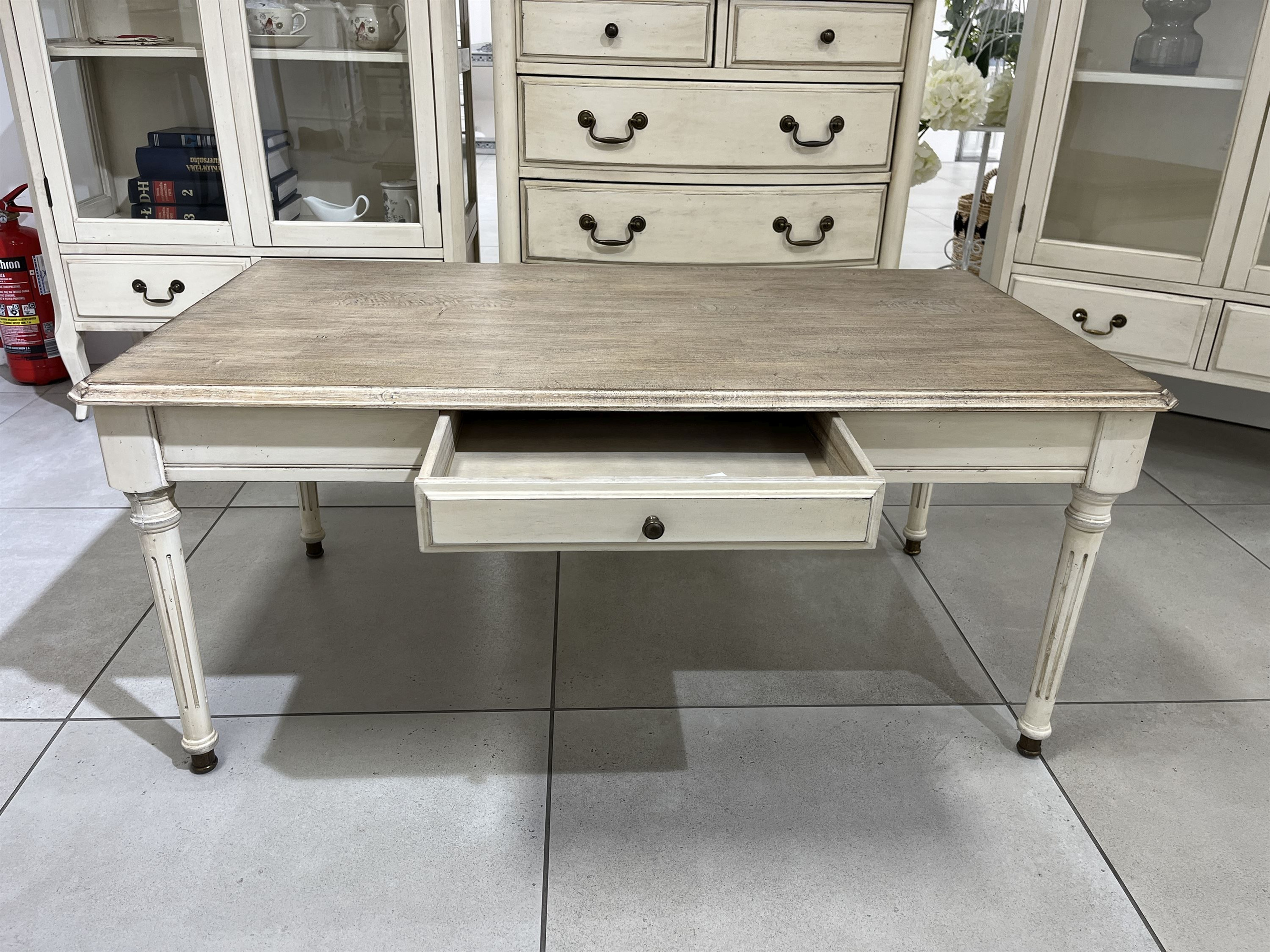 - Ława z jedną szufladą wykonana z drewna w kolorze kości słoniowej, blat jasnobrązowy, metalowy uchwyt. Styl francuski, prowansalski.