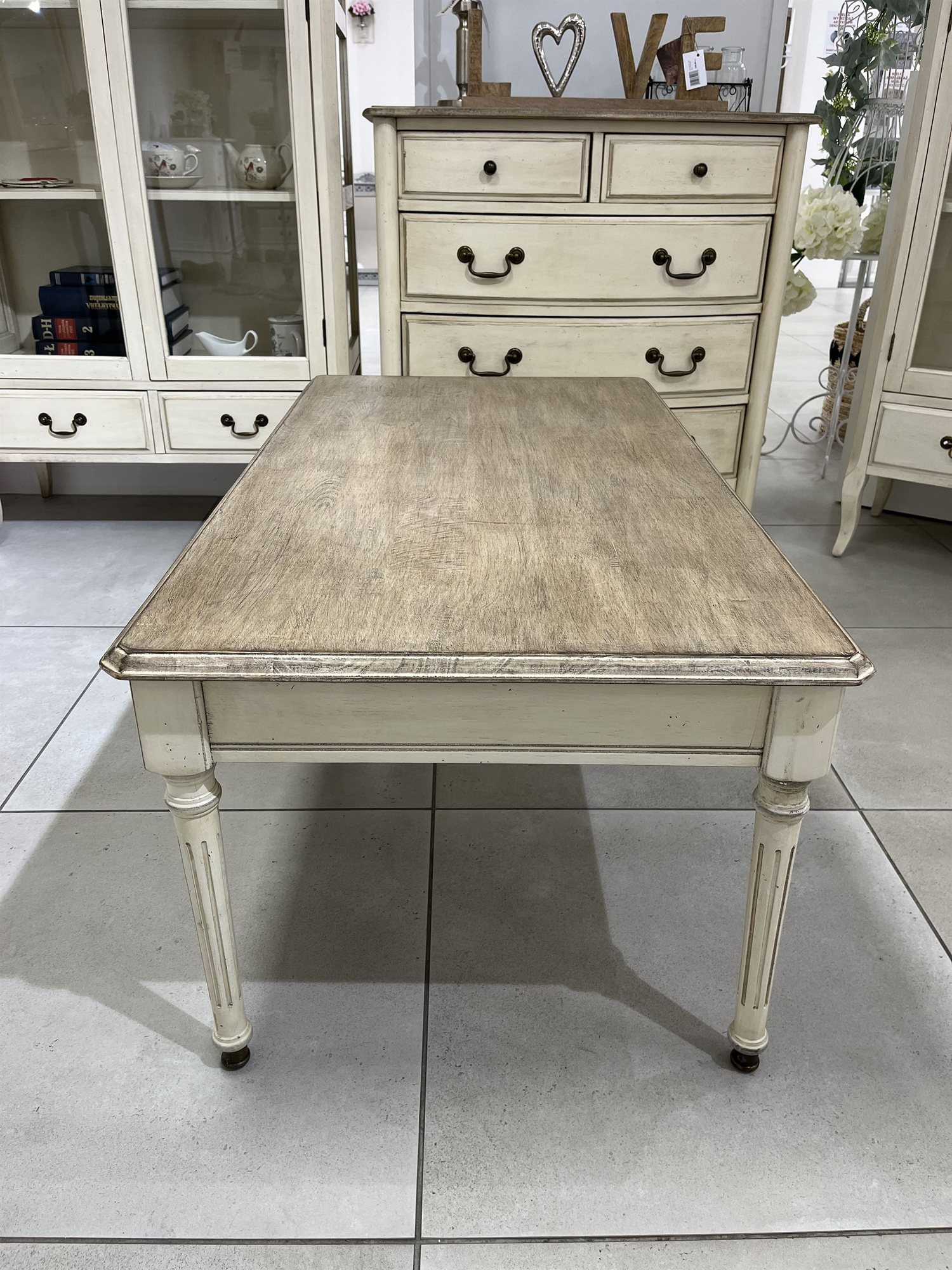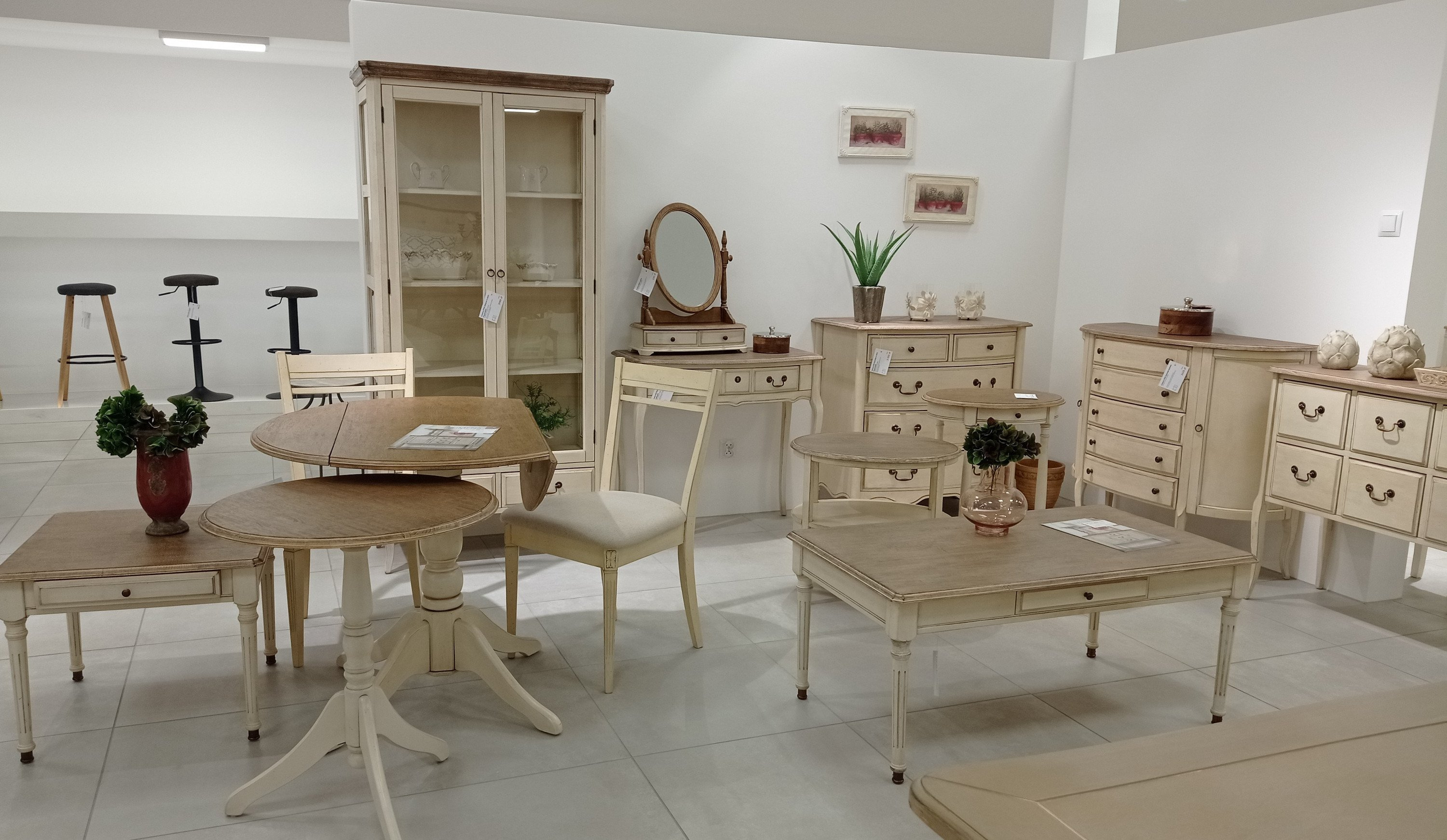 Seria Limena to pięknie wykonane drewniane meble w kolorze kości słoniowej łączonym z jasnym brązem. Klasyczne kształty wzbogacone o efektowne zdobienia tworzą wyjątkowe przedmioty użytkowe.