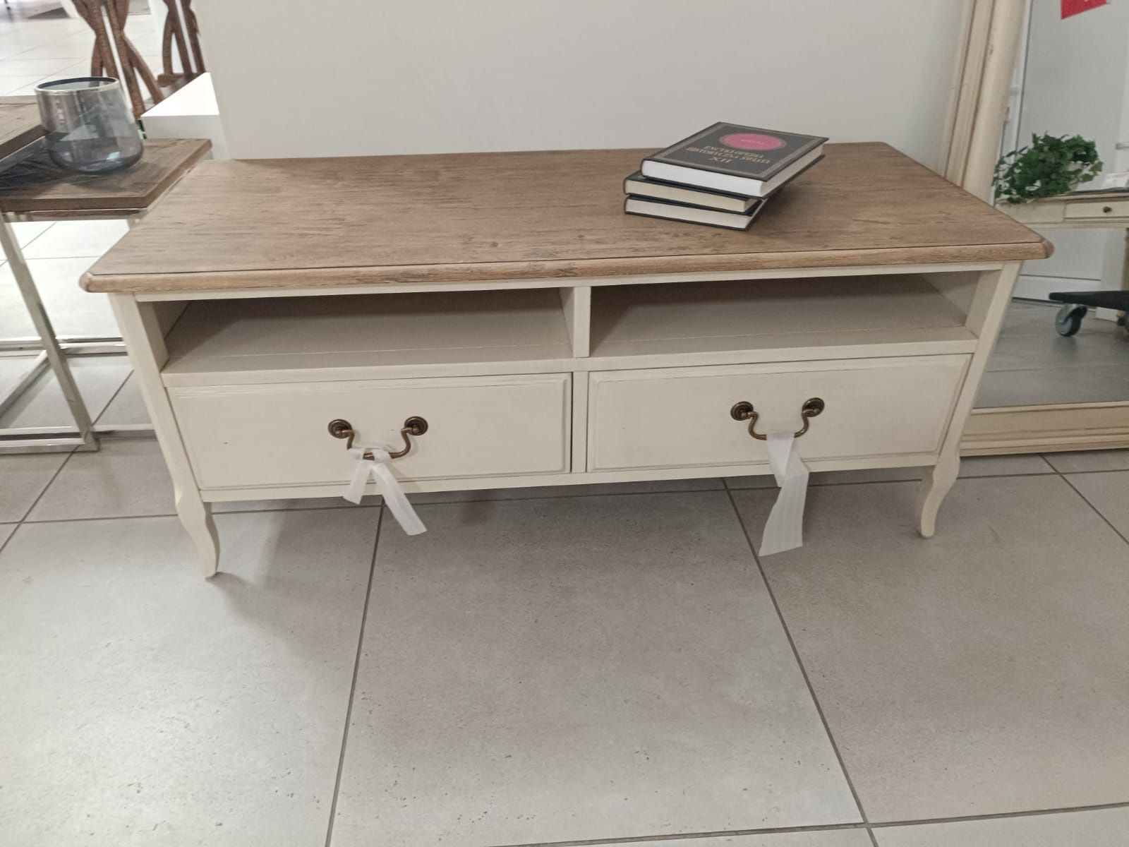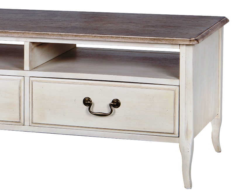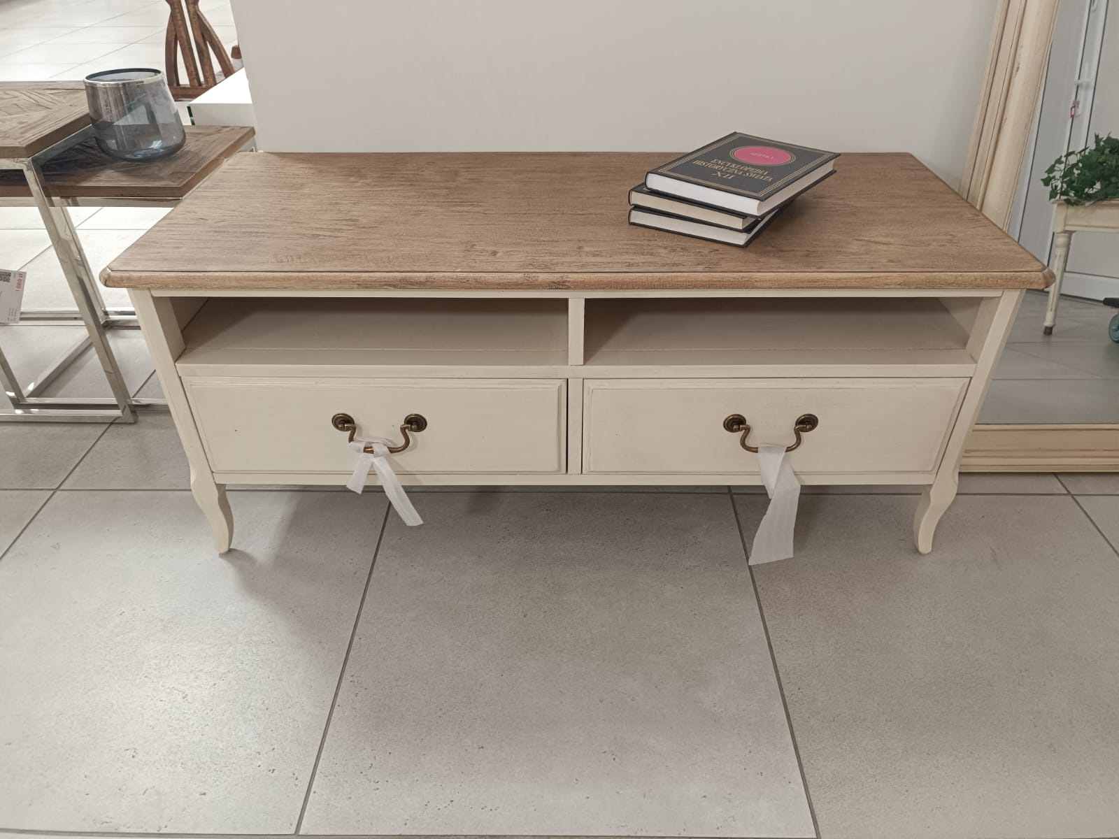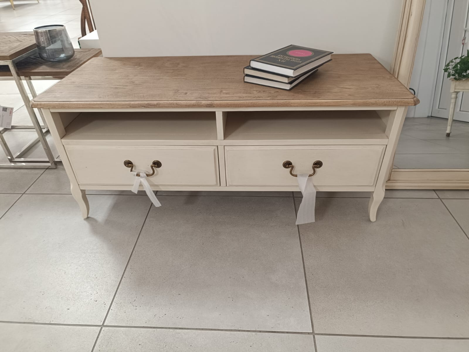 - Komoda RTV z dwiema szufladami i dwiema wnękami na przechowywanie wykonana z drewna w kolorze kości słoniowej, blat jasnobrązowy, metalowe uchwyty. Styl francuski, prowansalski.