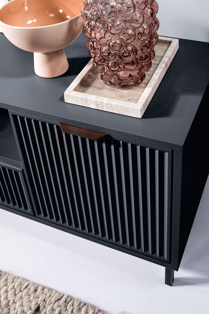 Stabilna konstrukcja witryny opiera się na metalowych nogach w matowym czarnym wykończeniu, co dodaje meblowi lekkości oraz nowoczesności. Dzięki temu, sprzątanie staje się łatwiejsze, a roboty sprzątające z powodzeniem poradzą sobie z przestrzenią pod meblem. Witryna dostępna jest w trzech modnych kolorach: cashmere, indigo i green stone, co pozwala na dopasowanie jej do indywidualnych preferencji.