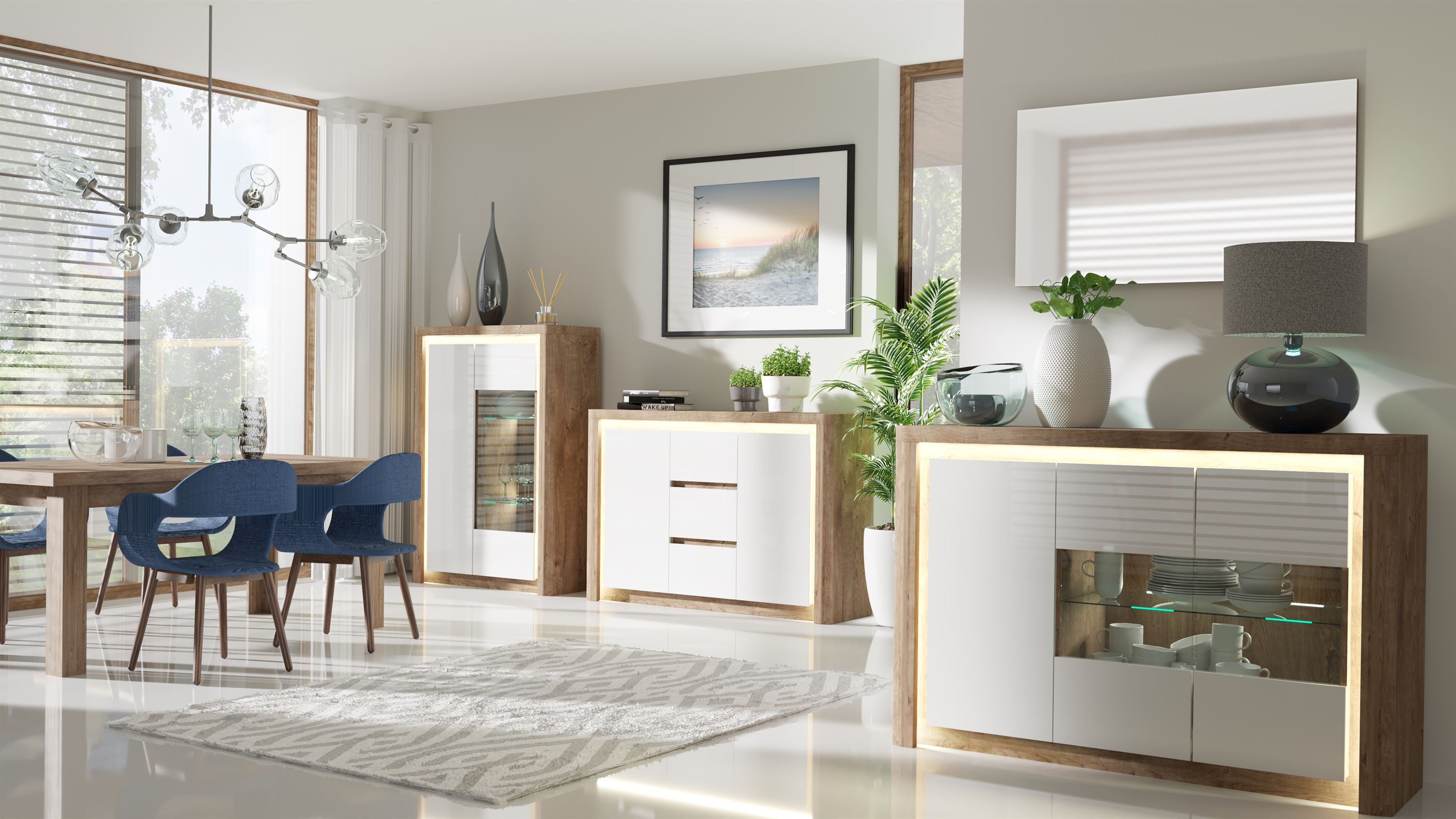 Przedstawiamy komodę LIVINIO-6, która z pewnością stanie się kluczowym elementem każdego nowoczesnego wnętrza. Jej białe fronty w połysku z pewnością przyciągną uwagę, dodając pomieszczeniu elegancji i świeżości. Połączenie z korpusem w kolorze ribbeck sprawia, że mebel ten wyróżnia się na tle innych, stając się nie tylko praktycznym, ale i estetycznym akcentem w Twoim domu.