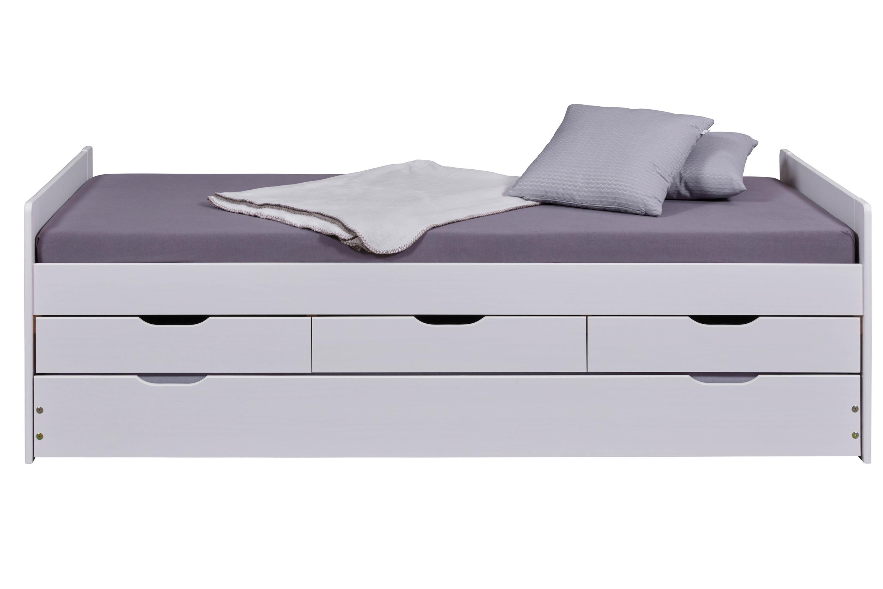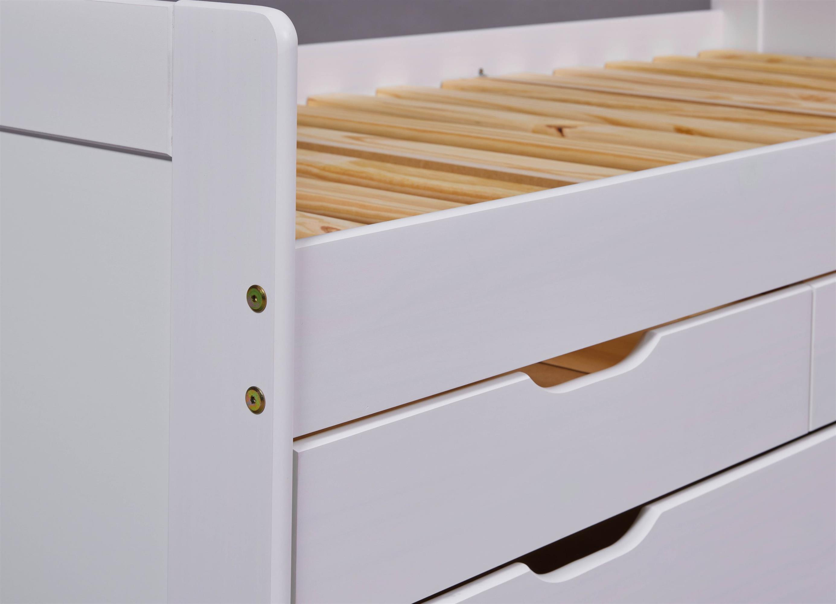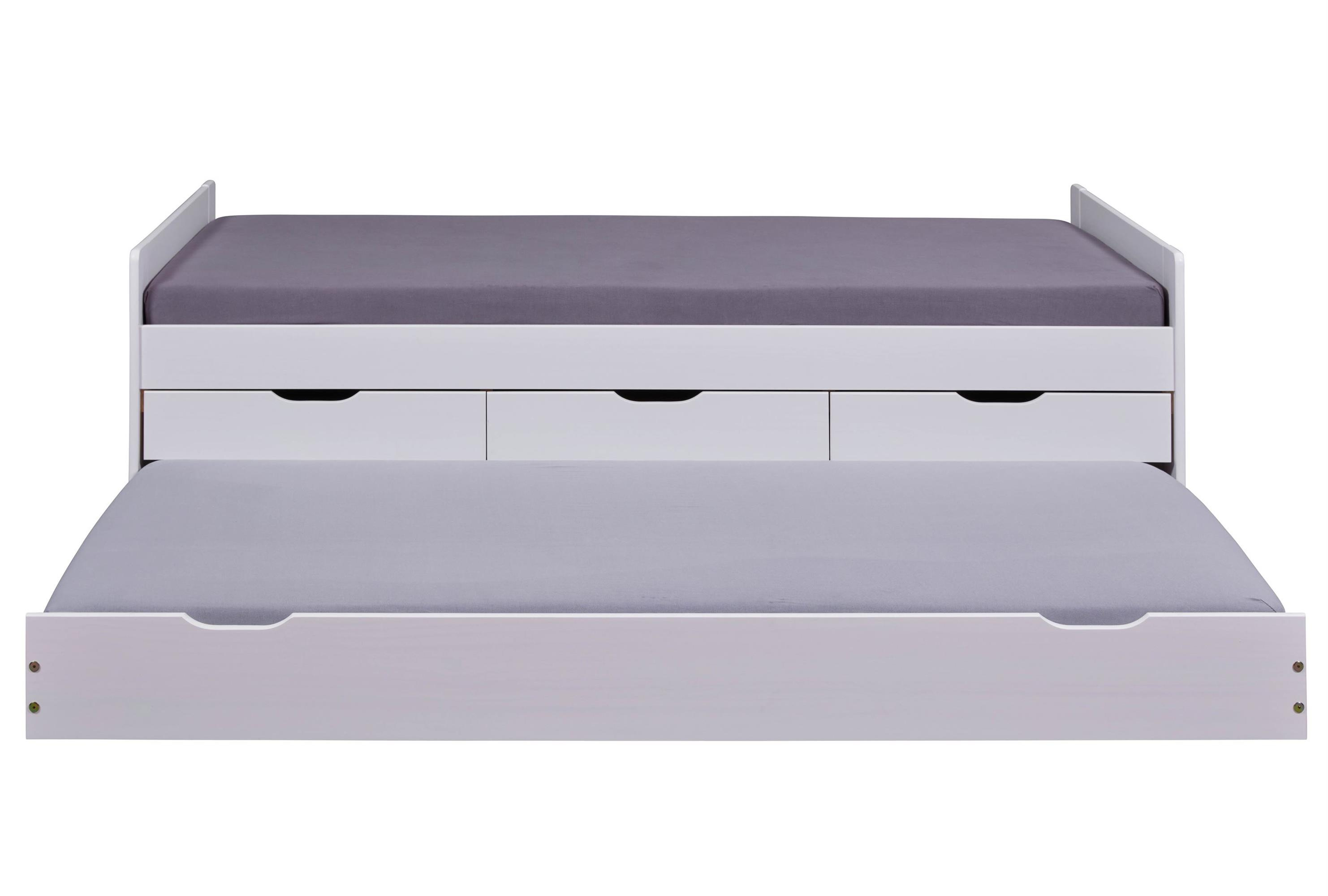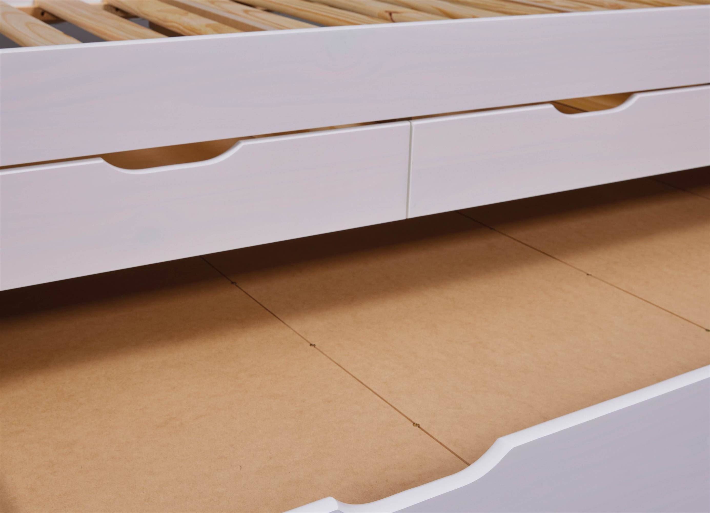 - Łóżko z drewna sosnowego w kolorze białym. Posiada dodatkowe wysuwane miejsce do spania na kółkach oraz trzy pojemne szuflady. Sprzedawane bez stelaża. W komplecie z ramą z listew.