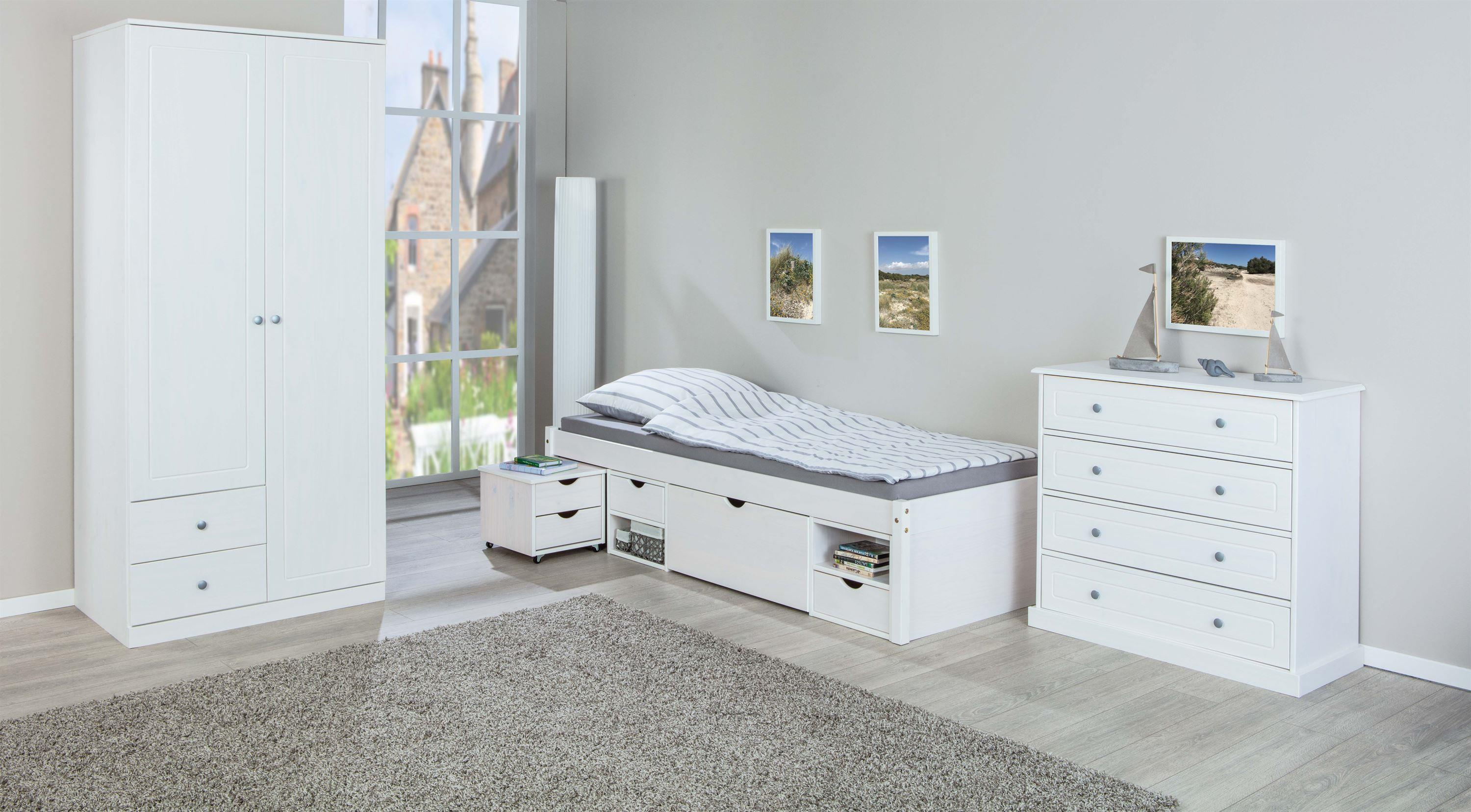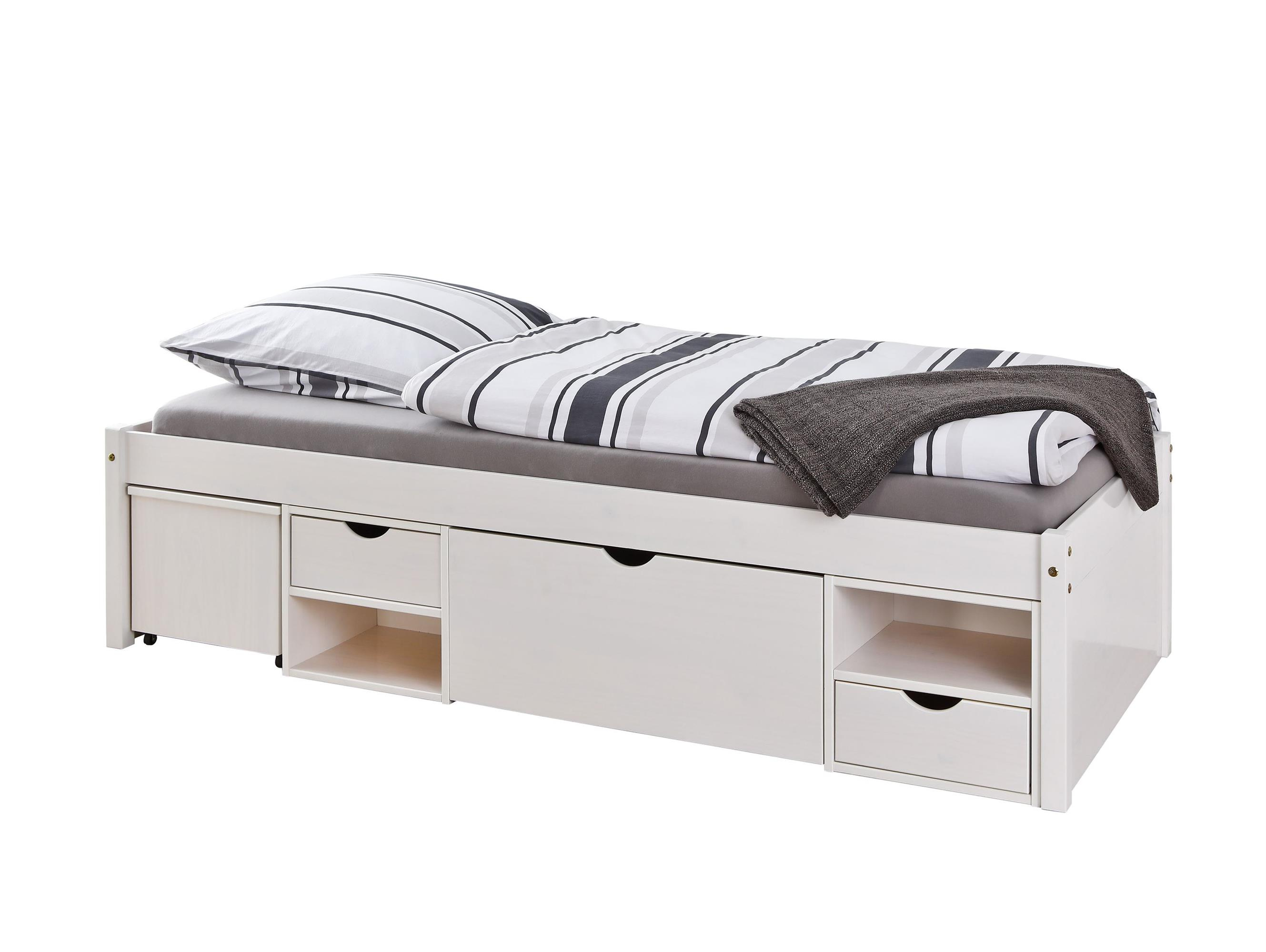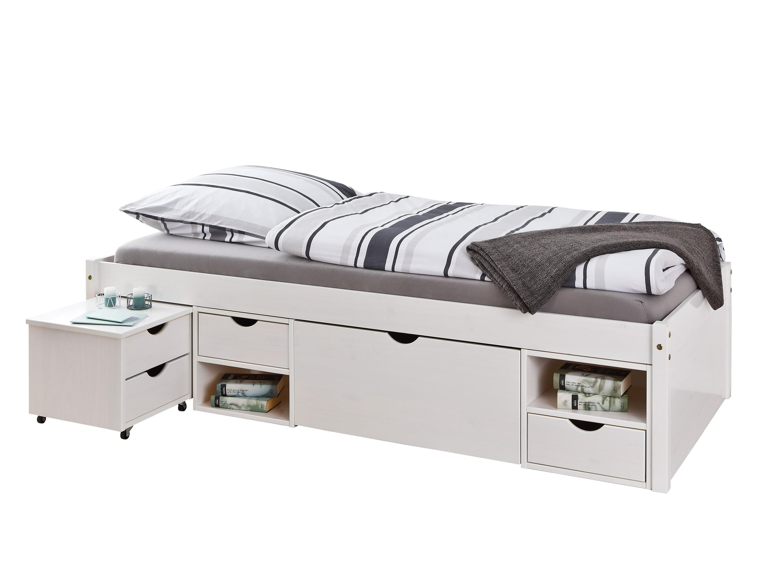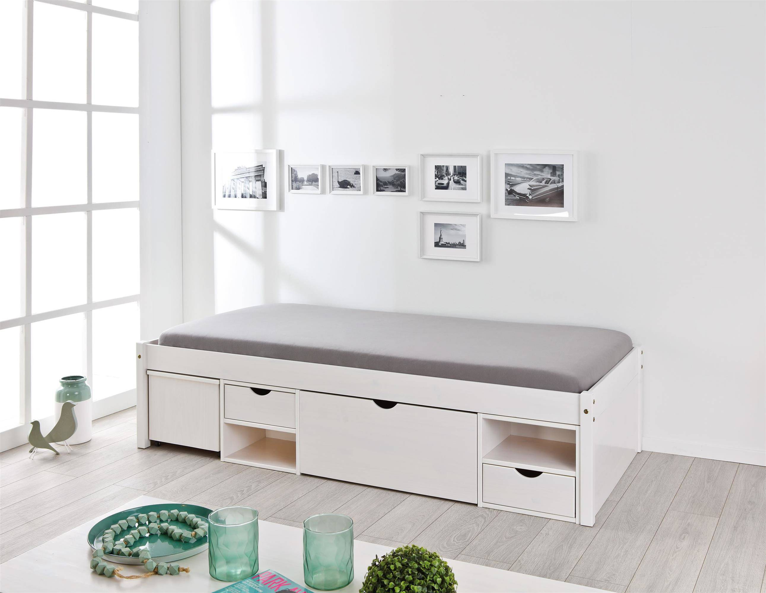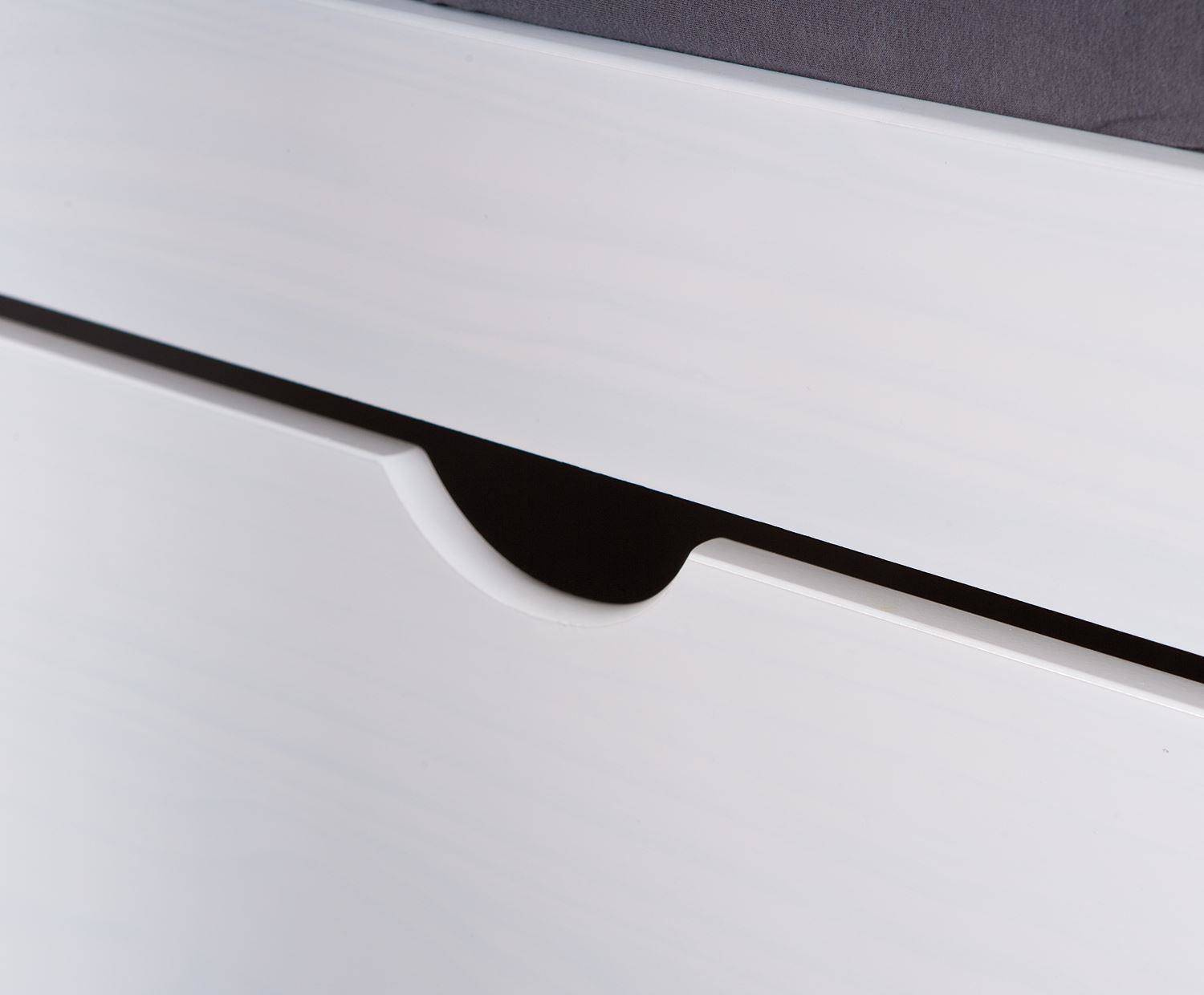 • Łóżko z drewna sosnowego z trzema funkcjonalnymi szufladami. Wodoodporne i łatwe do czyszczenia.