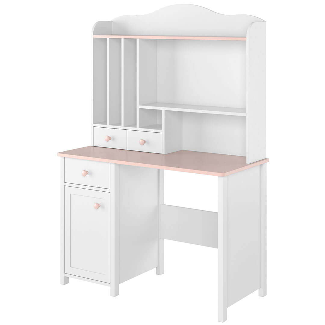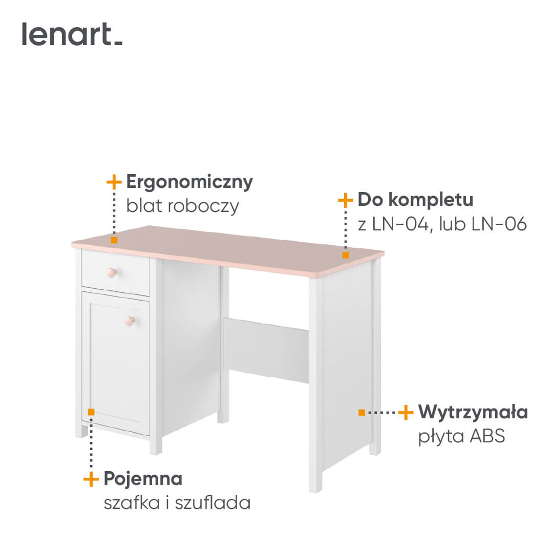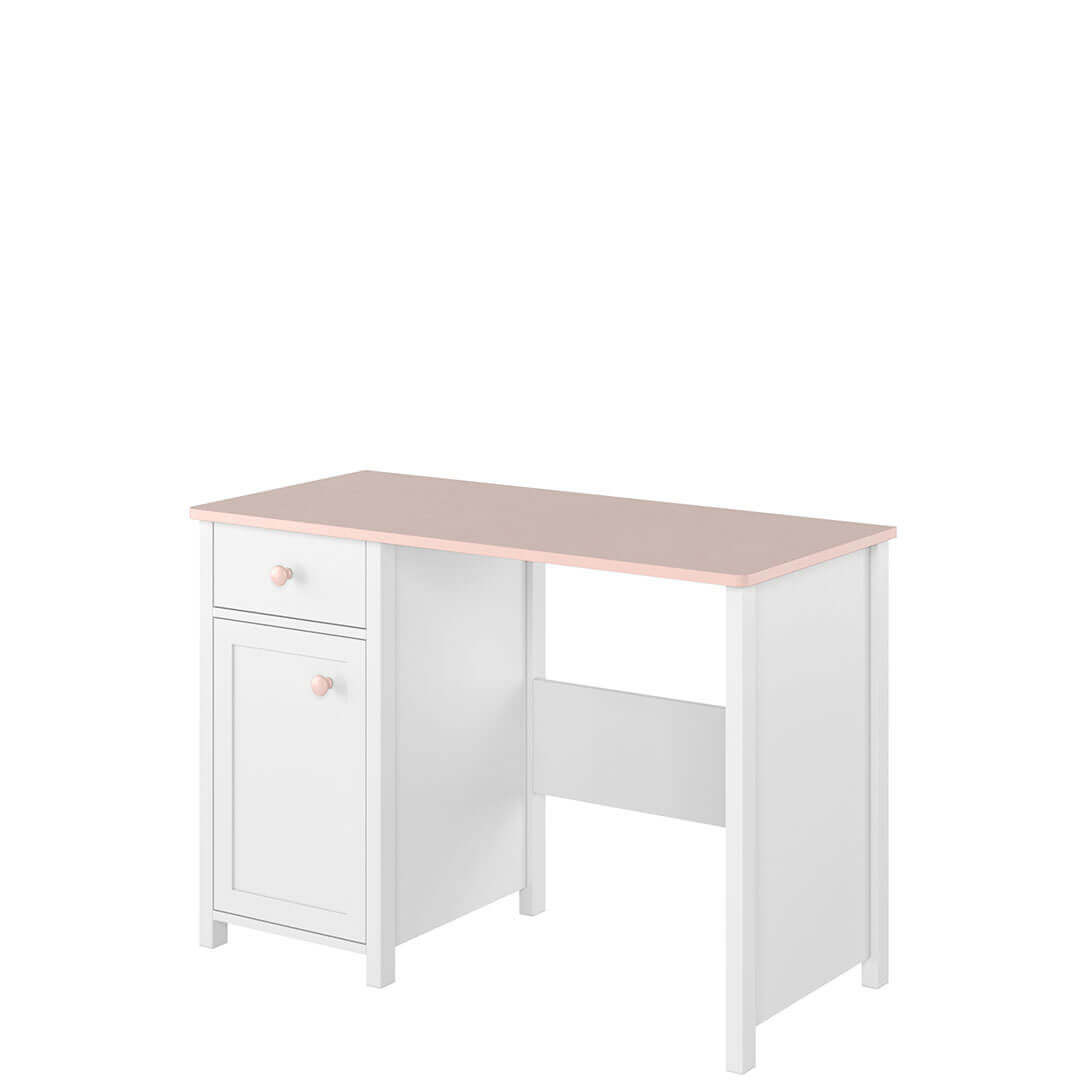 Biurko LUNA LN-03 - idealne dla młodych artystek, z przestrzennym blatem do pracy kreatywnej. Elegancja w połączeniu bieli i pudrowego różu, z funkcjonalną szafką i szufladą.