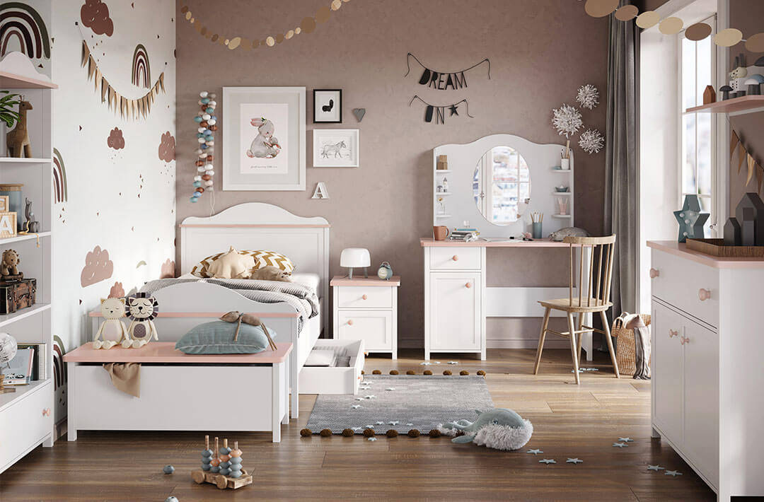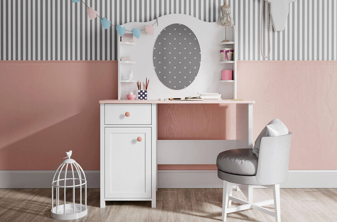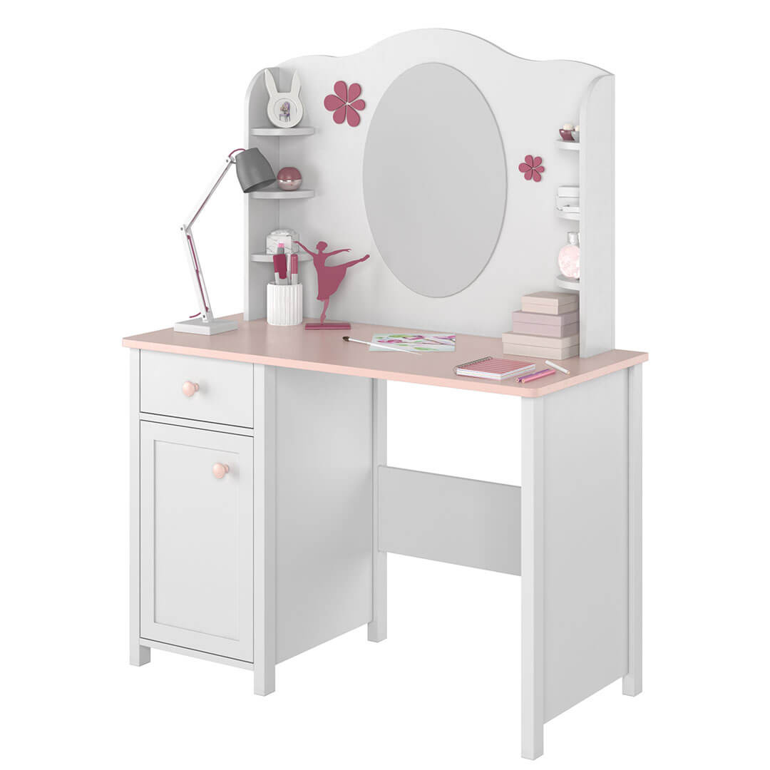 Każda młoda użytkowniczka będzie zachwycona możliwością skompletowania swojego biurka z dodatkowymi nadstawkami z tej samej kolekcji - sekretarzykiem z przegrodami i szufladami (LN-04) lub toaletką z lustrem i półkami (LN-06), które nadają przestrzeni jeszcze więcej funkcjonalności i uroku.