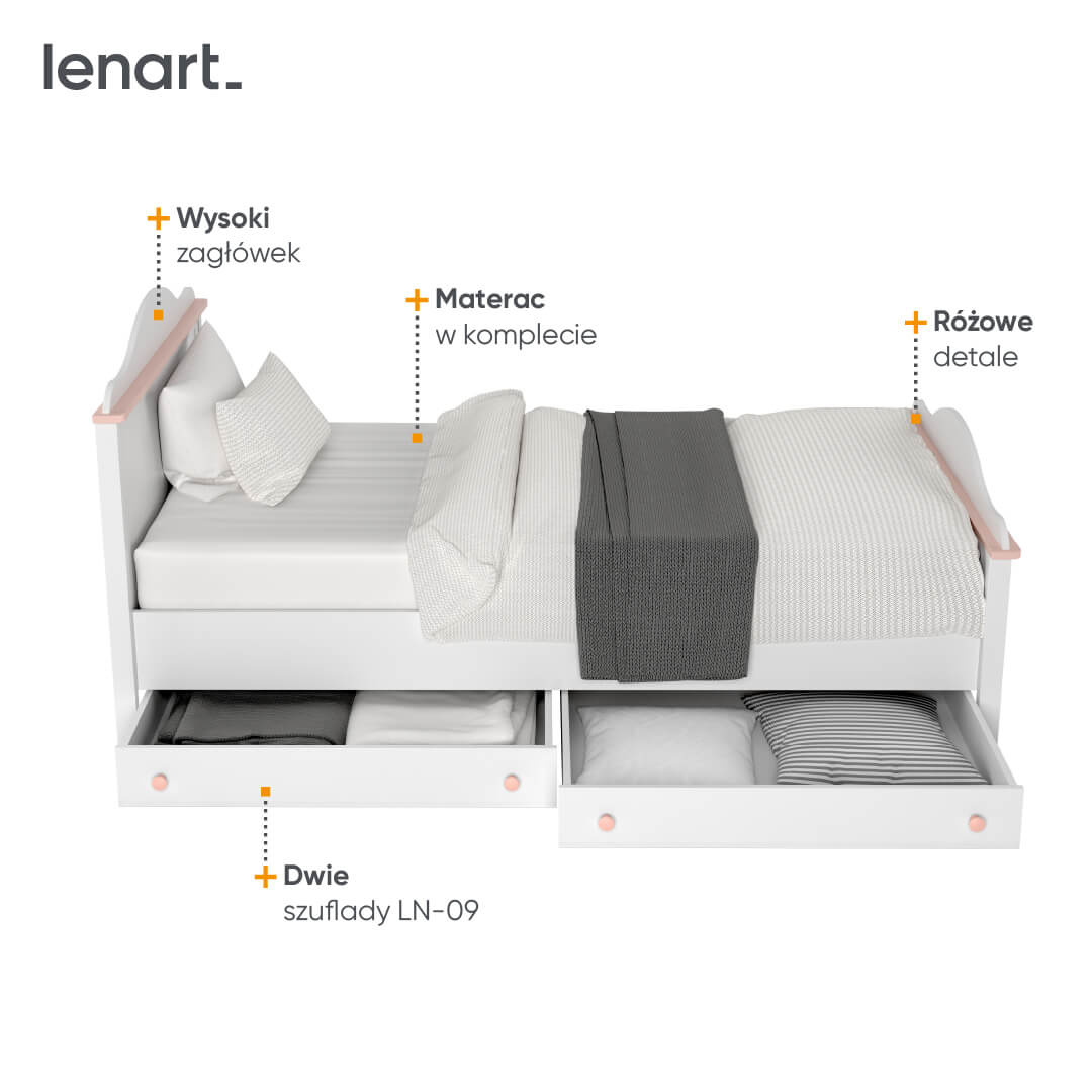 - Eleganckie, białe łóżko LUNA LN-08 z detalami w pudrowy róż, zapewniające królewski wypoczynek. Wyposażone w wygodny materac bonellowy, idealne do pokoju młodzieżowego.