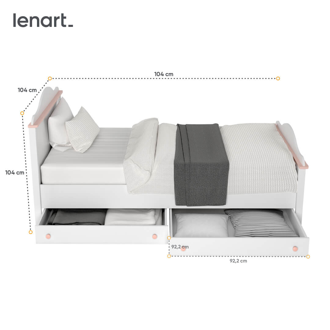 Kolekcja LUNA wyróżnia się swoją nowoczesnością, wprowadzając w życie design, który jest równocześnie funkcjonalny i pełen gracji. Łóżko LUNA LN-08 z indeksem bryły LN8BR prezentuje białą kolorystykę z uroczymi akcentami w kolorze pudrowego różu, które dodają mu subtelnej delikatności. Dzięki wymiarom szerokość: 104 cm, wysokość: 100 cm i głębokość: 209 cm, łóżko to stworzy komfortową strefę odpoczynku nawet w niedużym pokoju młodzieżowym.