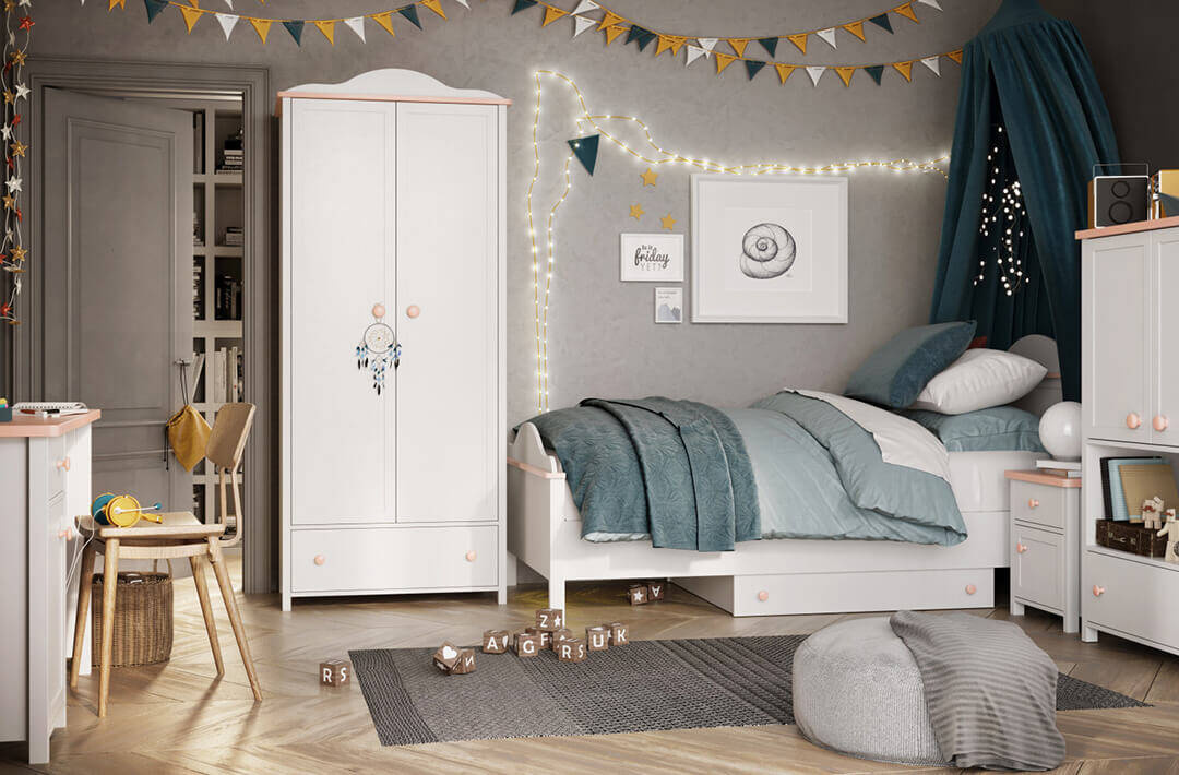 - Komoda LUNA LN-11: praktyczny mebel z 2 drzwiami i szufladą, idealny do pokojów młodzieżowych. Biała z różowymi akcentami, dodaje uroku wnętrzu.