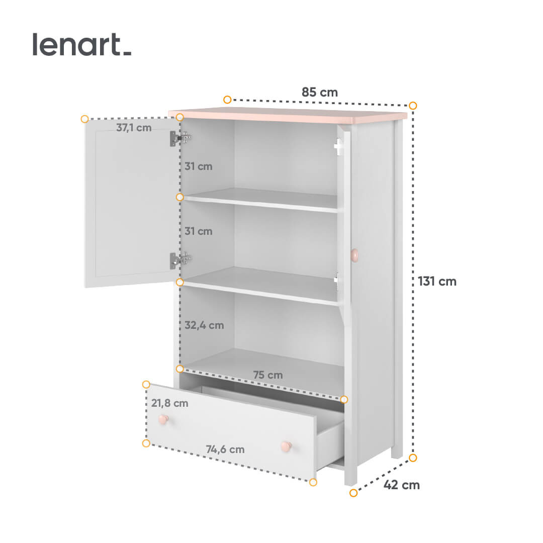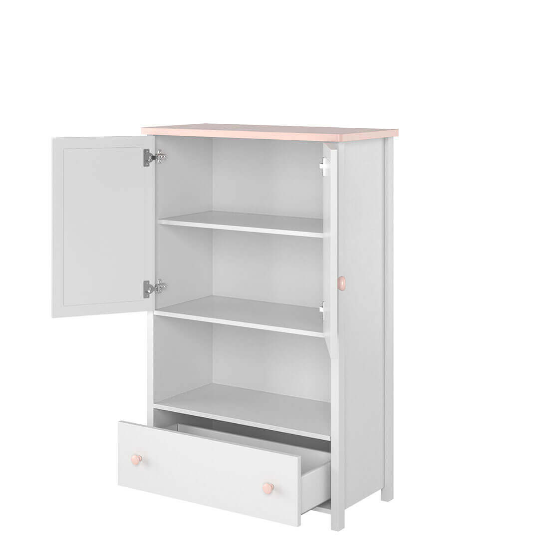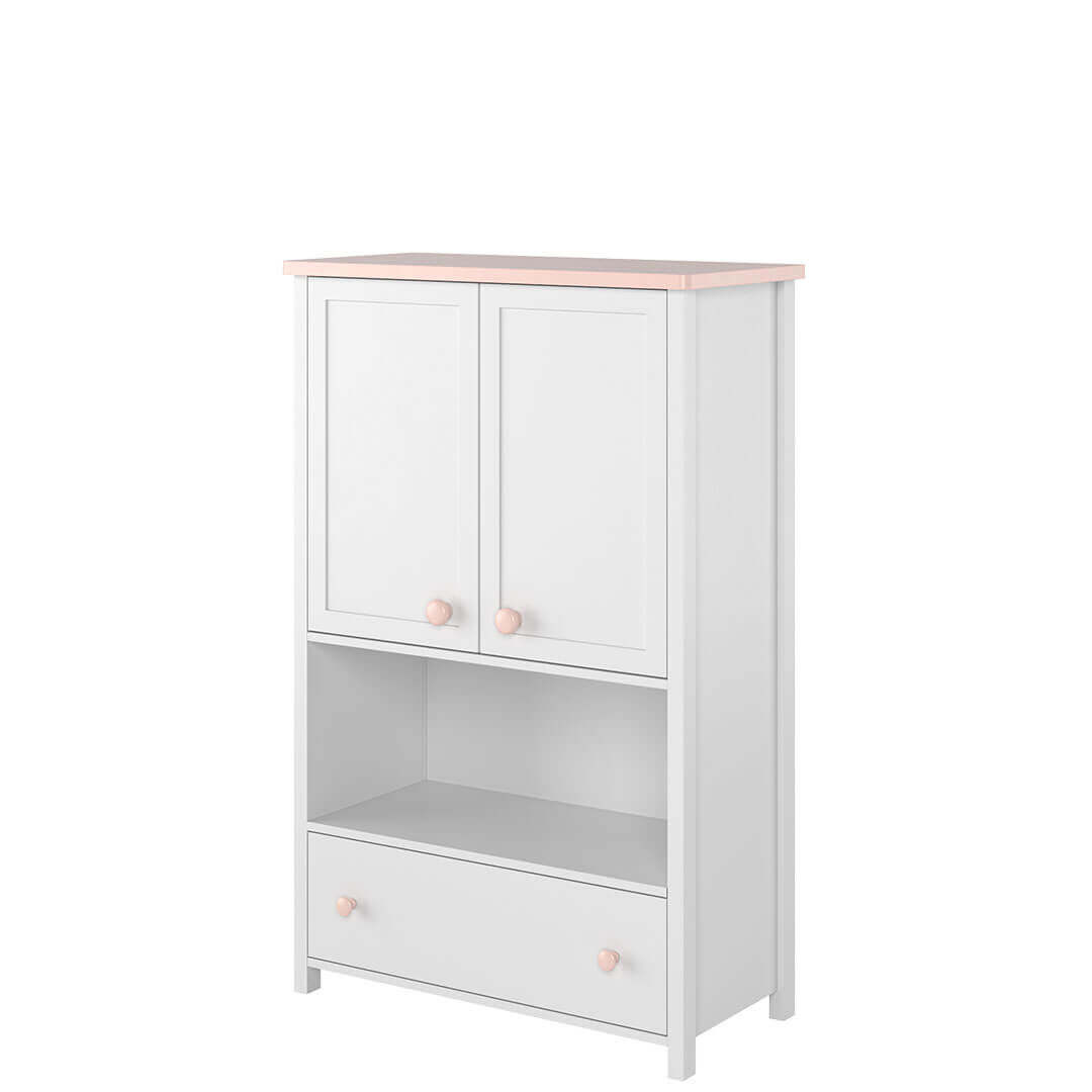 Komoda LUNA LN-11: praktyczny mebel z 2 drzwiami i szufladą, idealny do pokojów młodzieżowych. Biała z różowymi akcentami, dodaje uroku wnętrzu.