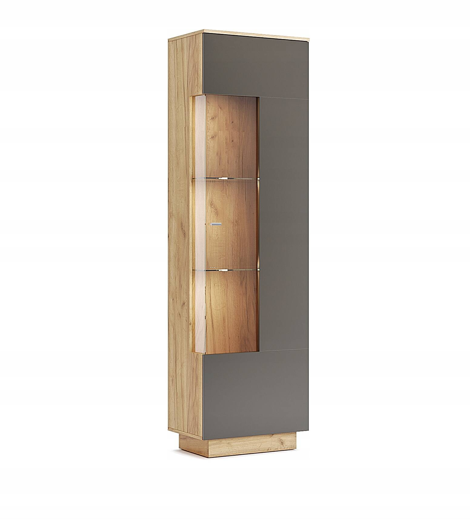 Ten wysoki i smukły mebel o wysokości 205,5 cm i szerokości 60 cm zapewnia sporo miejsca na ulubione dodatki, które możesz wyeksponować na szklanych półkach. Dzięki wbudowanemu oświetleniu LED, witryna zyskuje wyjątkowy wygląd, a wyeksponowane przedmioty są pięknie podświetlone, tworząc atmosferę luksusu i przytulności w każdym wnętrzu.