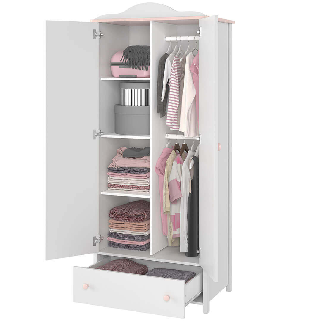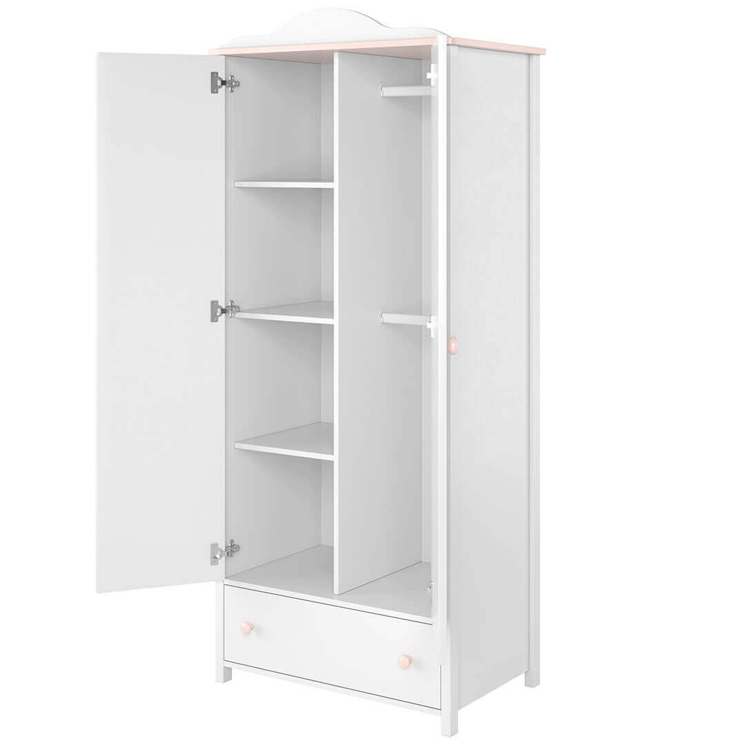 Szafa LUNA LN-12 to marzenie każdej młodej damy: podział na praktyczny regał z półkami, drążek na odzież i dolną szufladę. Biel połączona z różem, baśniowy design. W:196cm, S:85cm.