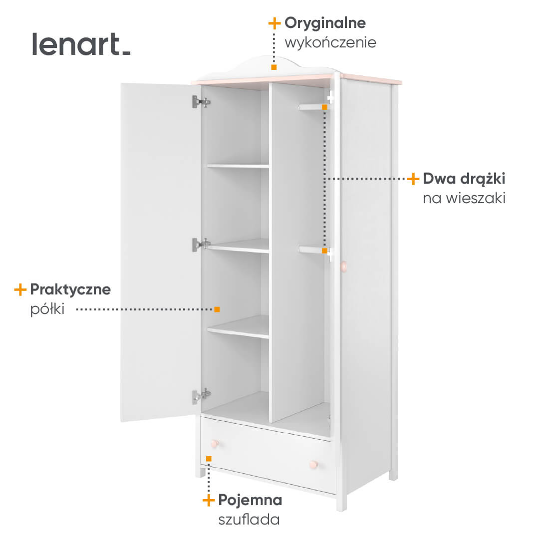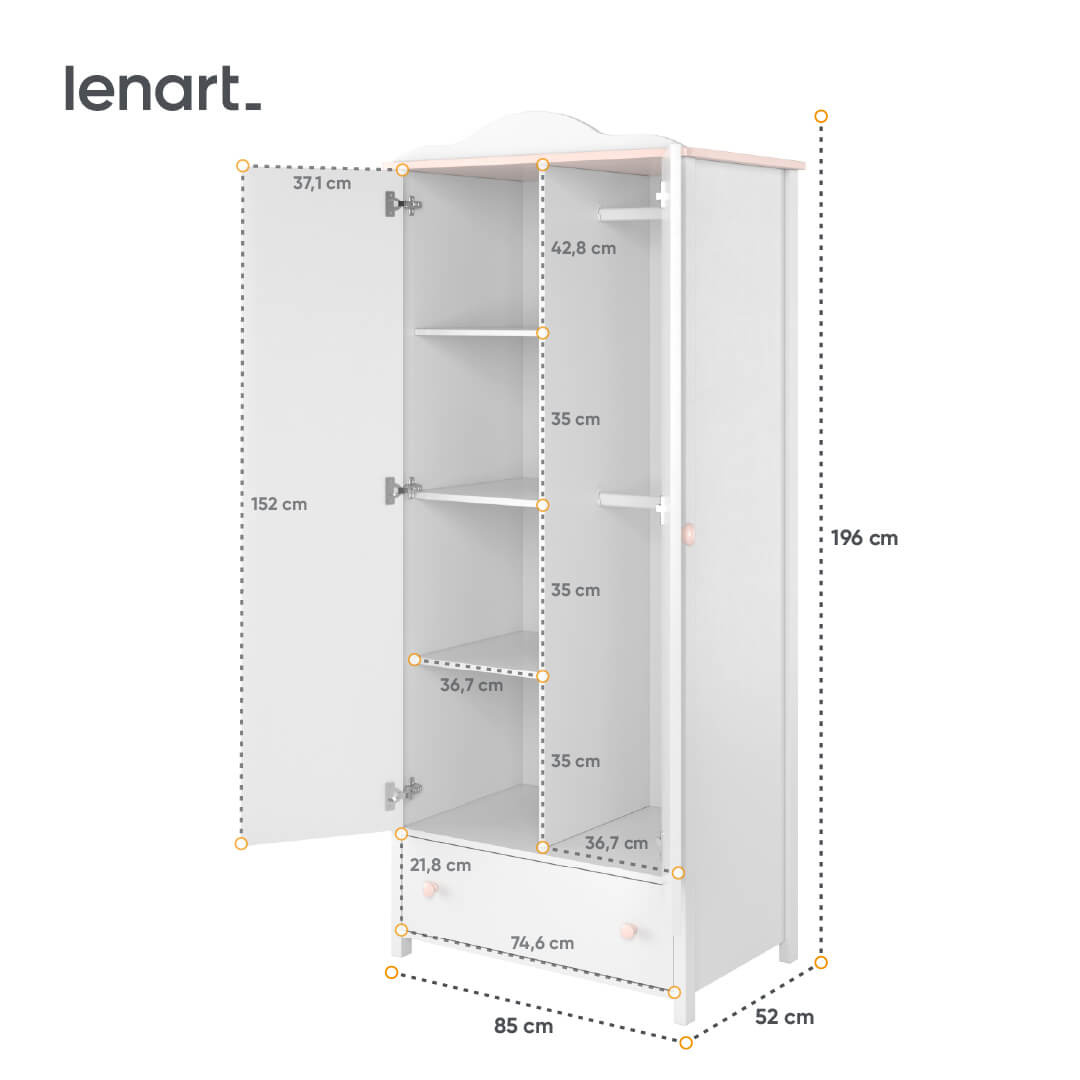 - Szafa LUNA LN-12 to marzenie każdej młodej damy: podział na praktyczny regał z półkami, drążek na odzież i dolną szufladę. Biel połączona z różem, baśniowy design. W:196cm, S:85cm.