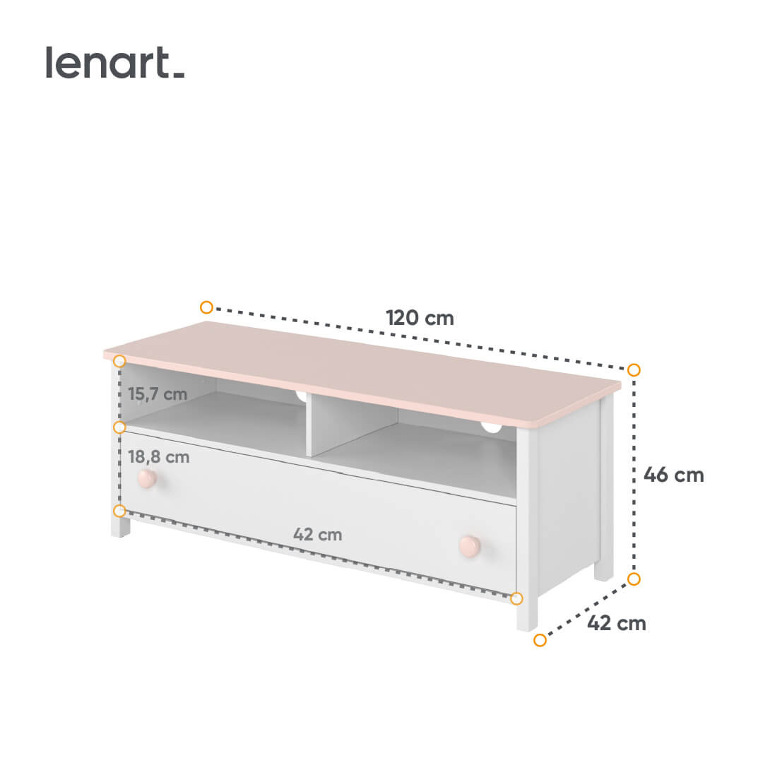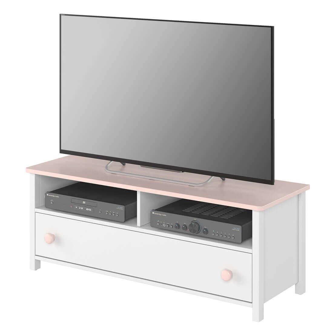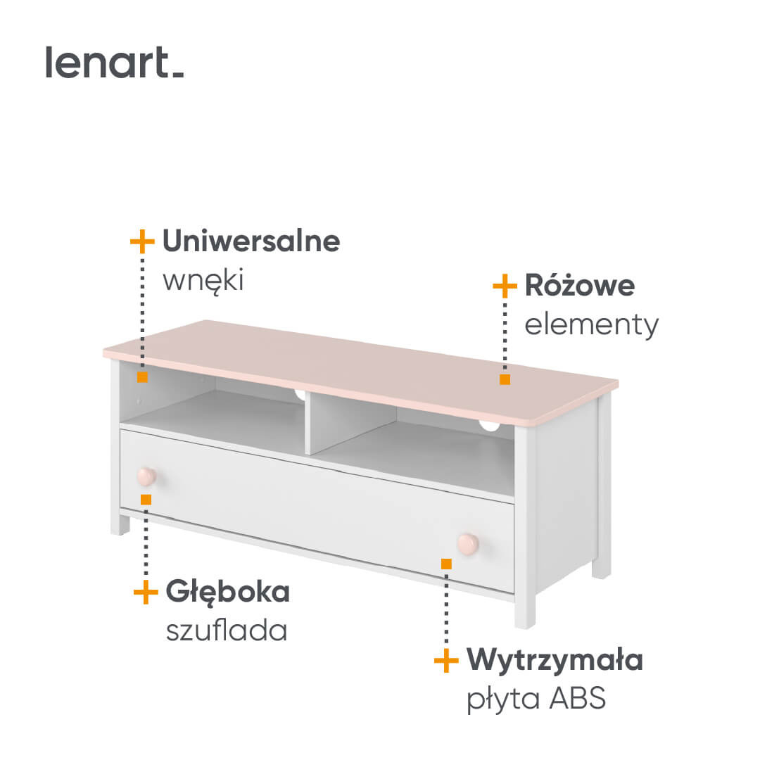 - Szafka RTV z dwiema wnękami na sprzęty elektroniczne i pojemną, głęboką szufladą. Mebel w kolorze bieli oraz blat i dodatki w kolorze pudrowego różu tworzą niepowtarzalny styl. Mebel wykonano z płyty laminowanej, uchwyty z tworzywa.