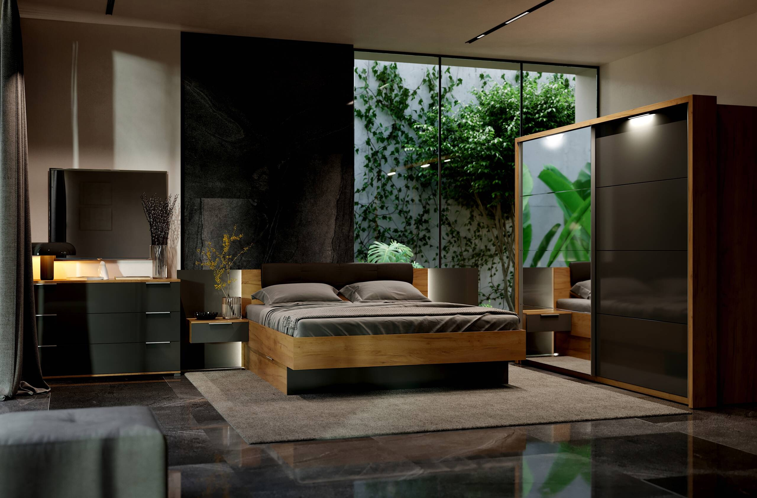 Wyjątkowa kolorystyka frontów w odcieniu Matt Lava przyciąga wzrok swoją oryginalnością. W zależności od rodzaju oświetlenia, fronty zmieniają odcień od ciemnoszarego po ciemnobrązowy, co nadaje meblowi dynamiczny charakter. Połączenie matowego wykończenia z połyskiem tworzy elegancki efekt, który z pewnością przyciągnie uwagę każdego odwiedzającego twój dom. Szafa Luna LN-22-LV to wyborna ozdoba każdej nowoczesnej sypialni lub garderoby.