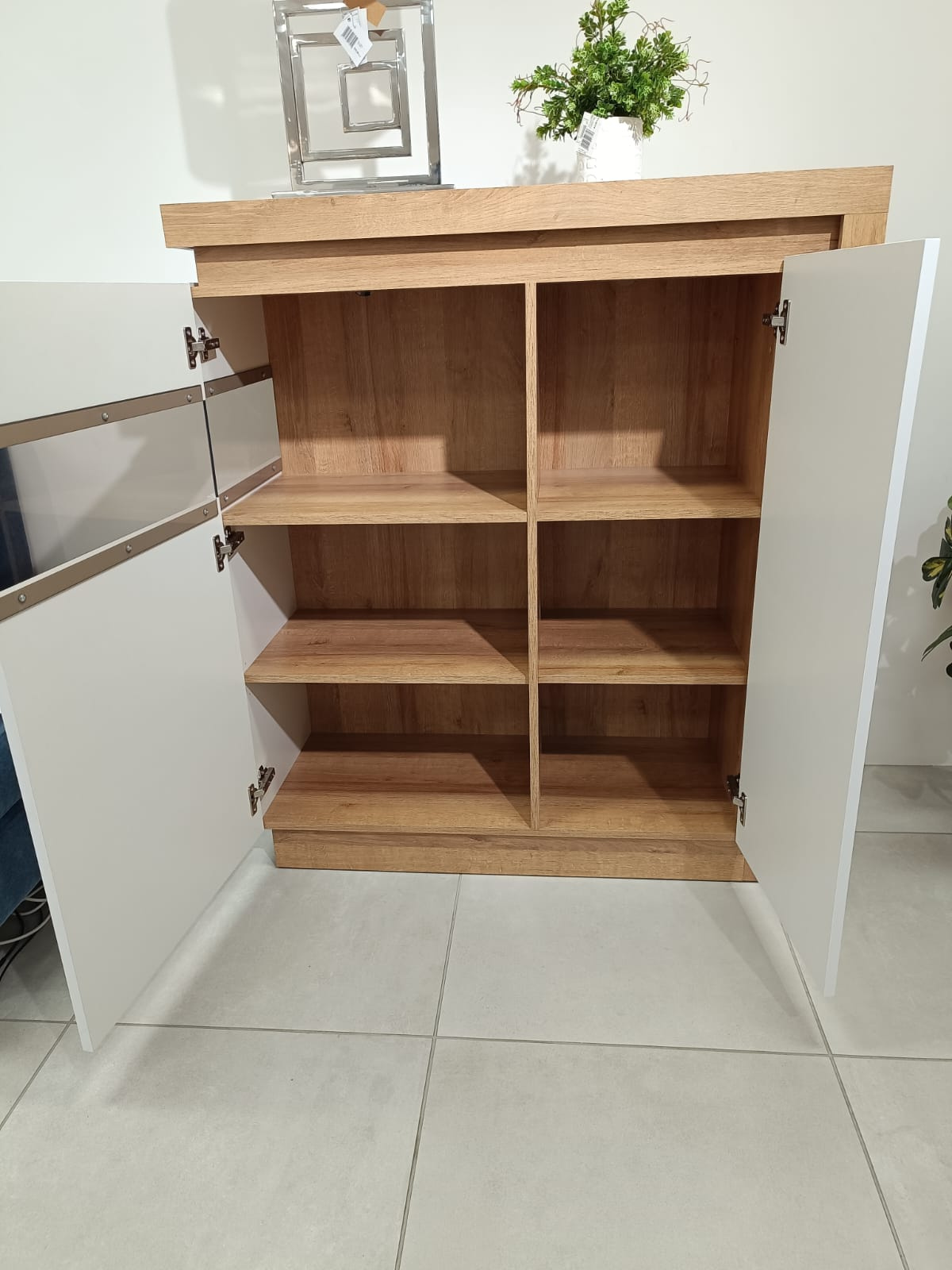 - Niska witryna LYON LYOV04L w odcieniu Dąb Riviera, z hartowanym szkłem Antisol i bezuchwytowym systemem z cichym domykiem.