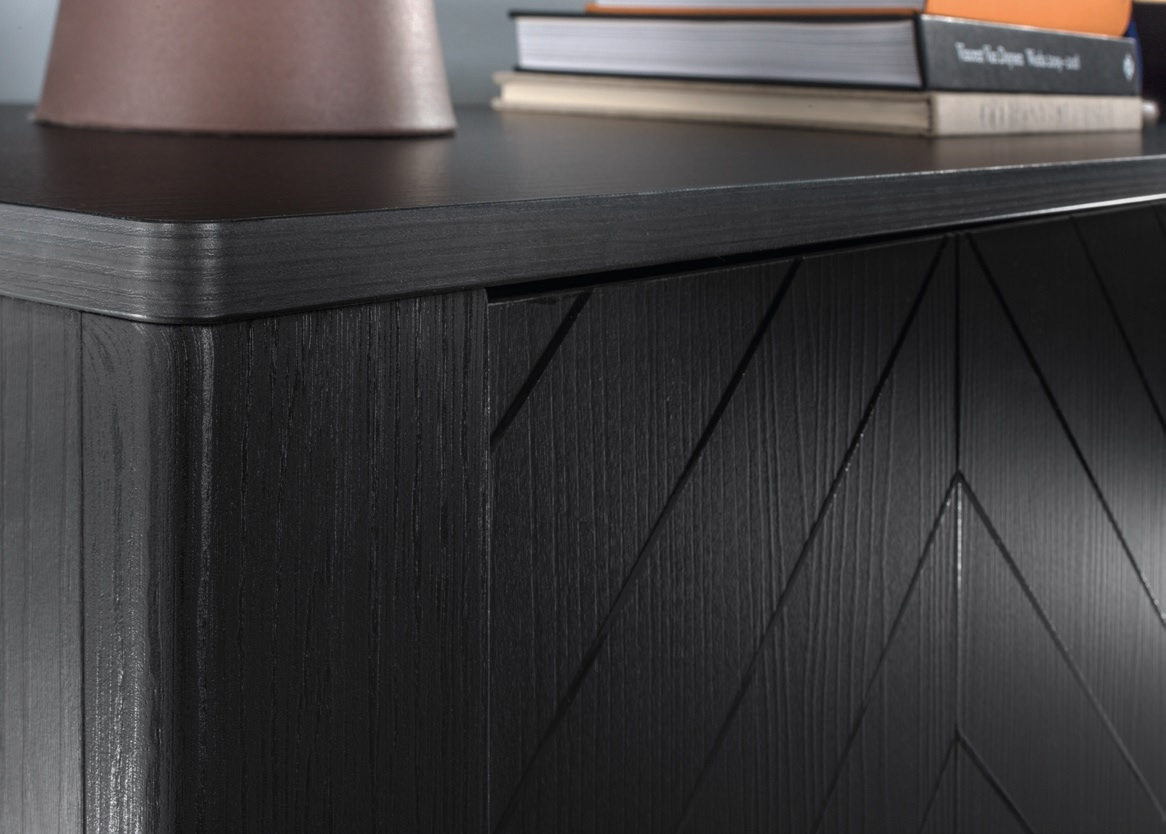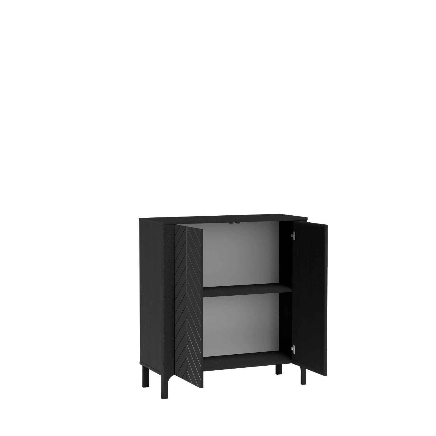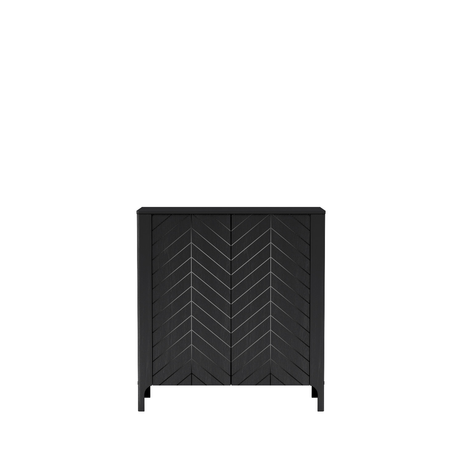 MALUMI-2 to niezwykła komoda 2-drzwiowa, która doda elegancji i funkcjonalności do Twojego wnętrza. Jej nowoczesny design i ciemne, matowe wykończenie w kolorze czarnym Painflow sprawiają, że staje się ona wyrazistym elementem każdego pokoju. Subtelny wzór w jodełkę na frontach nie tylko przyciąga wzrok, ale także dodaje klasycznego sznytu, idealnie współgrając z minimalistycznym stylem mebla.