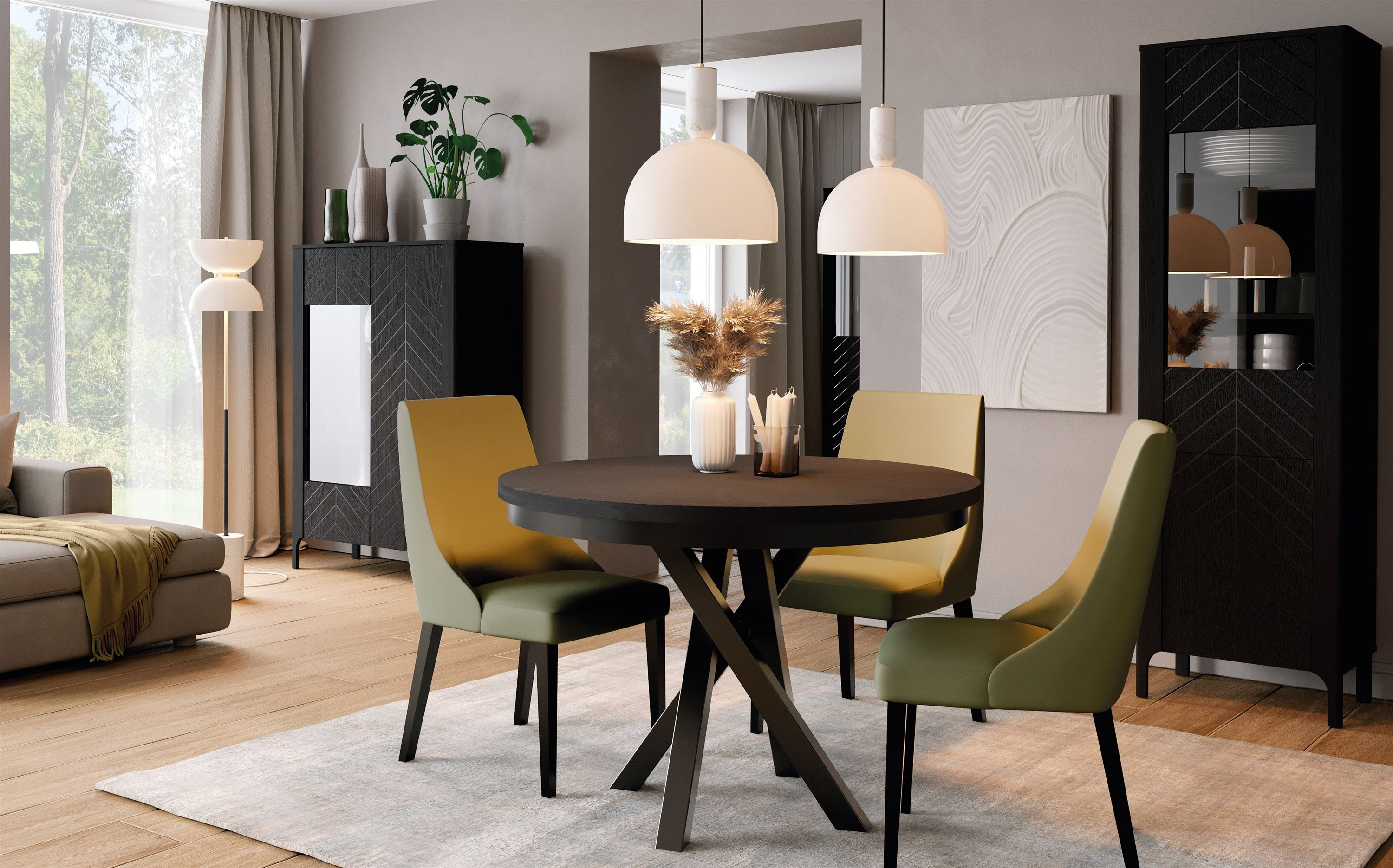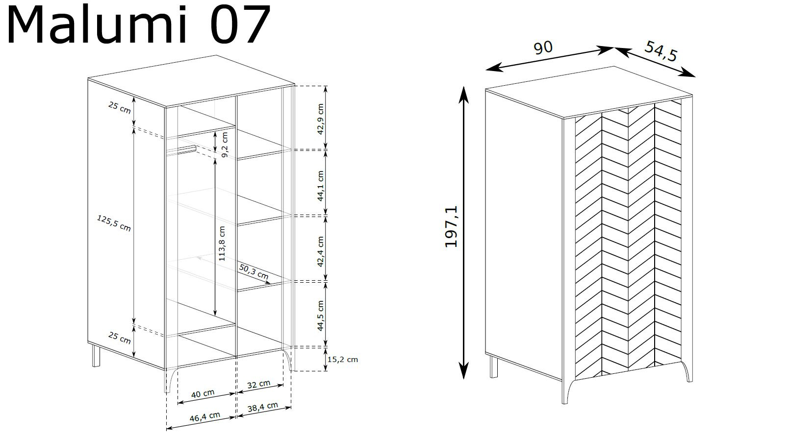 Szafa MALUMI-7 łączy elegancję, ale również funkcjonalność. Wykonana z wysokiej jakości matowej płyty meblowej, jej czarna konstrukcja z geometrycznym wzorem w jodełkę wniesie nowoczesny klimat do każdego wnętrza. Dzięki połączeniu minimalistycznego designu z praktycznymi rozwiązaniami, ta szafa stanie się nie tylko meblem, ale również prawdziwym dziełem sztuki.