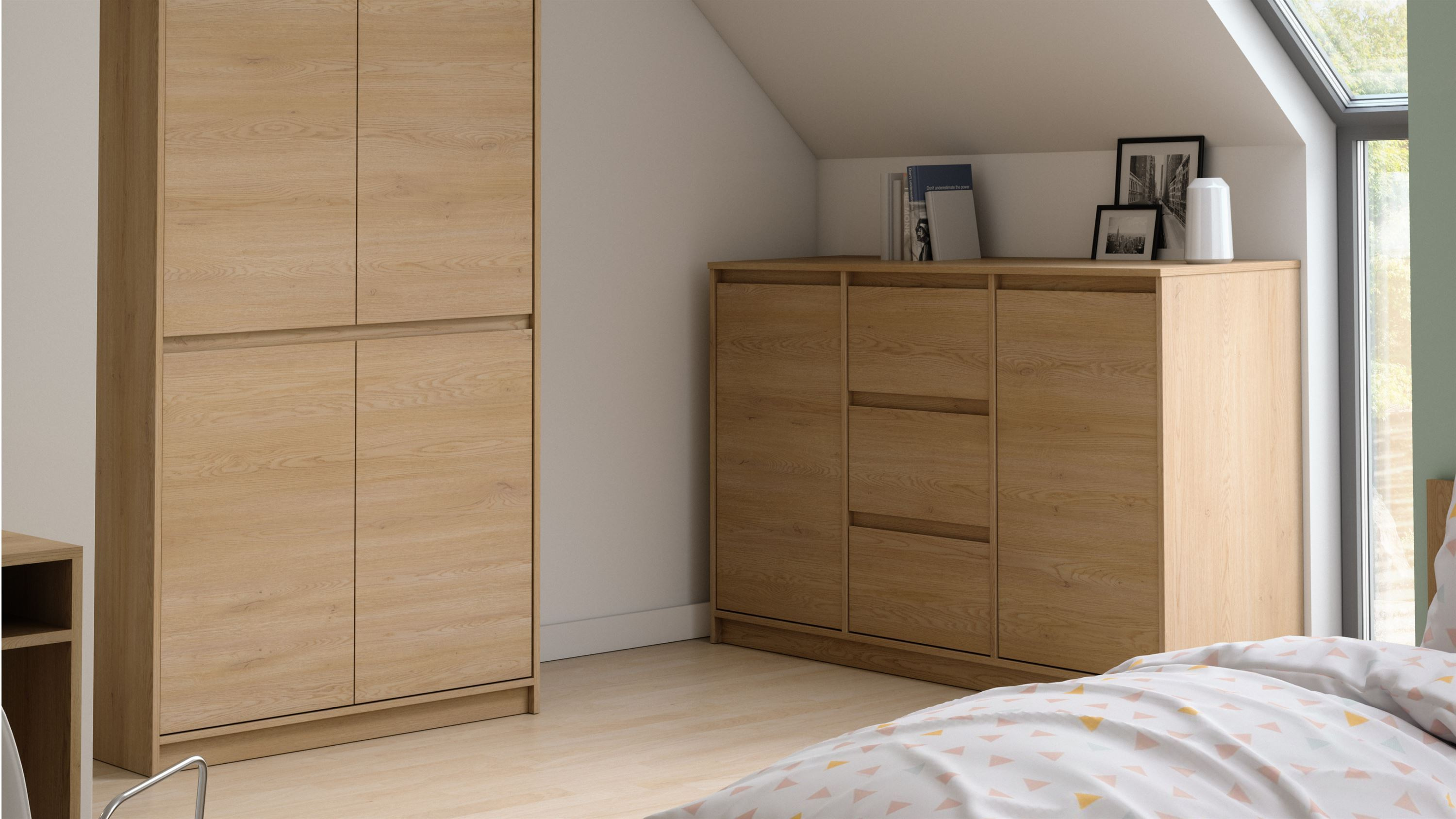 Przemyślana konstrukcja komody pozwala na inteligentne zagospodarowanie przestrzeni. Dzięki trzem praktycznym szufladom oraz dwu pojemnym szafkom na dokumenty, idealnie nadaje się do biura lub pokoju dziennego. Wygodne przechowywanie staje się naturalne, a potrzeba organizacji zyskuje nowe możliwości. Płyta laminowana, z której wykonano fronty i korpus, zapewnia trwałość oraz odporność na uszkodzenia, co sprawia, że komoda Manami będzie cieszyć oko przez długi czas.