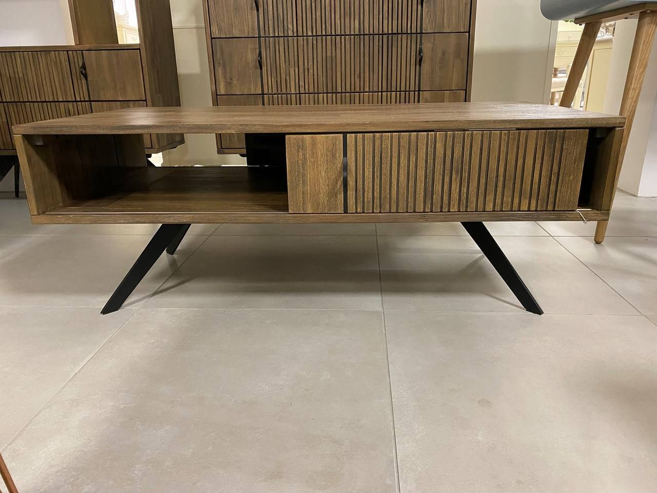 Ława Massa to niezwykle praktyczny mebel, który idealnie pasuje do wnętrz urządzonych w stylu vintage. Świetnie sprawdzi się także w lofcie. Prostą formą wzbogaconą o półkę wbudowano w bryłę mebla. Można nie niej położyć potrzebne drobiazgi, choćby książkę. Połowa półki jest zamknięta i schowana za pomysłowymi przesuwnymi drzwiami, w których można ukryć rzeczy, które niekoniecznie mają być widoczne. Półkę zdobi charakterystyczne dla tej serii mebli żłobienie, które zdobi i nadaje charakteru.