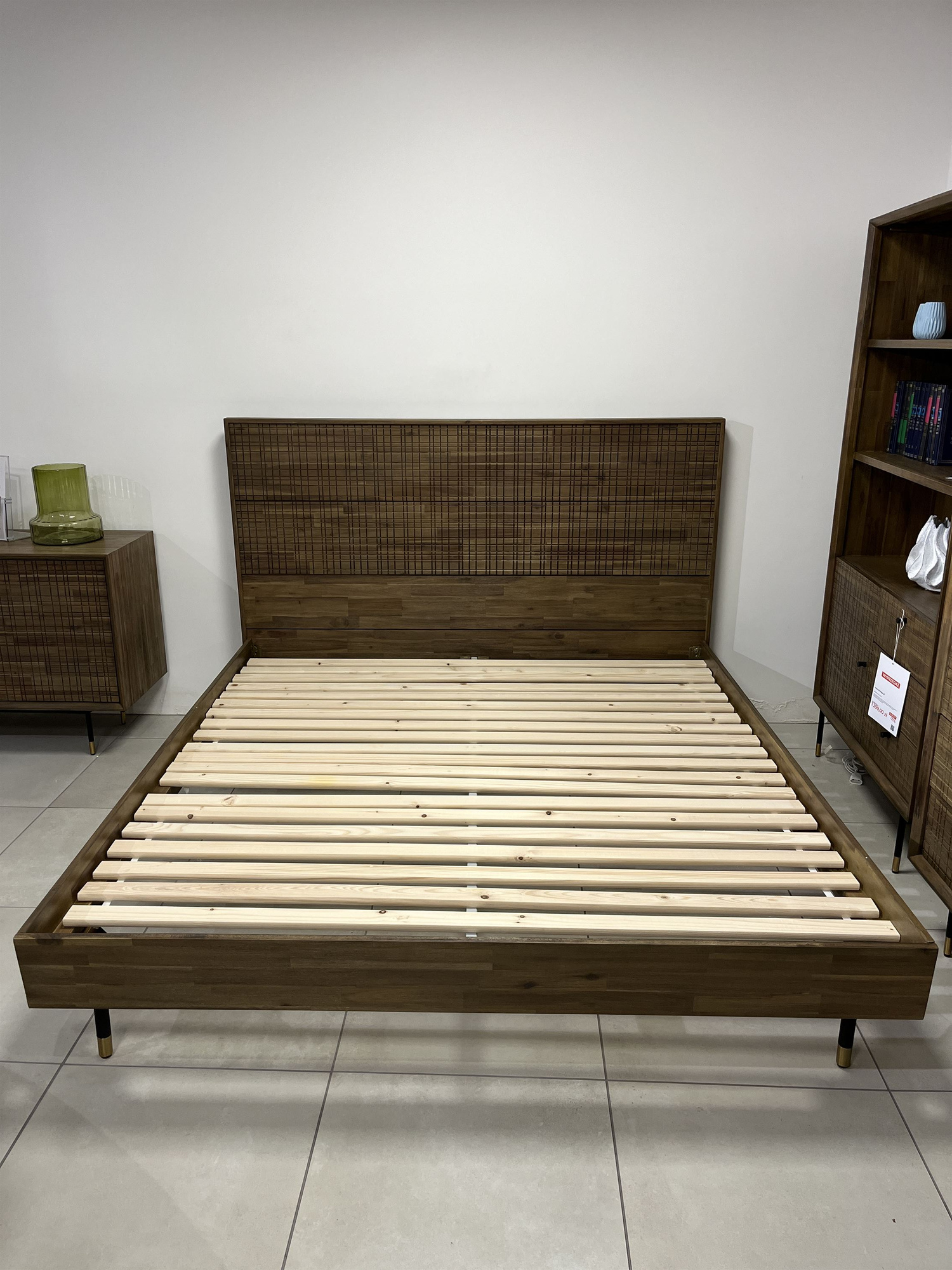 - Łóżko o szerokości 180 cm z zagłówkiem wykonane z drewna akacji na metalowych nóżkach ze złotymi zakończeniami.