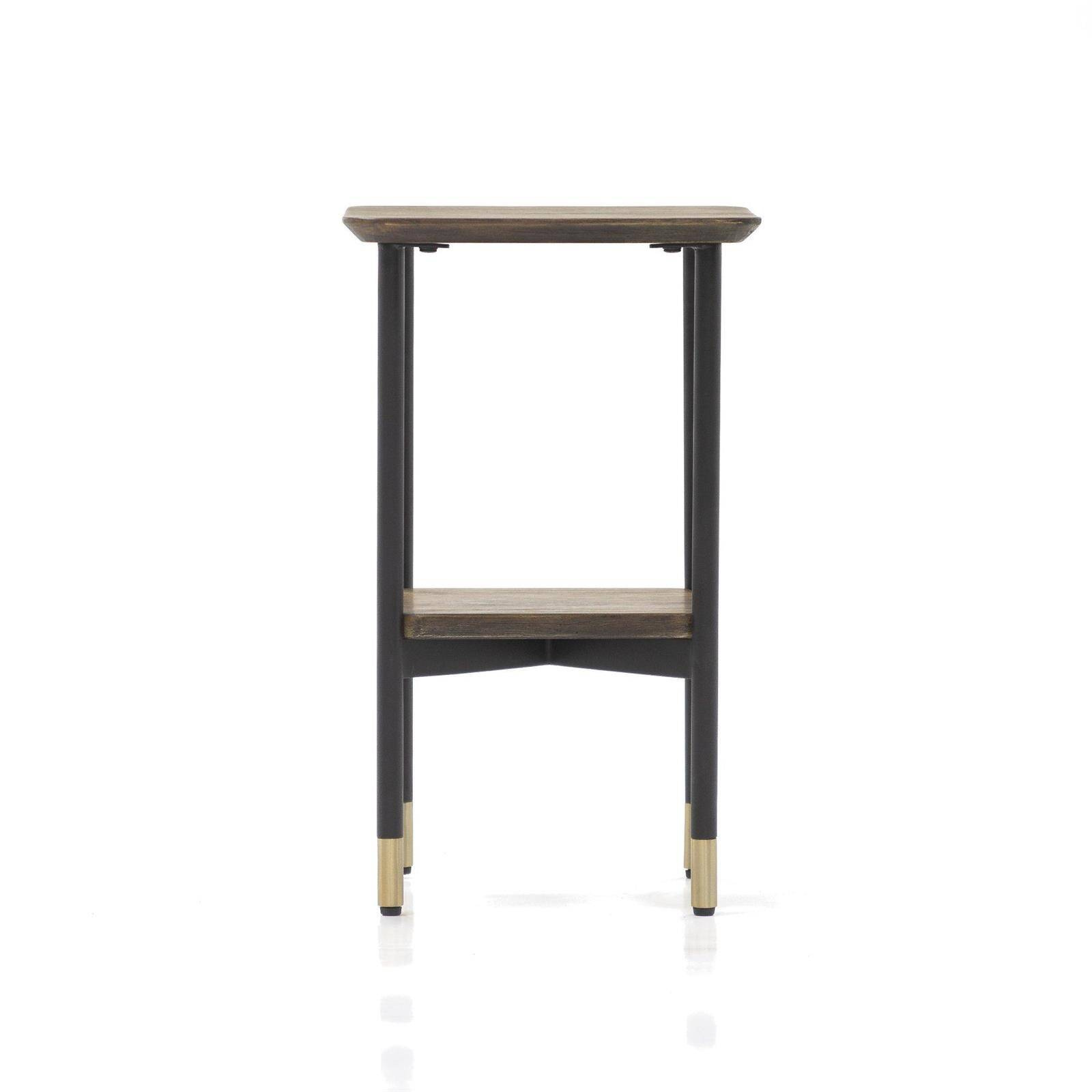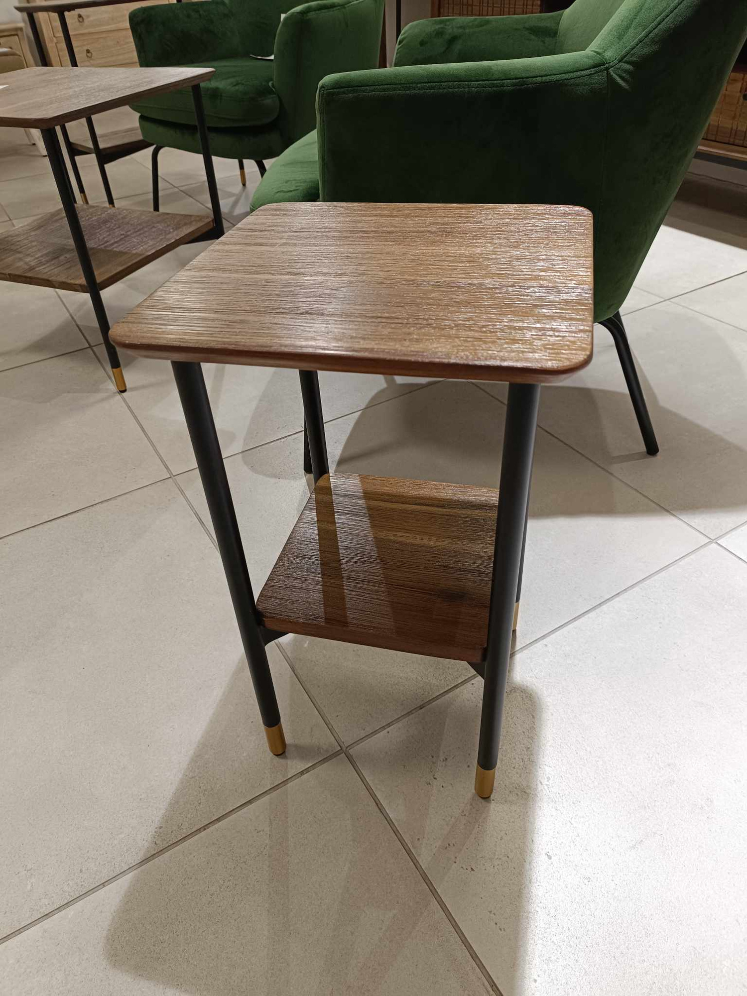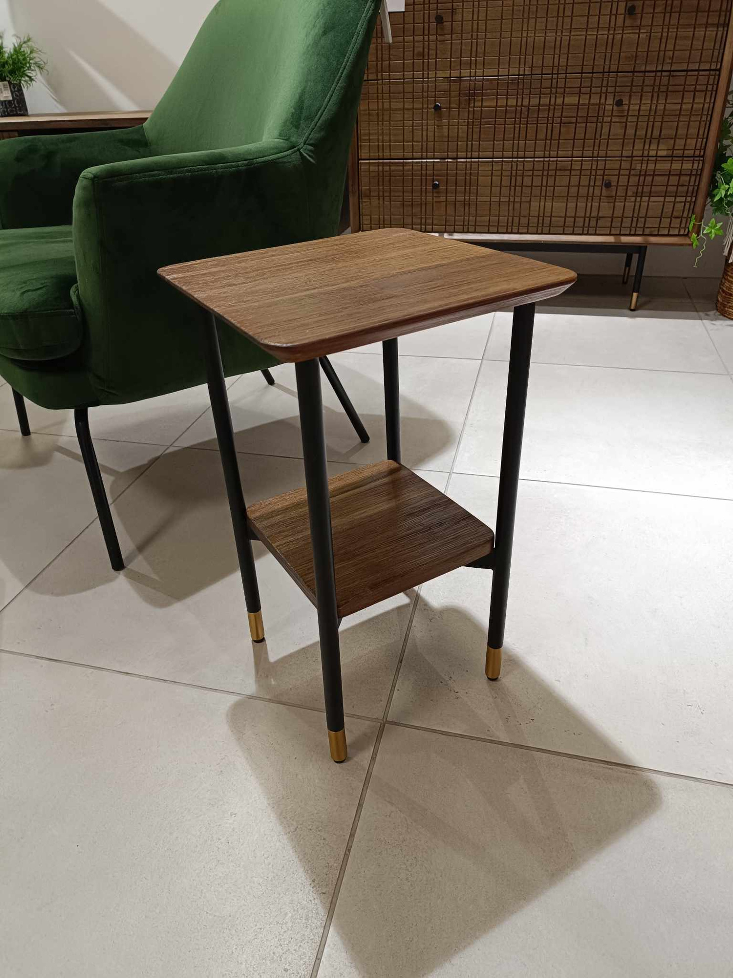 - Stolik o szerokości 30 cm z jedną półką wykonana z drewna akacji na metalowych nóżkach ze złotymi zakończeniami.