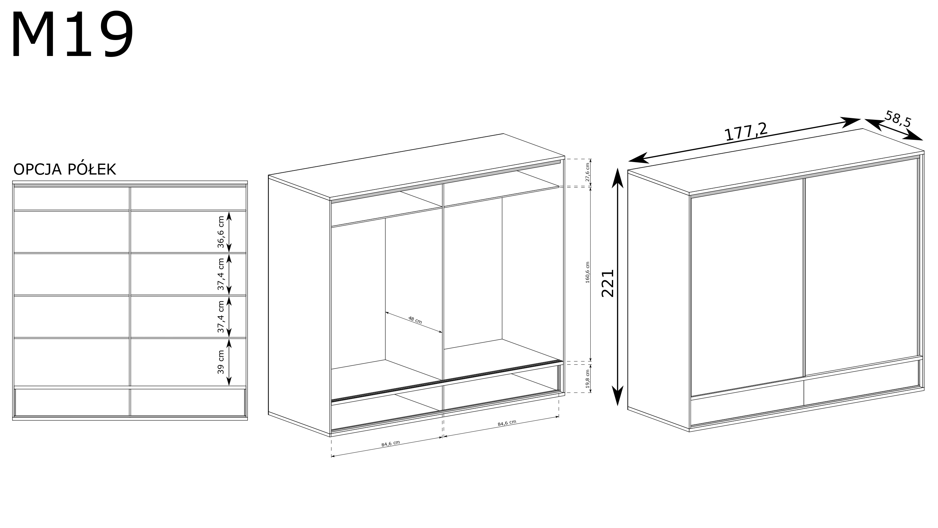 Wewnątrz szafy MEDIOLAN-19 znajdziesz dużą ilość przestronnych półek, które pozwolą na łatwe i estetyczne uporządkowanie złożonej odzieży, toreb czy dodatków. Dzięki tym praktycznym rozwiązaniom, organizacja staje się przyjemnością, a Twoje ubrania zawsze będą na wyciągnięcie ręki. Szafa jest nie tylko elegancka, ale również niezwykle praktyczna, sprawdzi się w każdej sypialni, przedpokoju czy nawet w pokoju młodzieżowym.