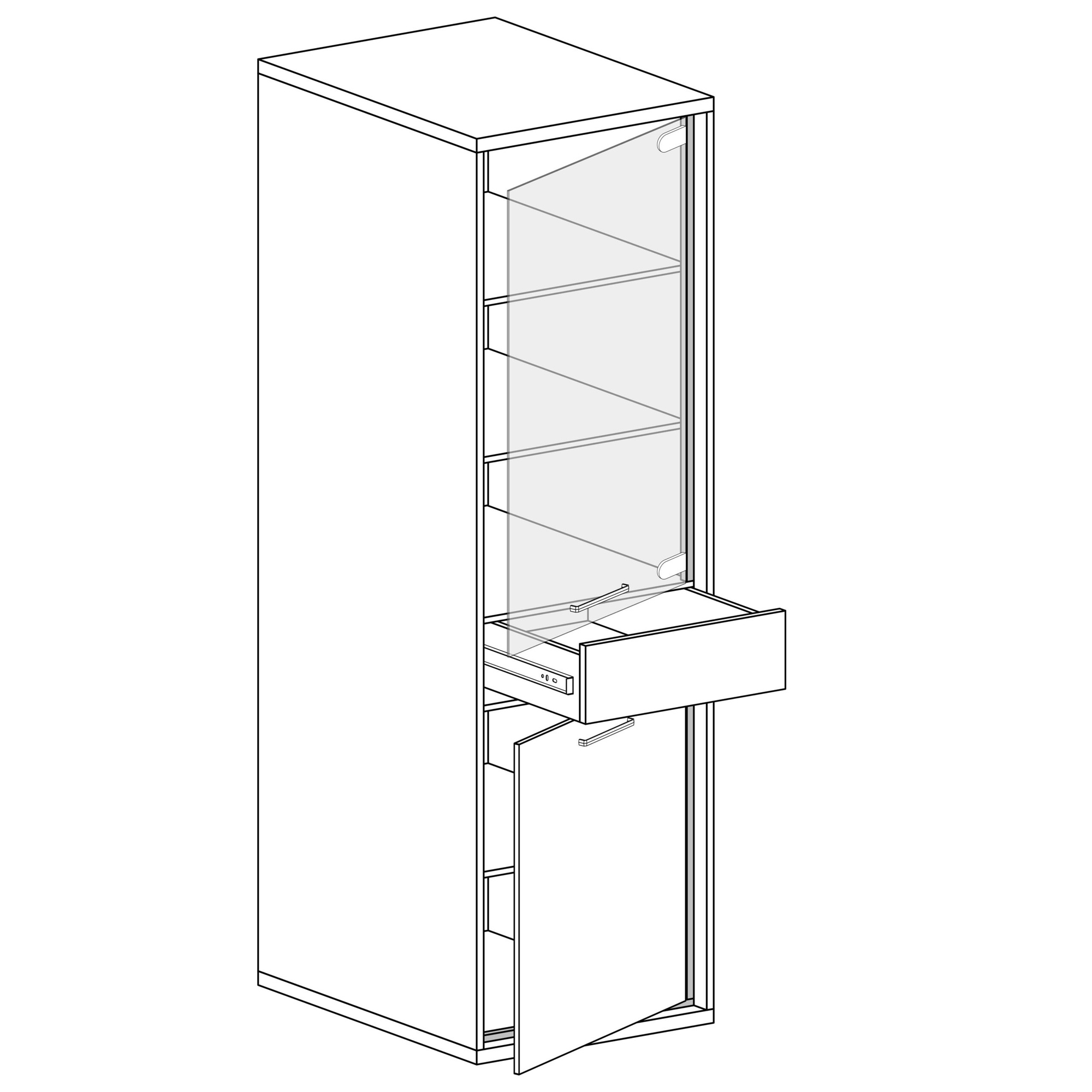 Dolna część witryny to przestronna, otwierana szafa, która zapewnia wygodę i funkcjonalność. Dzięki jednej półce z płyty laminowanej, użytkownik ma możliwość przechowywania różnych drobiazgów, zachowując jednocześnie porządek. Co więcej, wbudowana szuflada z wygodnym systemem Push to Open to prawdziwy strzał w dziesiątkę dla osób, które cenią sobie zarówno nowoczesność, jak i praktyczność w codziennym użytkowaniu.