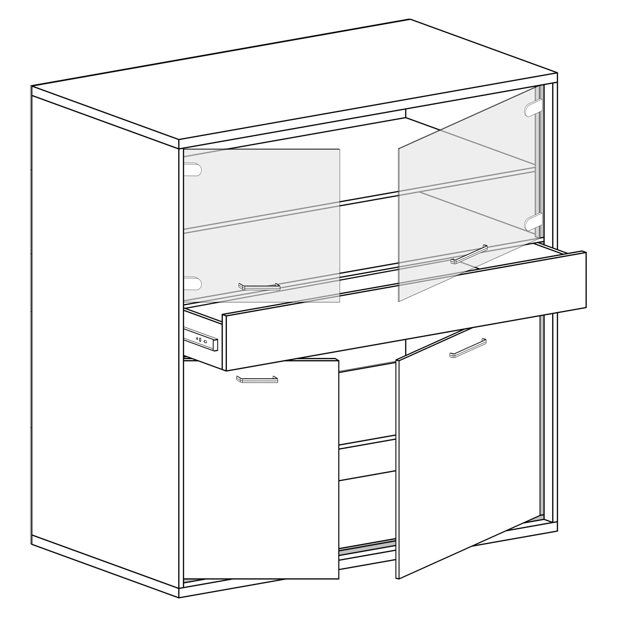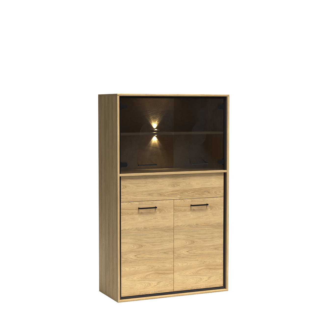 Górna część witryny wyróżnia się prześwitującymi szklanymi frontami, które umożliwiają eksponowanie Twoich ulubionych pamiątek oraz dekoracji, nadając przestrzeni osobistego charakteru. Bezpieczne, hartowane szkło z delikatnym efektem przydymienia wprowadza nutę luksusu i elegancji. Co więcej, wnętrze witryny wyposażone jest w solidną laminowaną półkę, która zapewnia stabilność i porządek w przechowywanych przedmiotach.