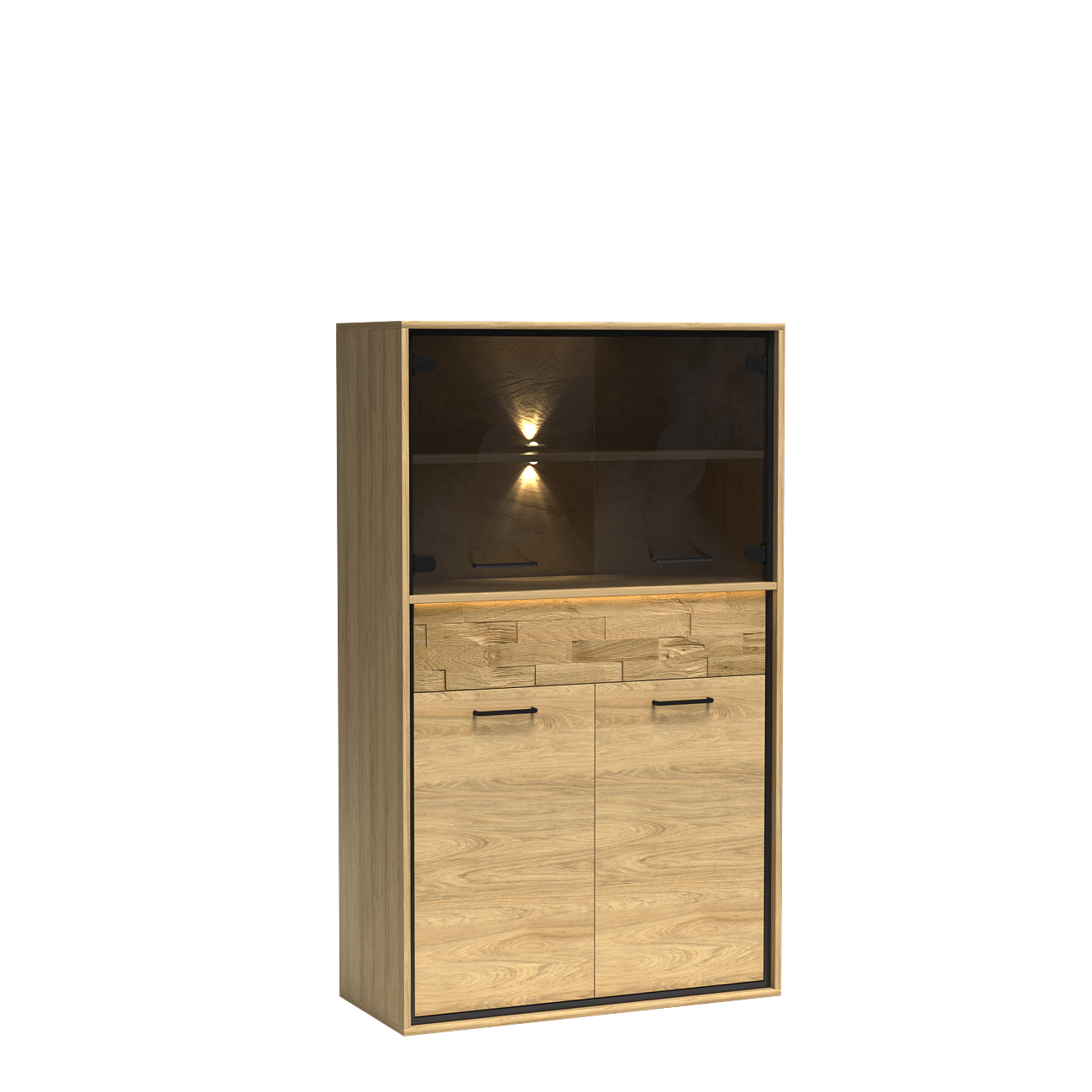 Nie przegap również możliwości personalizacji swojej witryny! Możesz wybrać czarne nóżki, aby dodać jej nowoczesnego wyglądu, lub zainwestować w subtelne oświetlenie LED, które rozjaśni Twoje ulubione przedmioty i stworzy niesamowity klimat w pomieszczeniu. Dodatkowo, oferujemy również pięknie rzeźbioną deskę dębową, która może być zastosowana jako front szuflady, wprowadzając do wnętrza naturalny akcent.