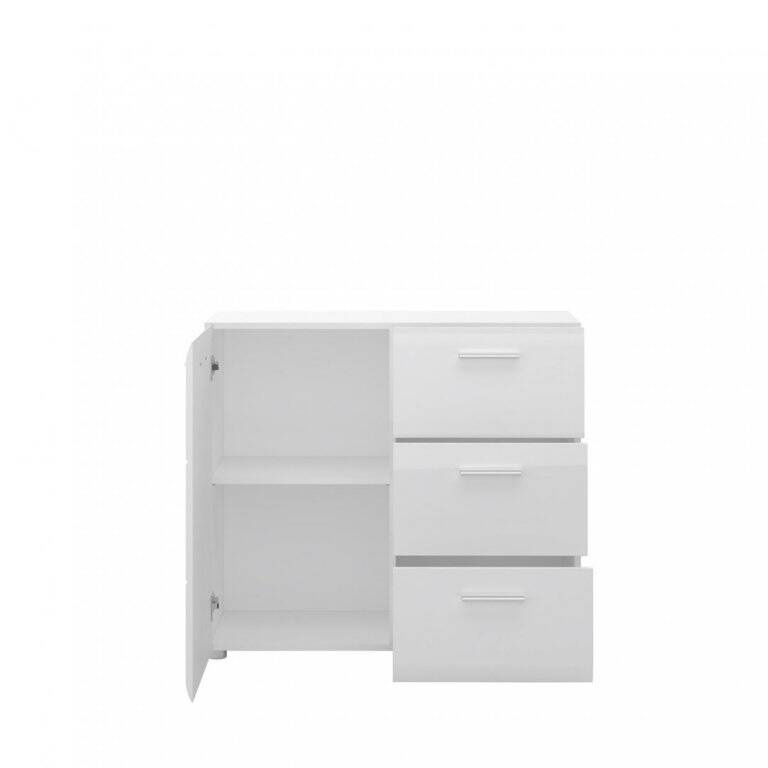 Komoda Merano MEOK02 - elegancki mebel 1D3S w kolorze bieli, zwiększa optycznie przestrzeń. Trzy pojemne szuflady na kulkowych prowadnicach i wykończenie na wysoki połysk zapewniają funkcjonalność i styl.