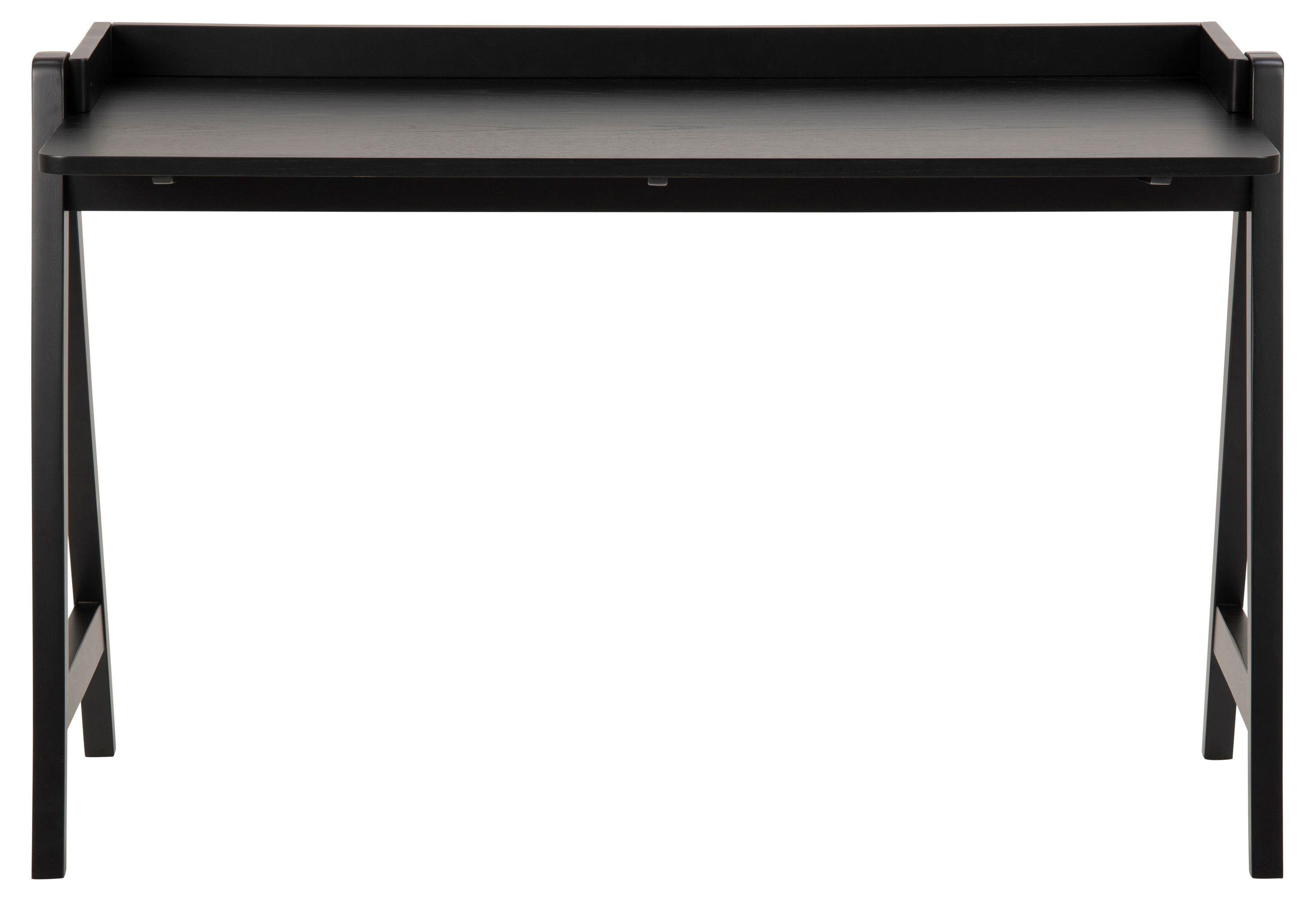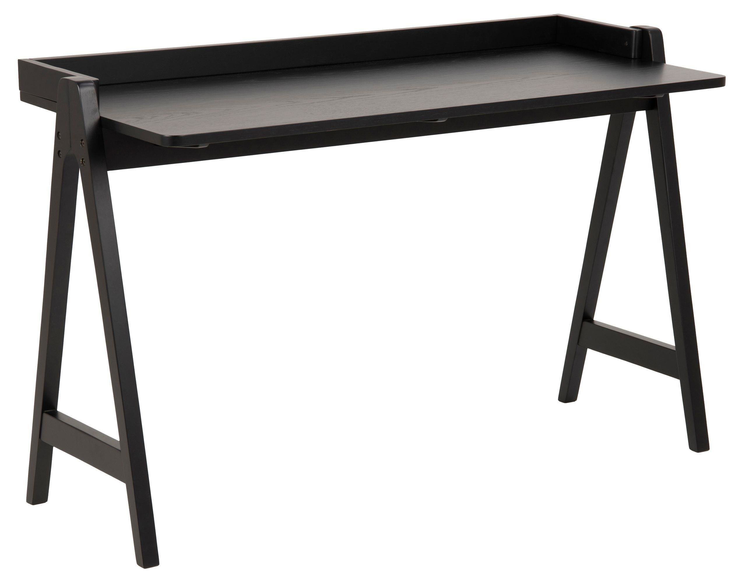 Biurko wykonane z drewna kauczukowego oraz płyty MDF z blatem w kształcie prostokąta w kolorze czarnym.