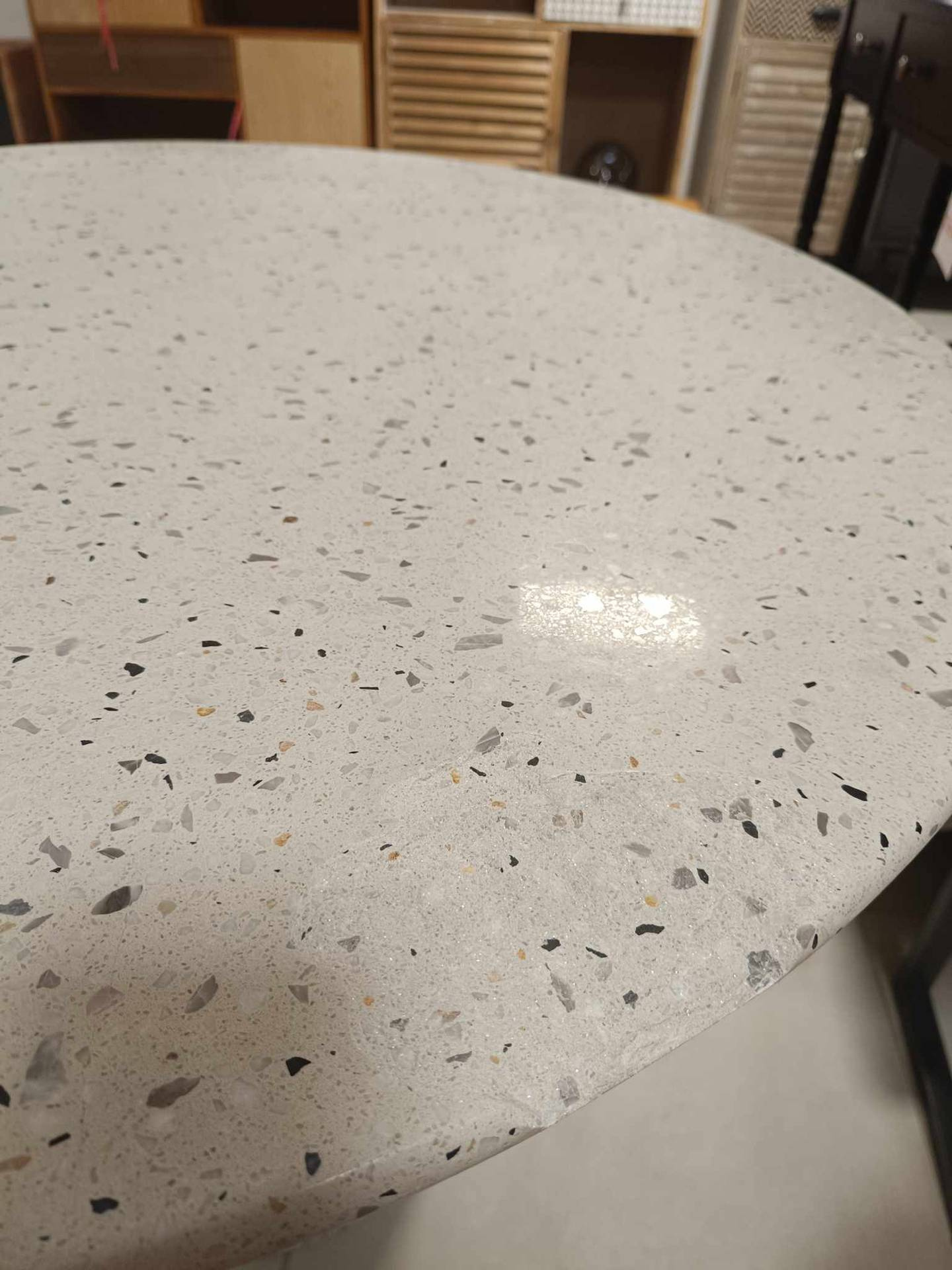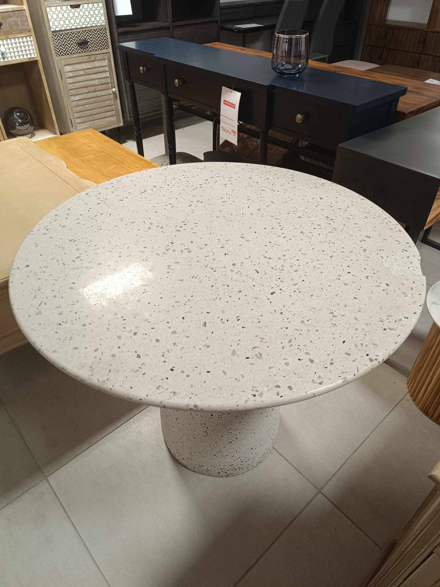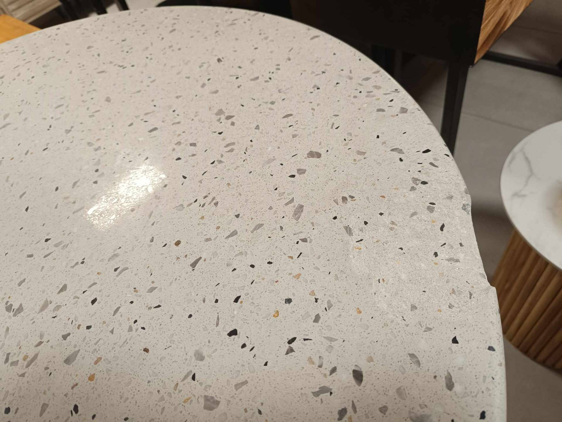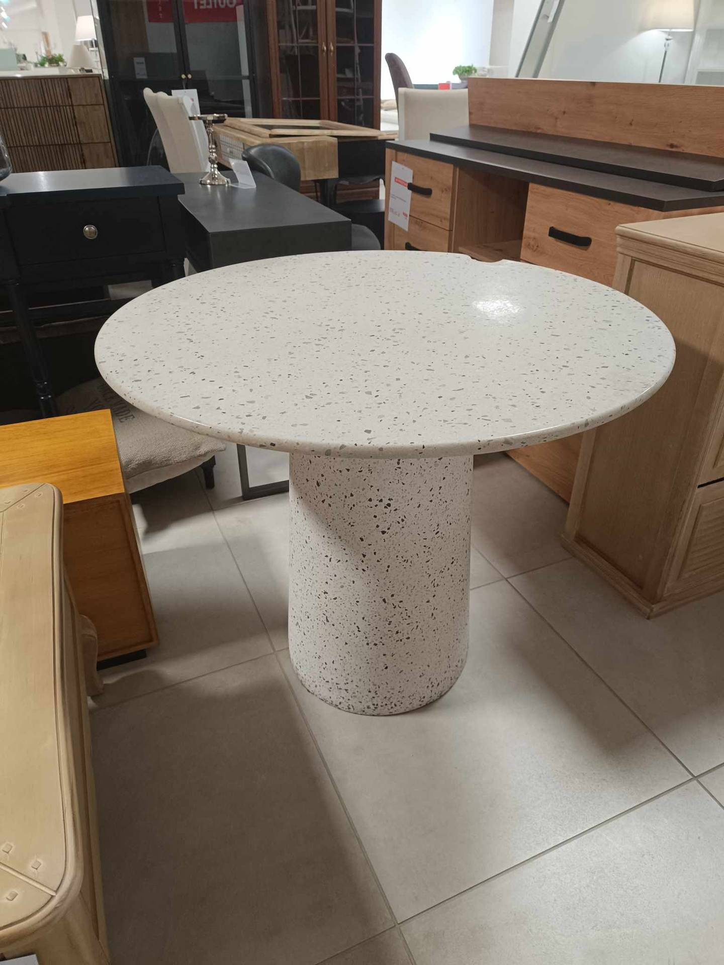 • Oryginalny stół wykonany z naturalnego białego kamienia. Posiada uszkodzenie blatu, towar poekspozycyjny.