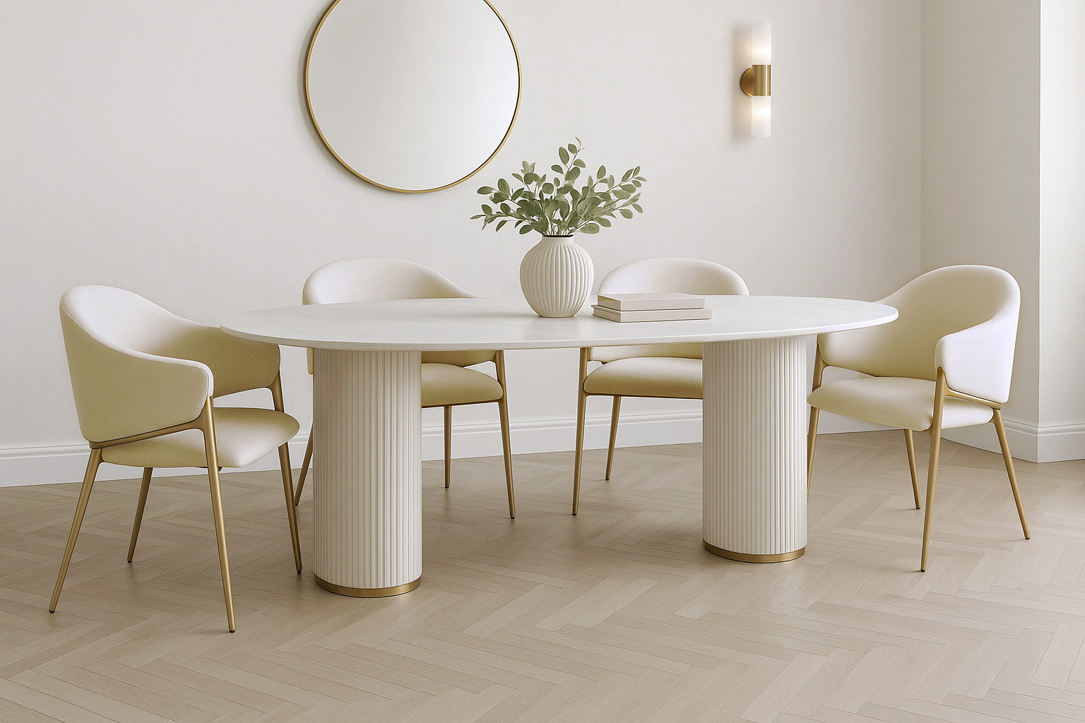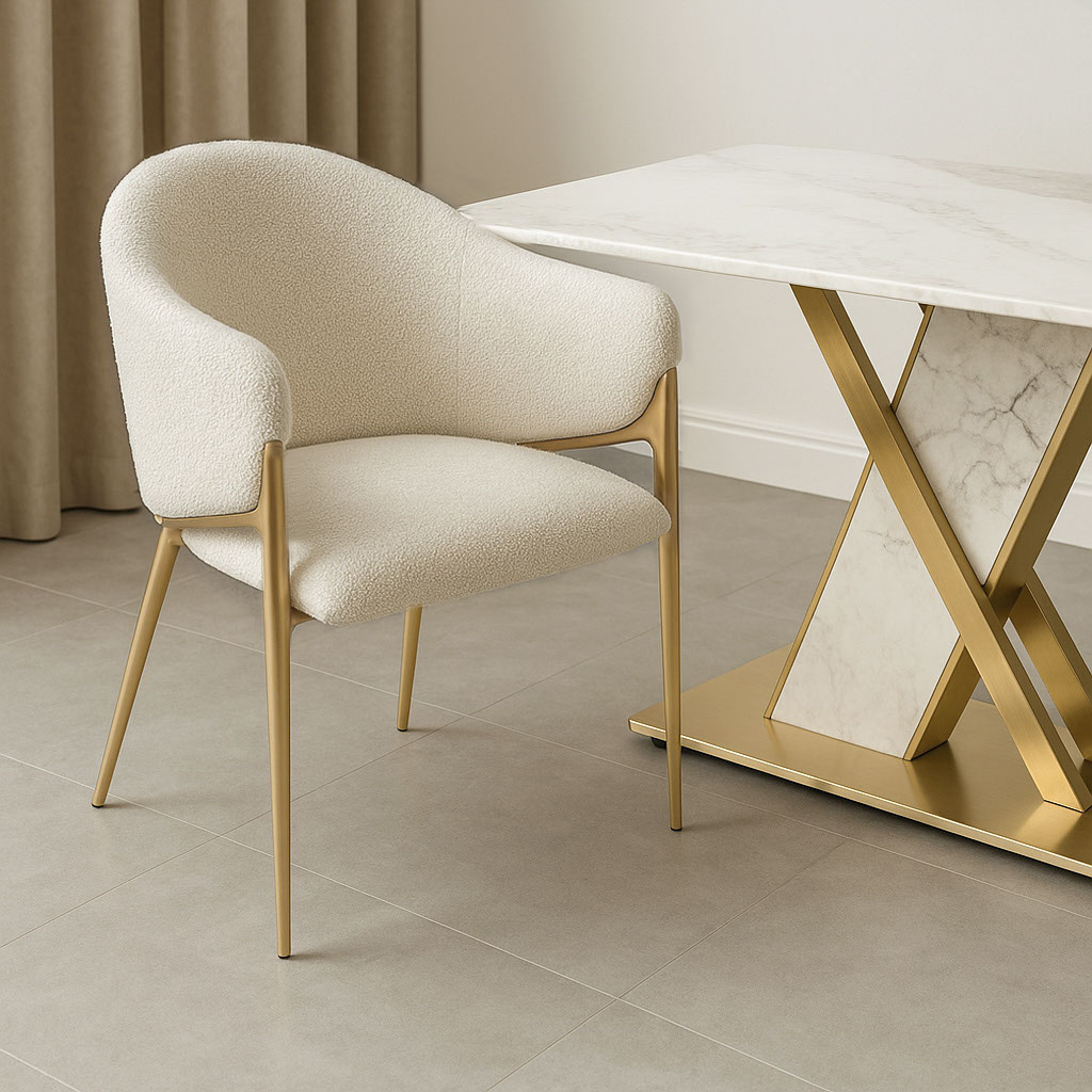 Krzesło Modig M5-1 marki Livinhill to prawdziwy klejnot w stylu glamour. Miękka tkanina boucle w perłowej bieli i złote, szczotkowane nogi ze stali nierdzewnej dodają elegancji. Idealne do jadalni, wprowadzi szyk i wyjątkowy styl do każdego wnętrza.