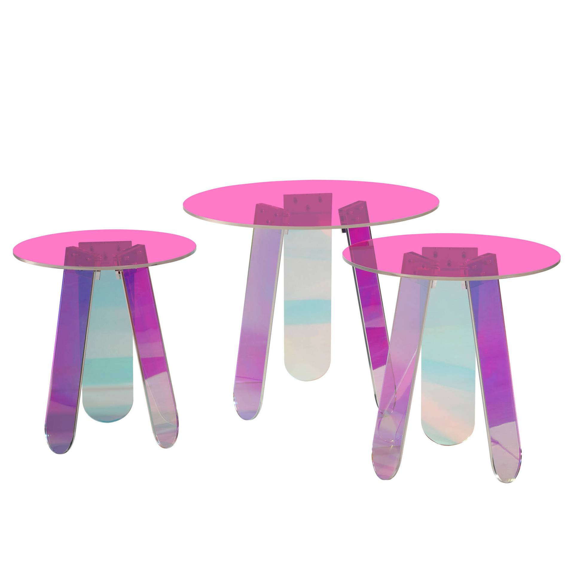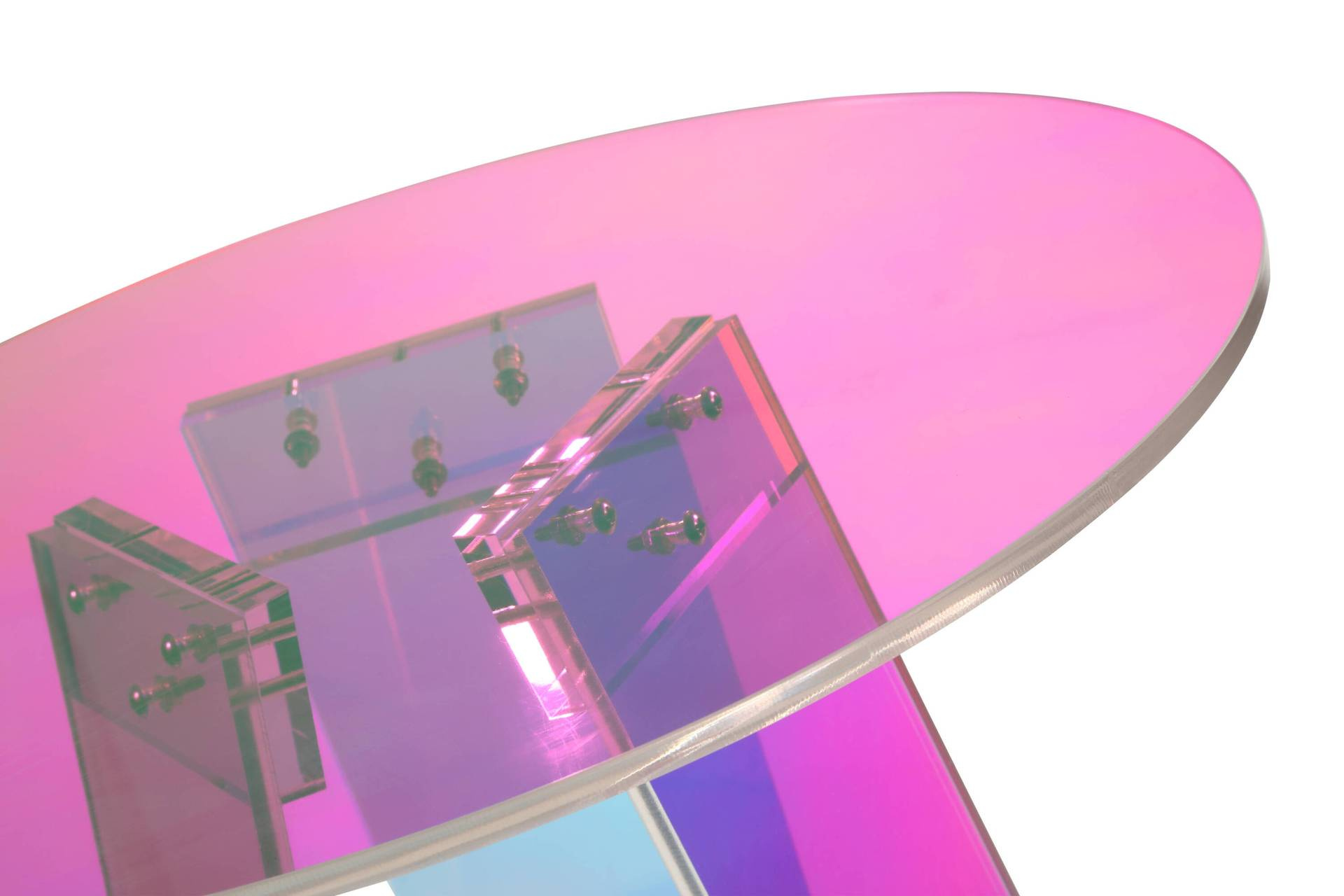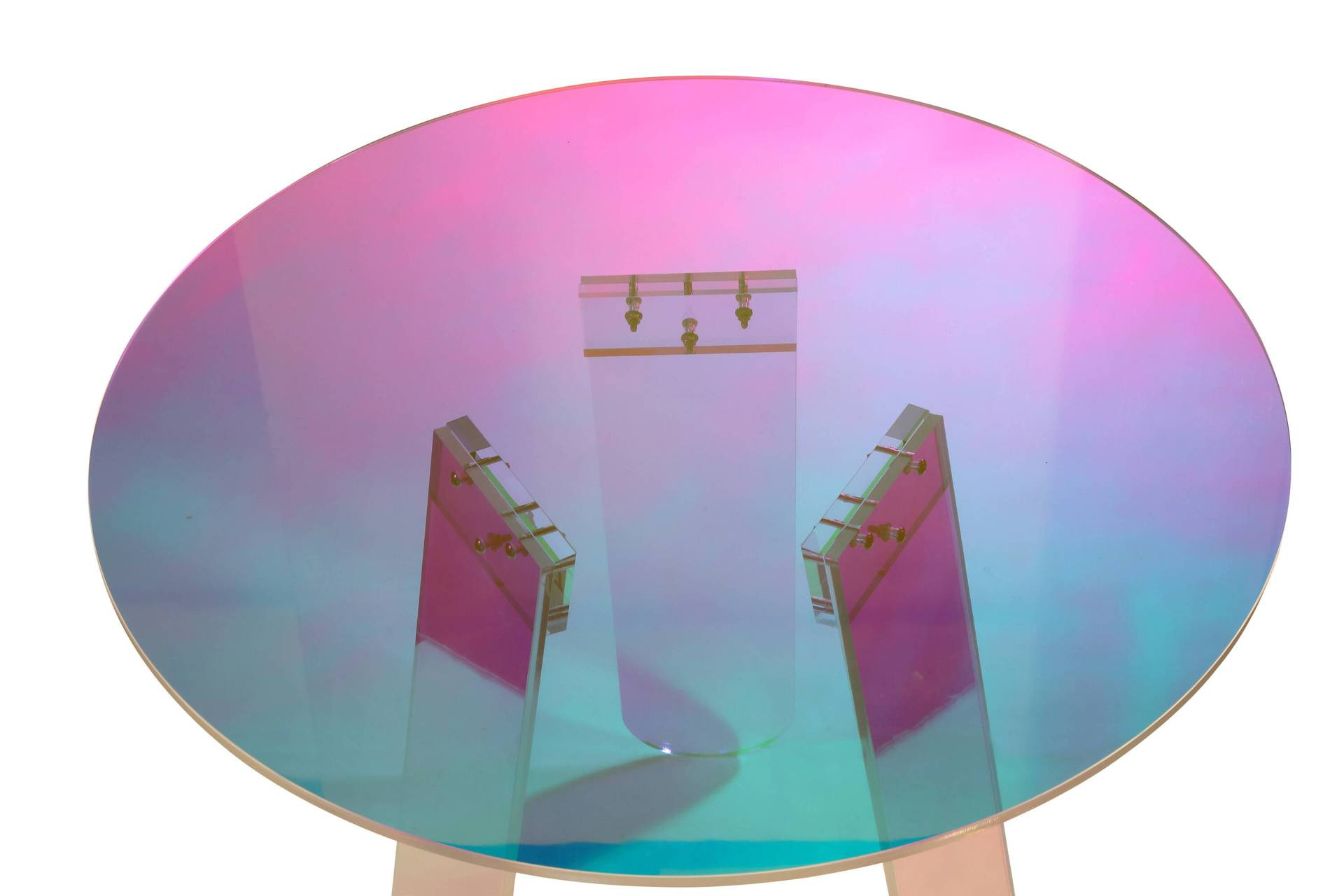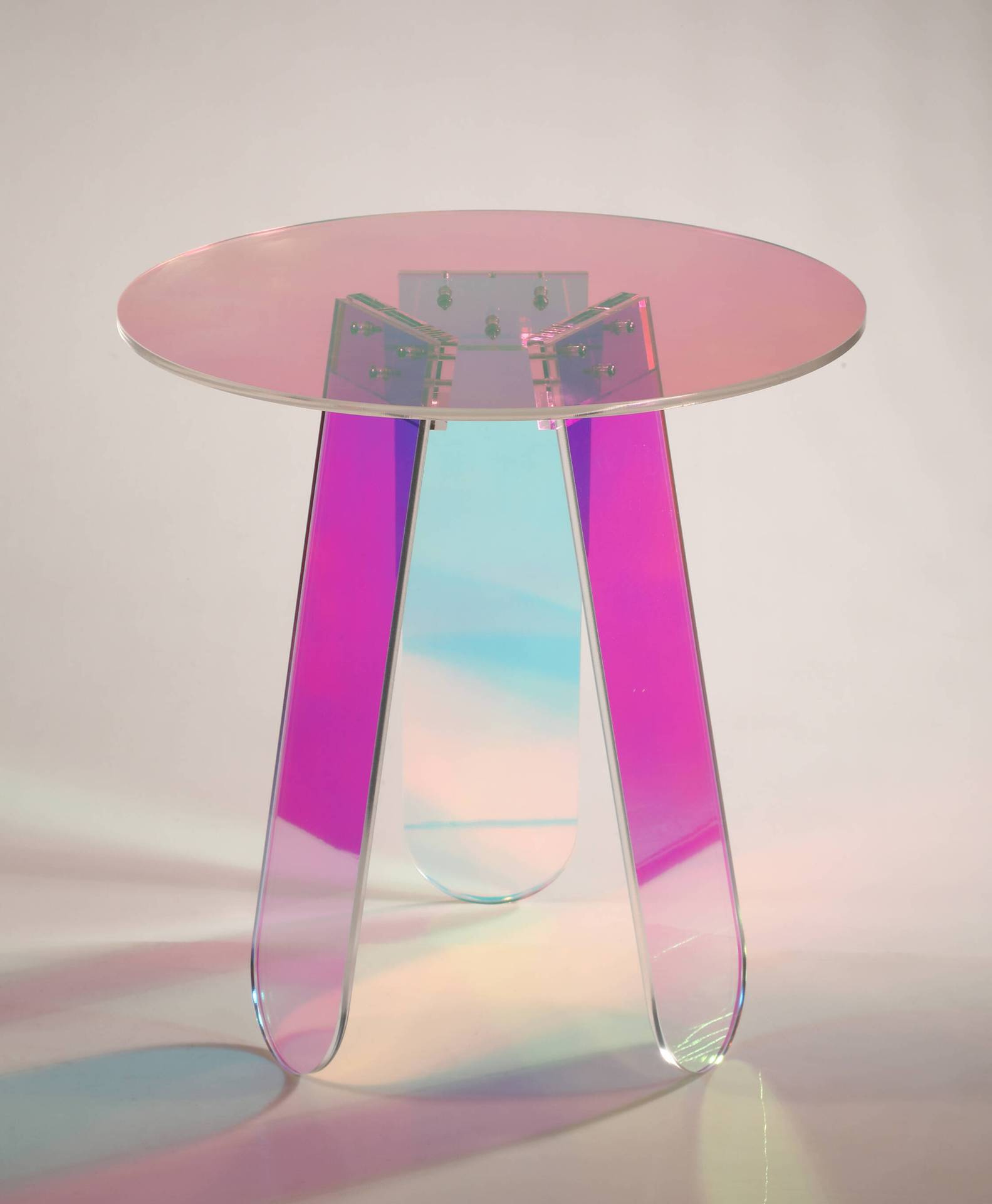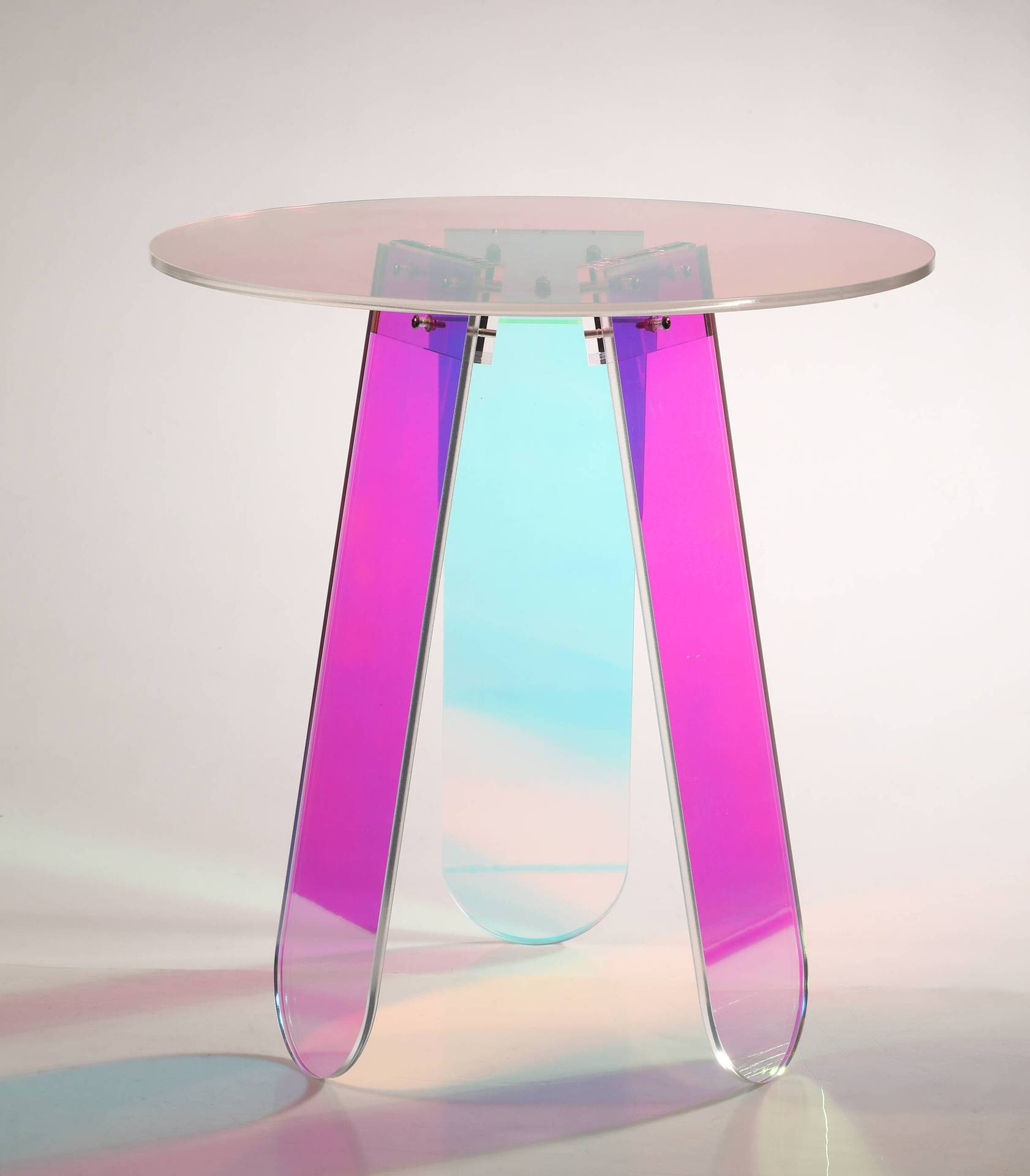 Oryginalny stolik wykonany z przezroczystego akrylu. W zależności od padania światła widoczne są różne efekty kolorystyczne. Prosty kształt i lekka konstrukcja sprawią, iż stolik można dopasować do każdego wnętrza.