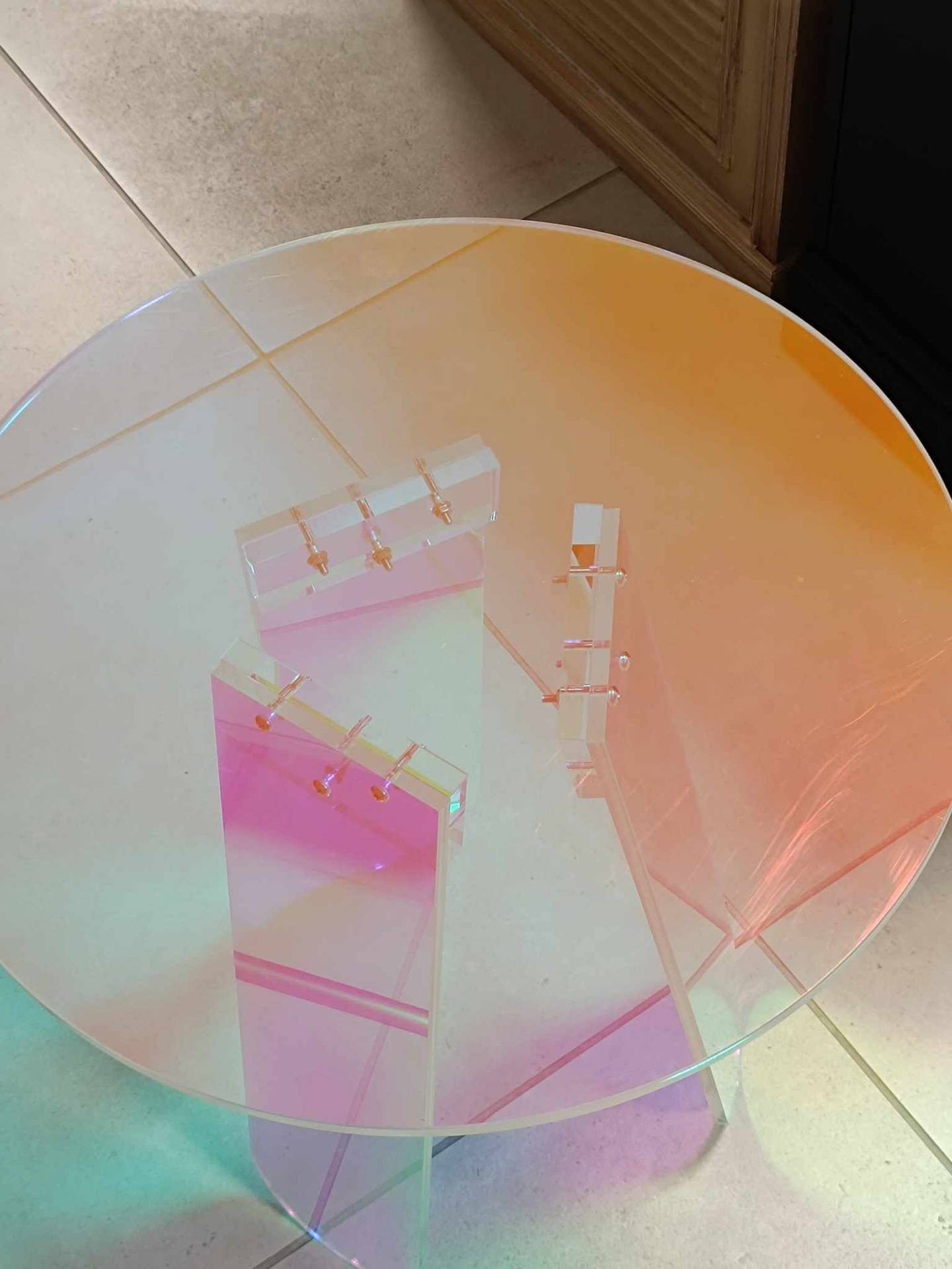 - Oryginalny stolik zrobiony z przezroczystego akrylu. W zależności od padania światła widoczne są różne efekty kolorystyczne.