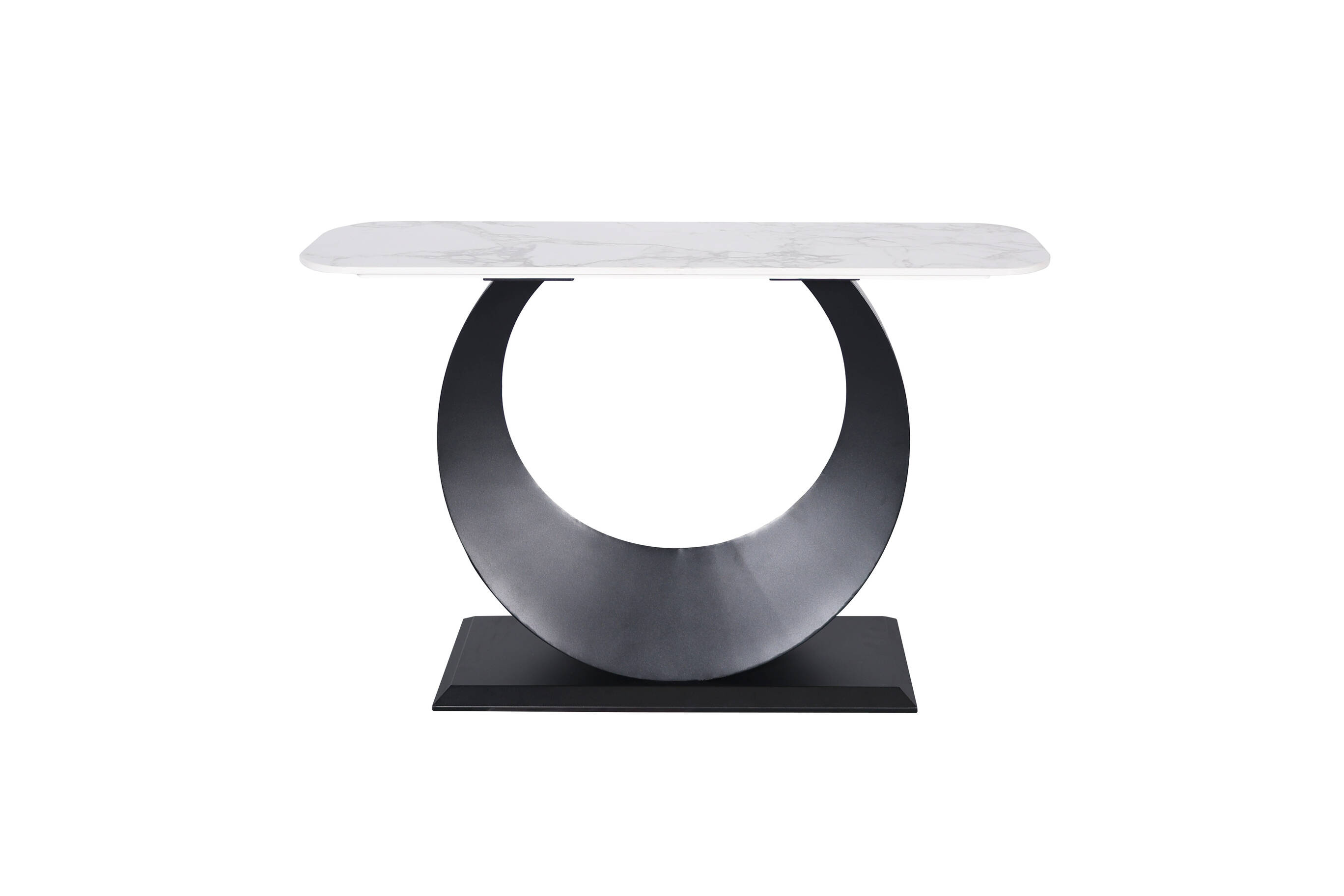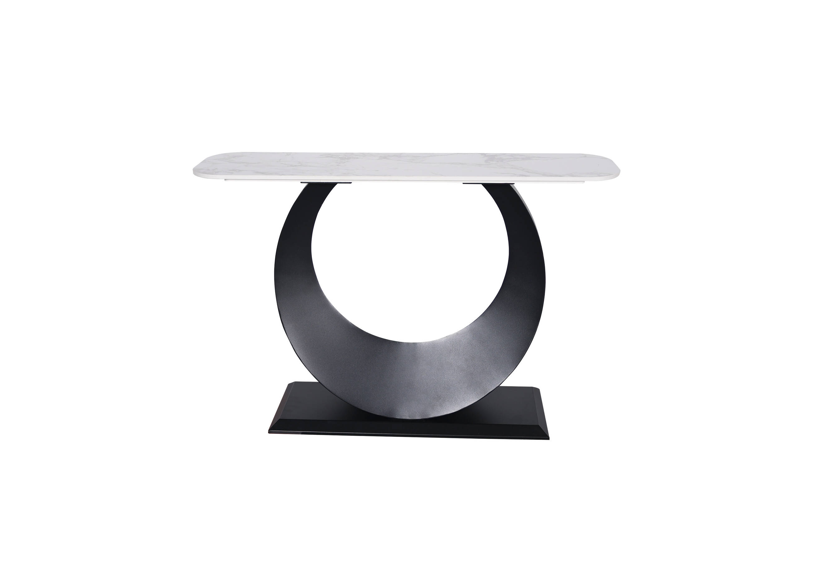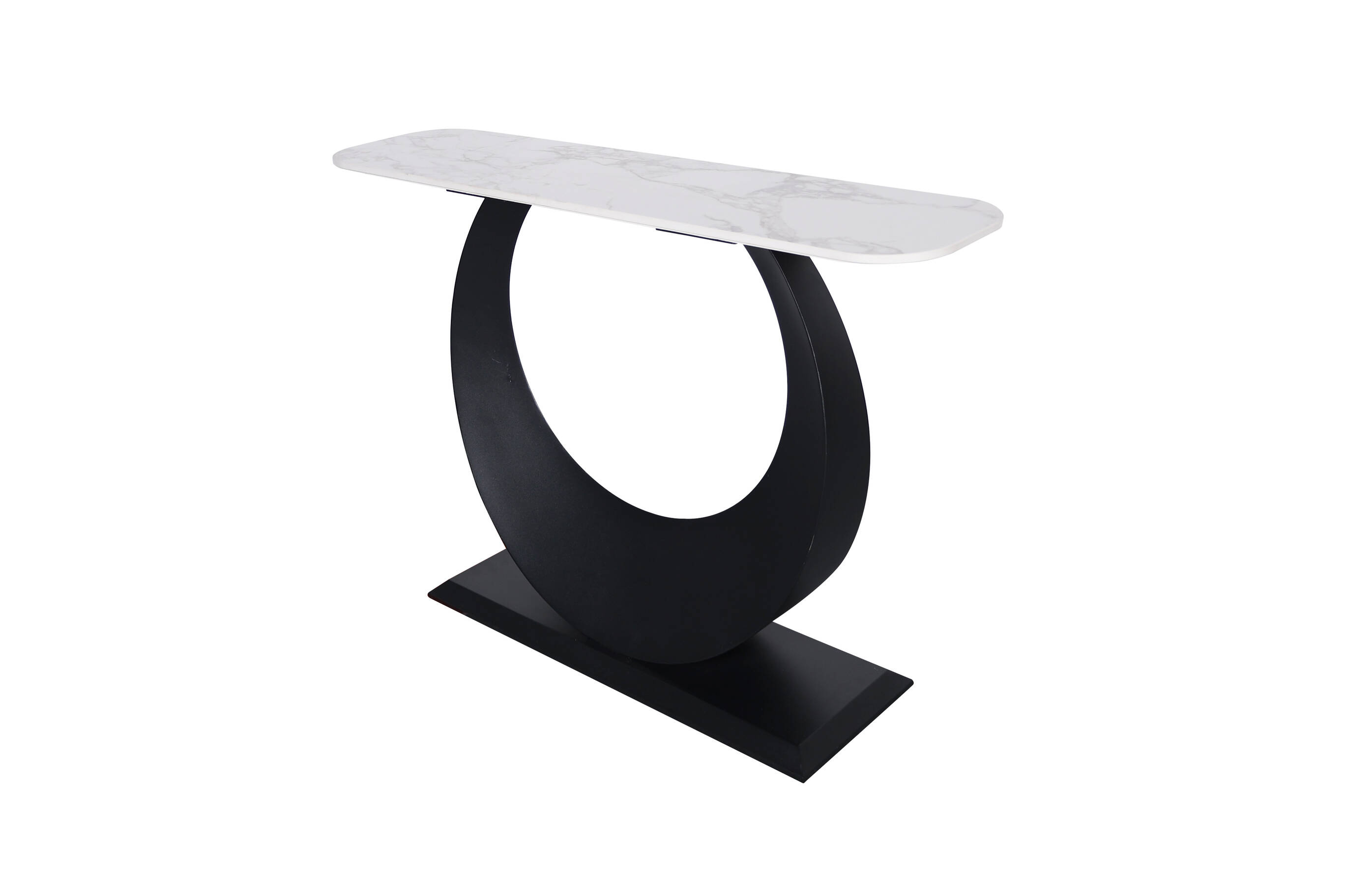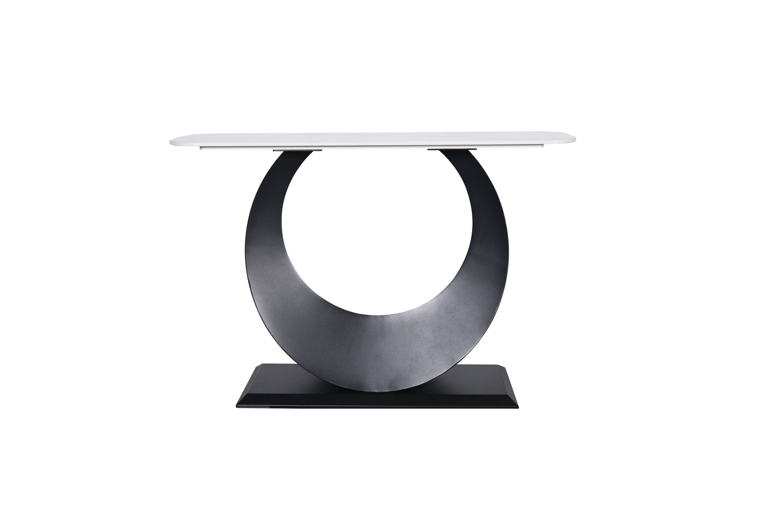 Niepowtarzalna konsola wykonana z żelaza w kolorze czarnym z białym blatem imitującym marmur. Konsola w kształcie księżyca osadzonego na prostokątnej podstawie z blatem o zaokrąglonych brzegach.