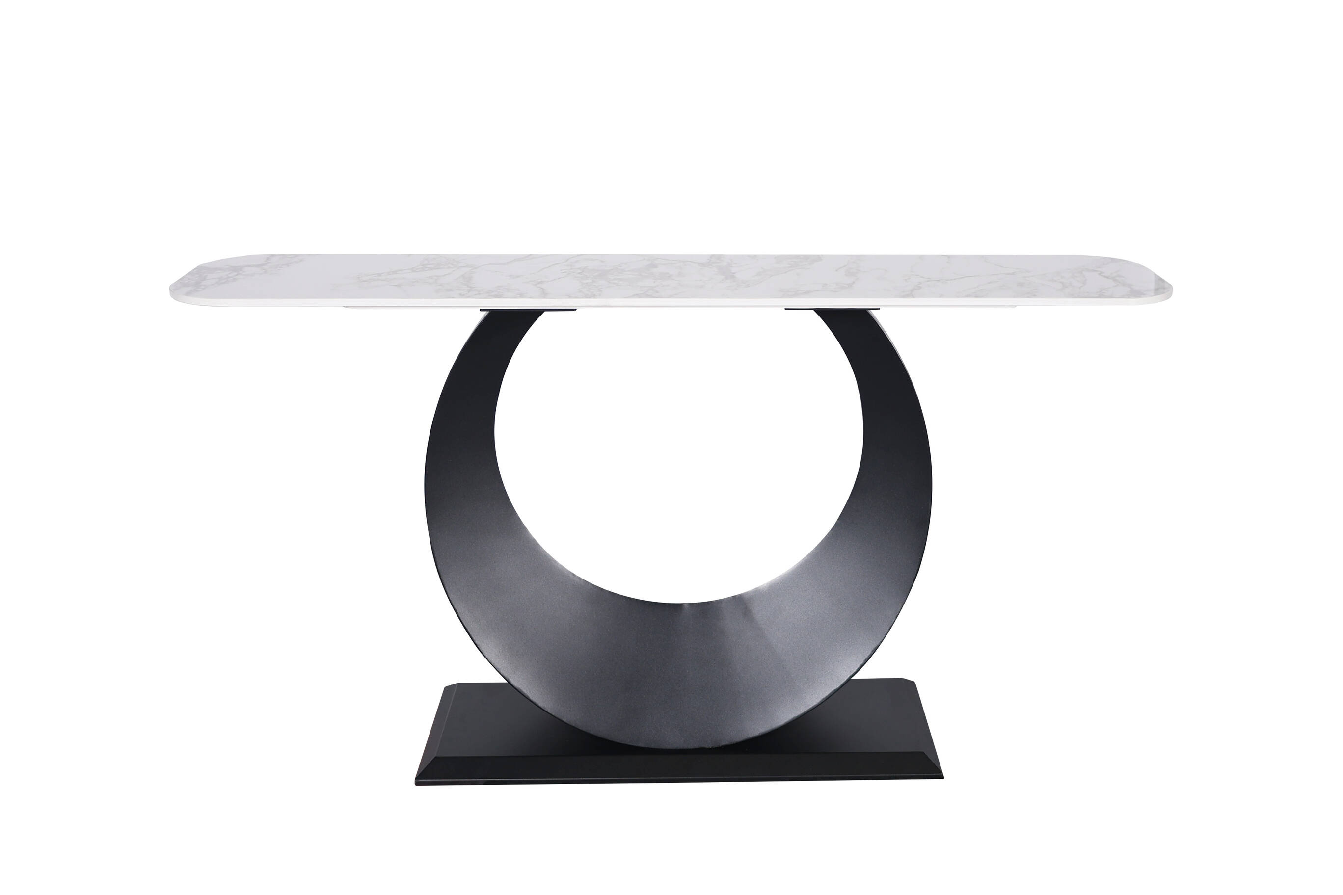 Nowoczesna konsola wykonana z żelaza w kolorze czarnym z białym blatem imitującym marmur. Konsola w kształcie księżyca osadzonego na prostokątnej podstawie z blatem, który posiada zaokrąglone brzegi.