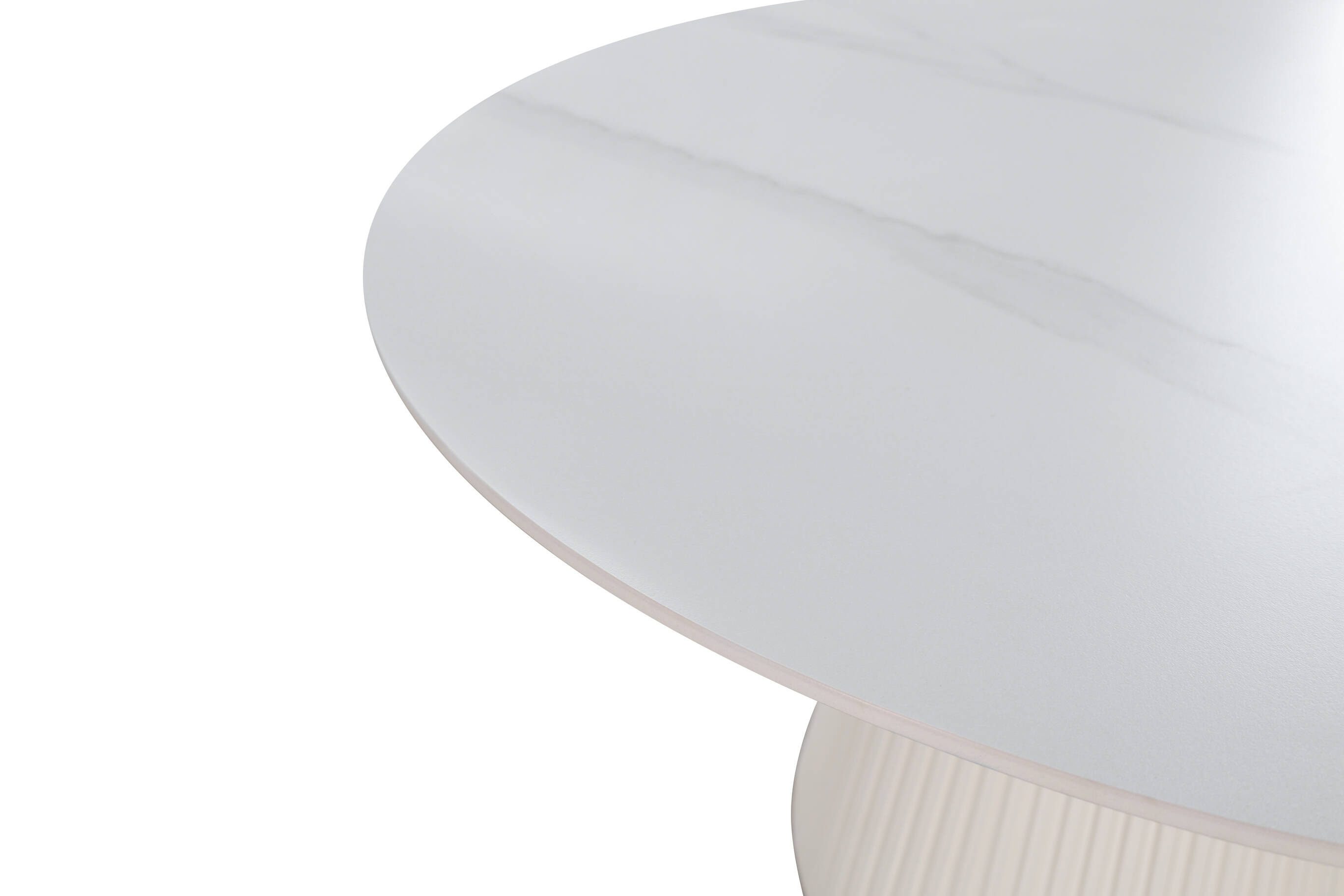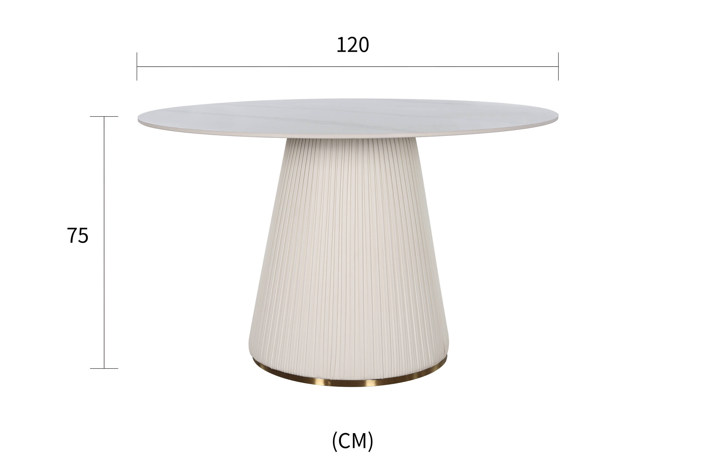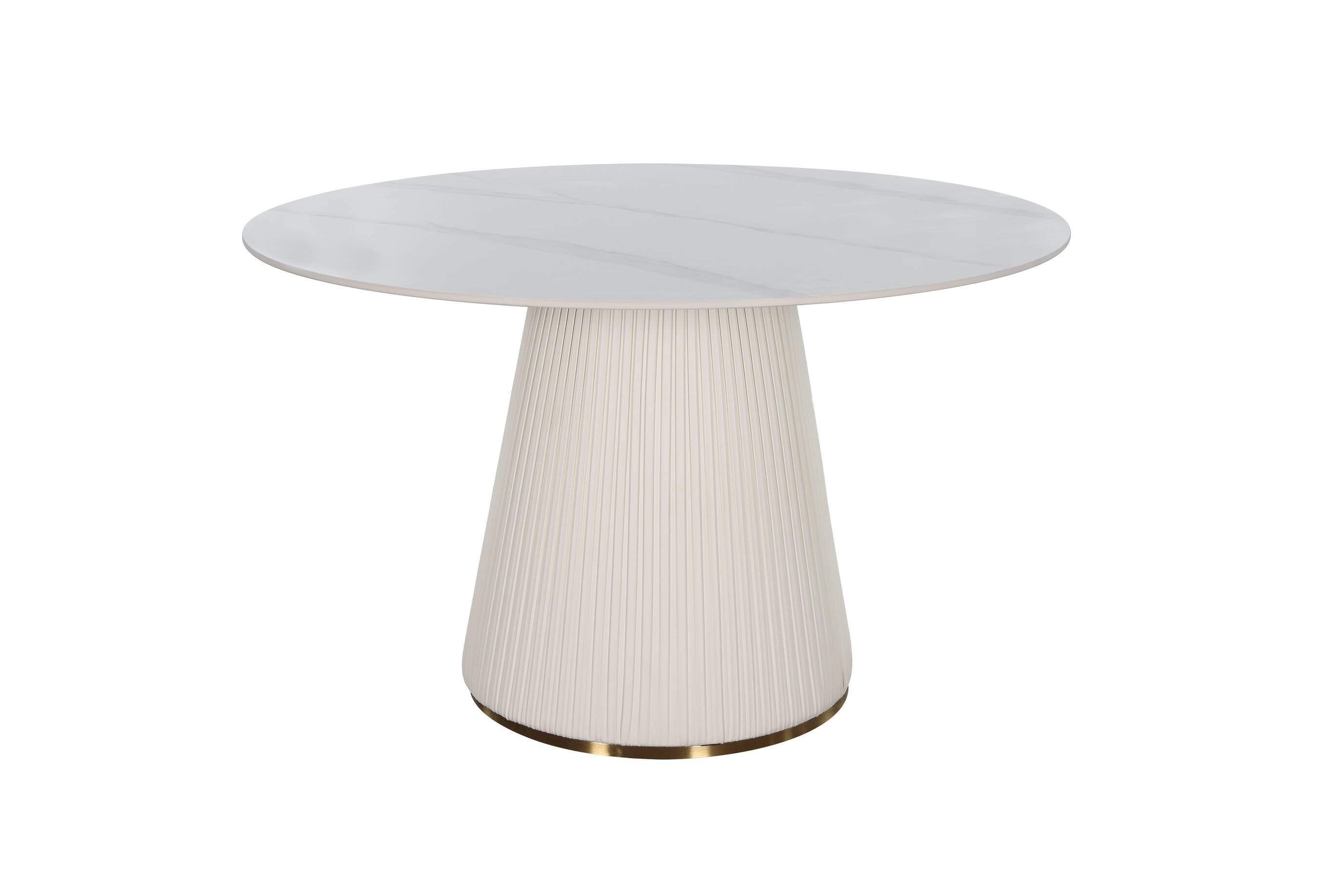 Nowoczesny stół ze stożkową podstawą, pokryty białą ekologiczną skórą tworzącą pionowe plisy, zakończone złotym akcentem. Okrągły biały blat jest imitacją naturalnego marmuru.